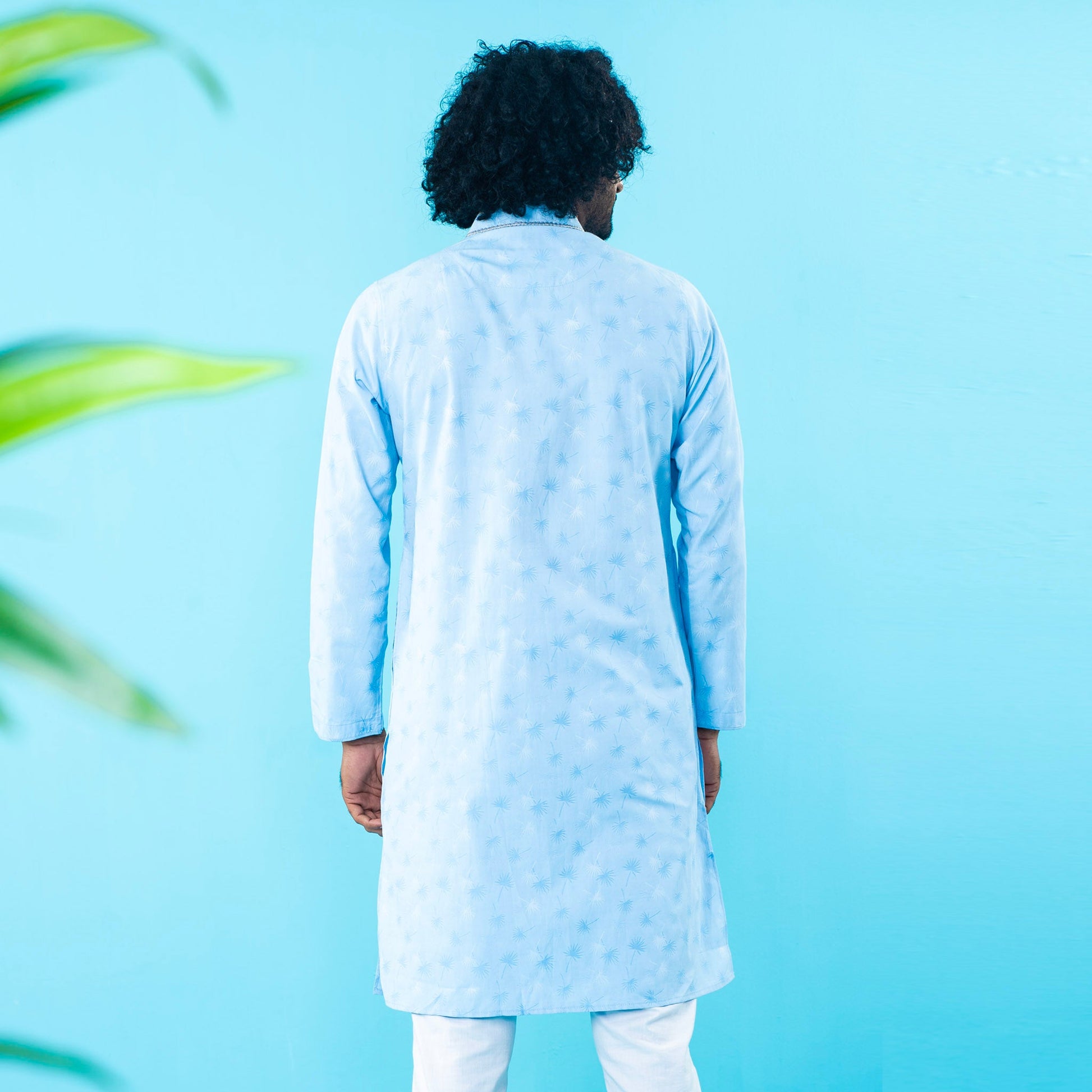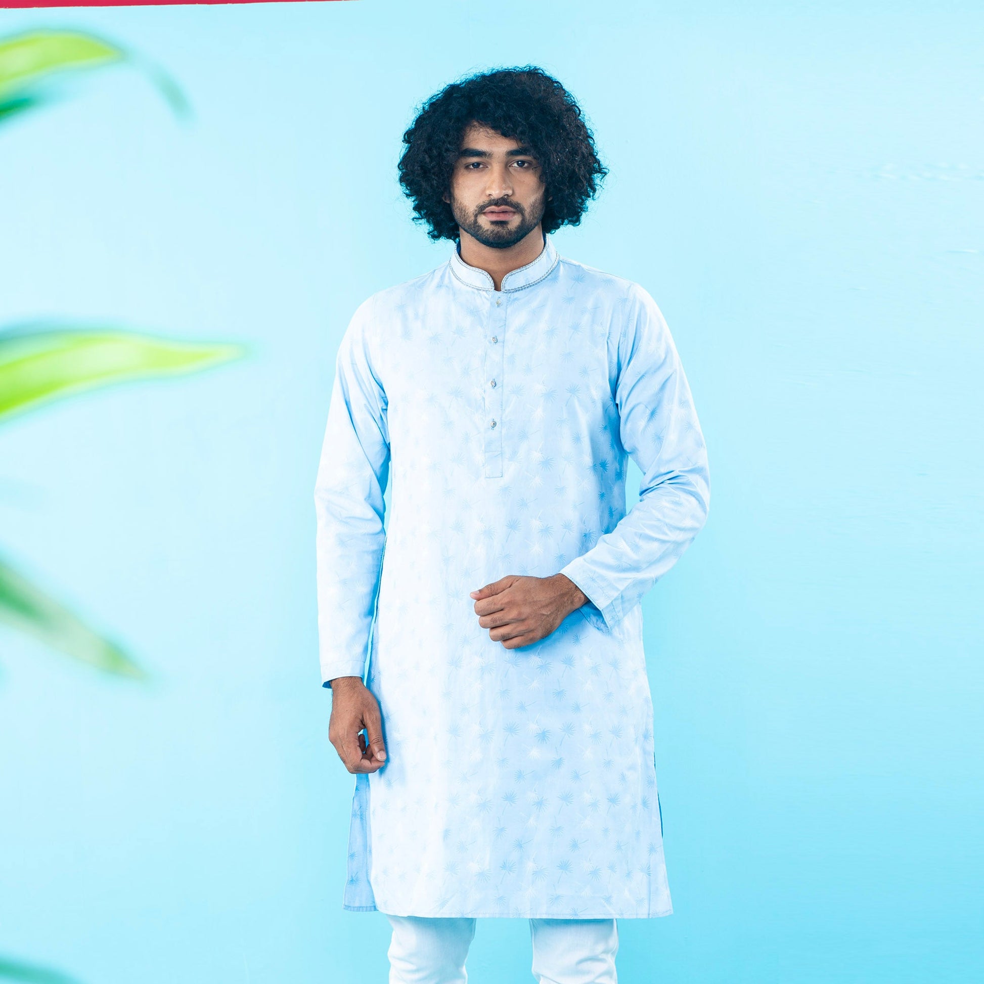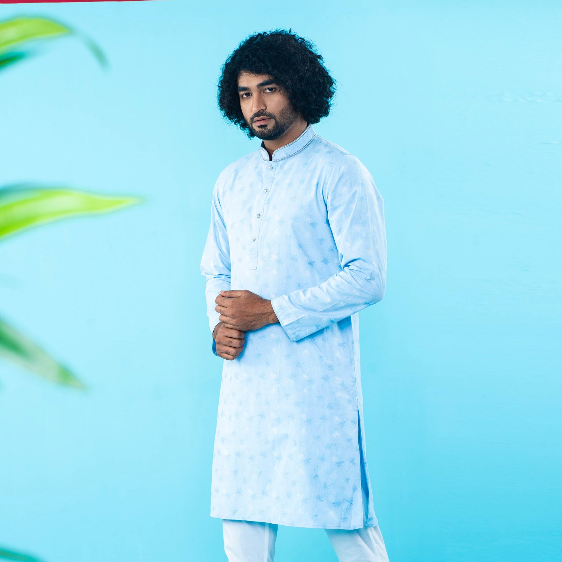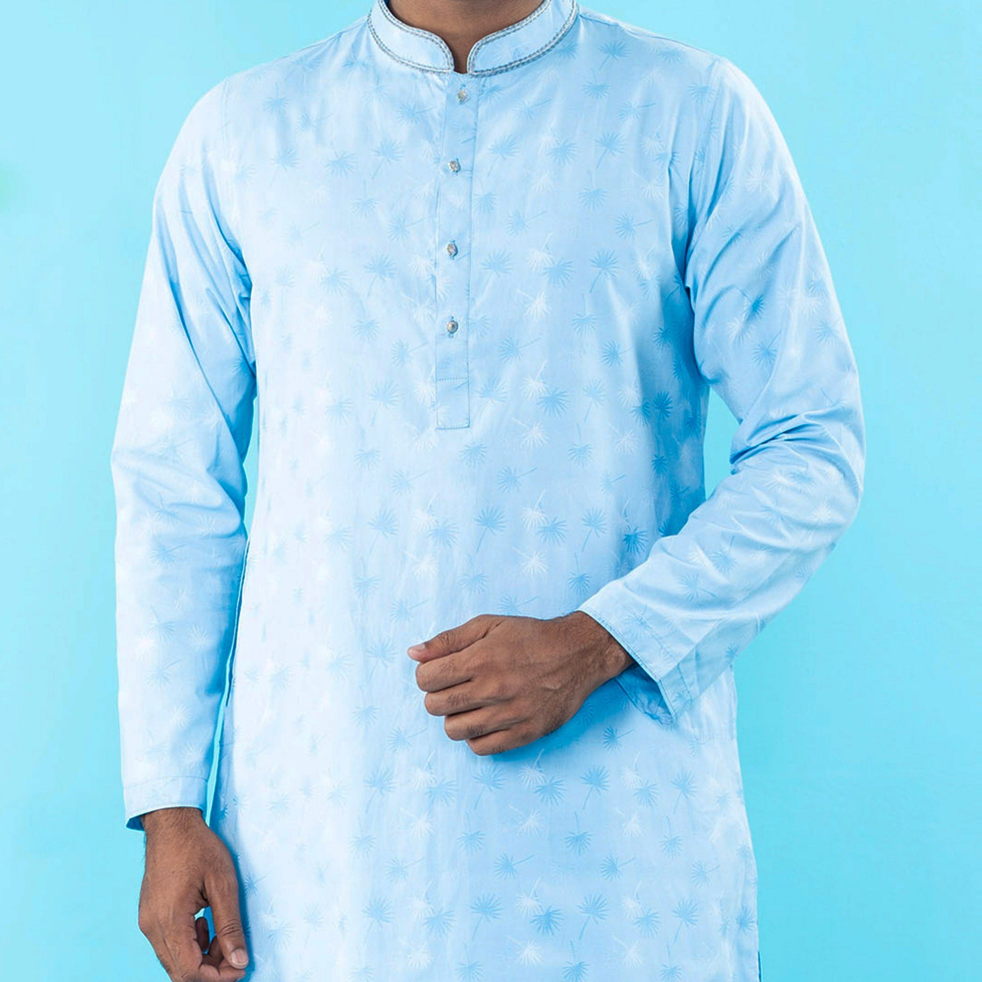 This men's blue panjabi is designed with intricate embroidery and classic metal buttons, offering a refined and traditional look. Made from a durable poly-cotton blend, it ensures a regular fit that balances comfort and style. Perfect for cultural events or special occasions, available in multiple sizes.