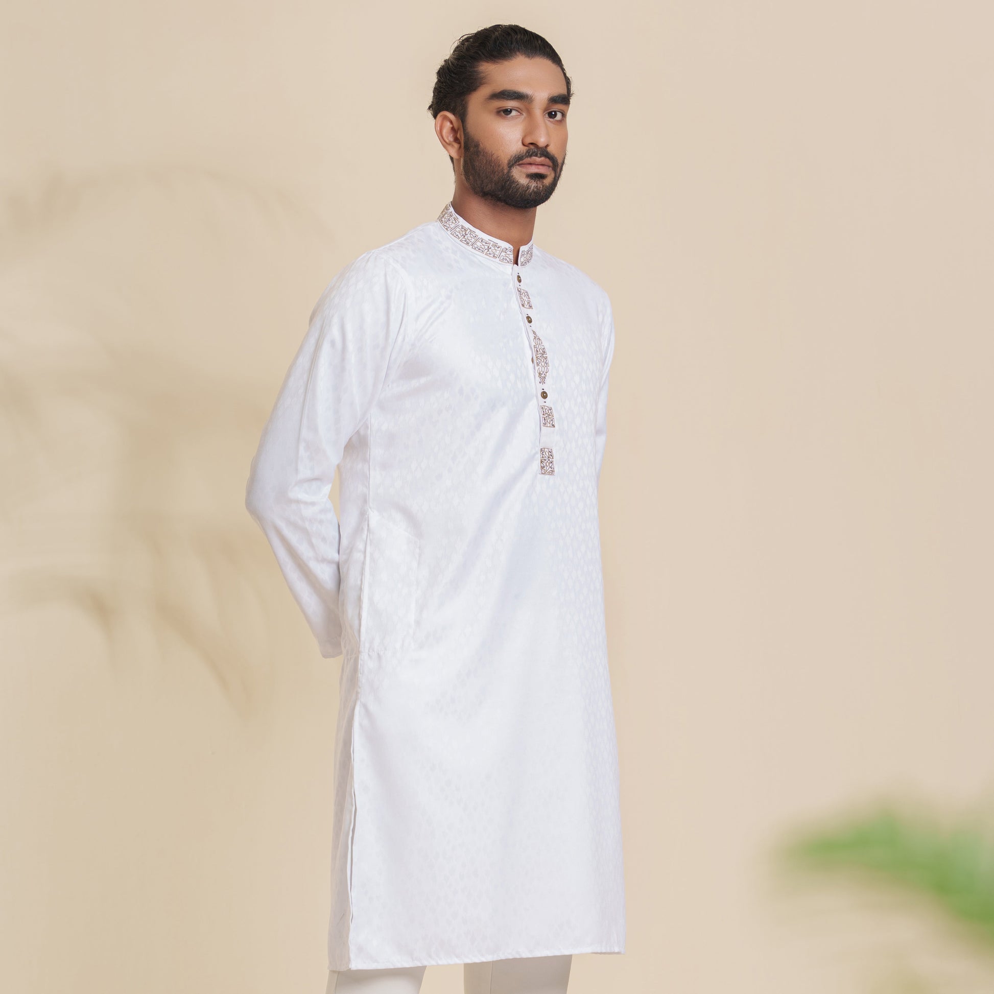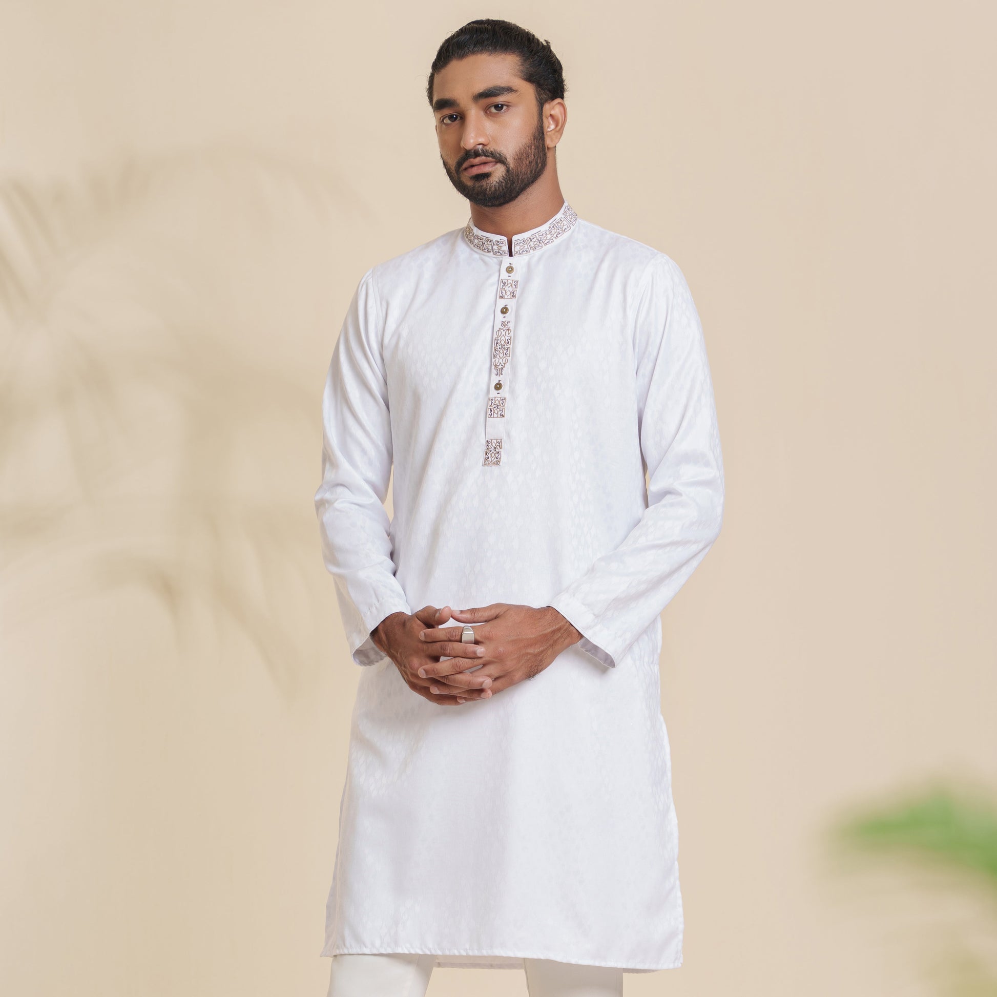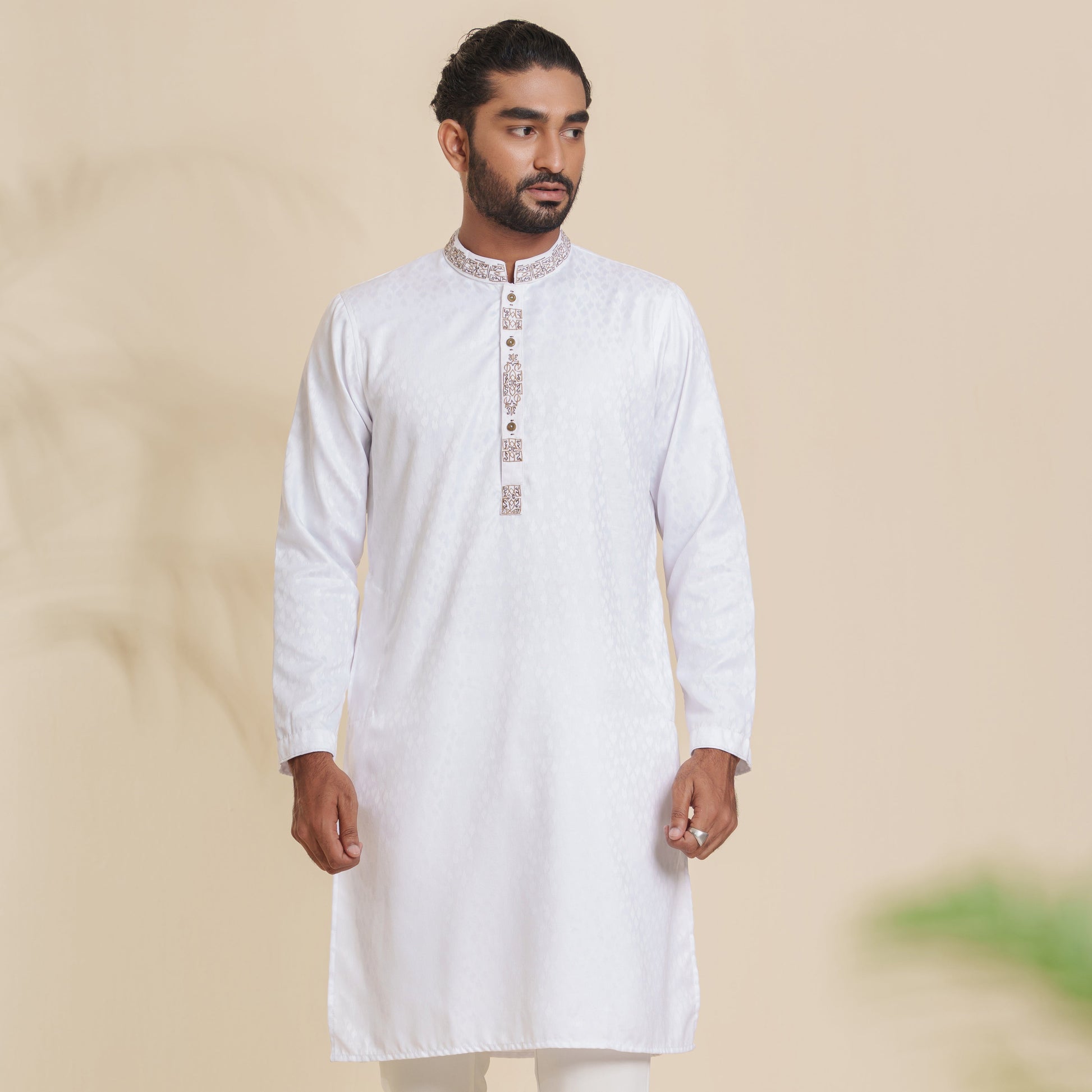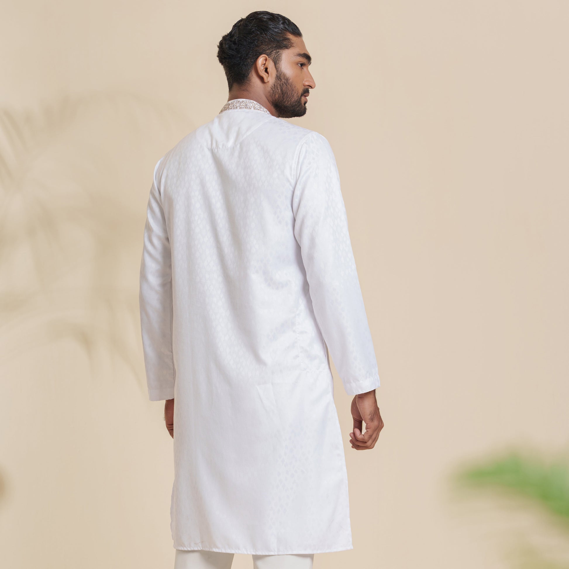 This men's white Panjabi is crafted from poly-blended jacquard, offering both style and comfort. It features detailed embroidery and a mandarin collar, giving it a refined, traditional look. The regular fit ensures ease of movement, making it ideal for festive occasions or casual wear. Perfect for men who appreciate elegance with a touch of tradition.