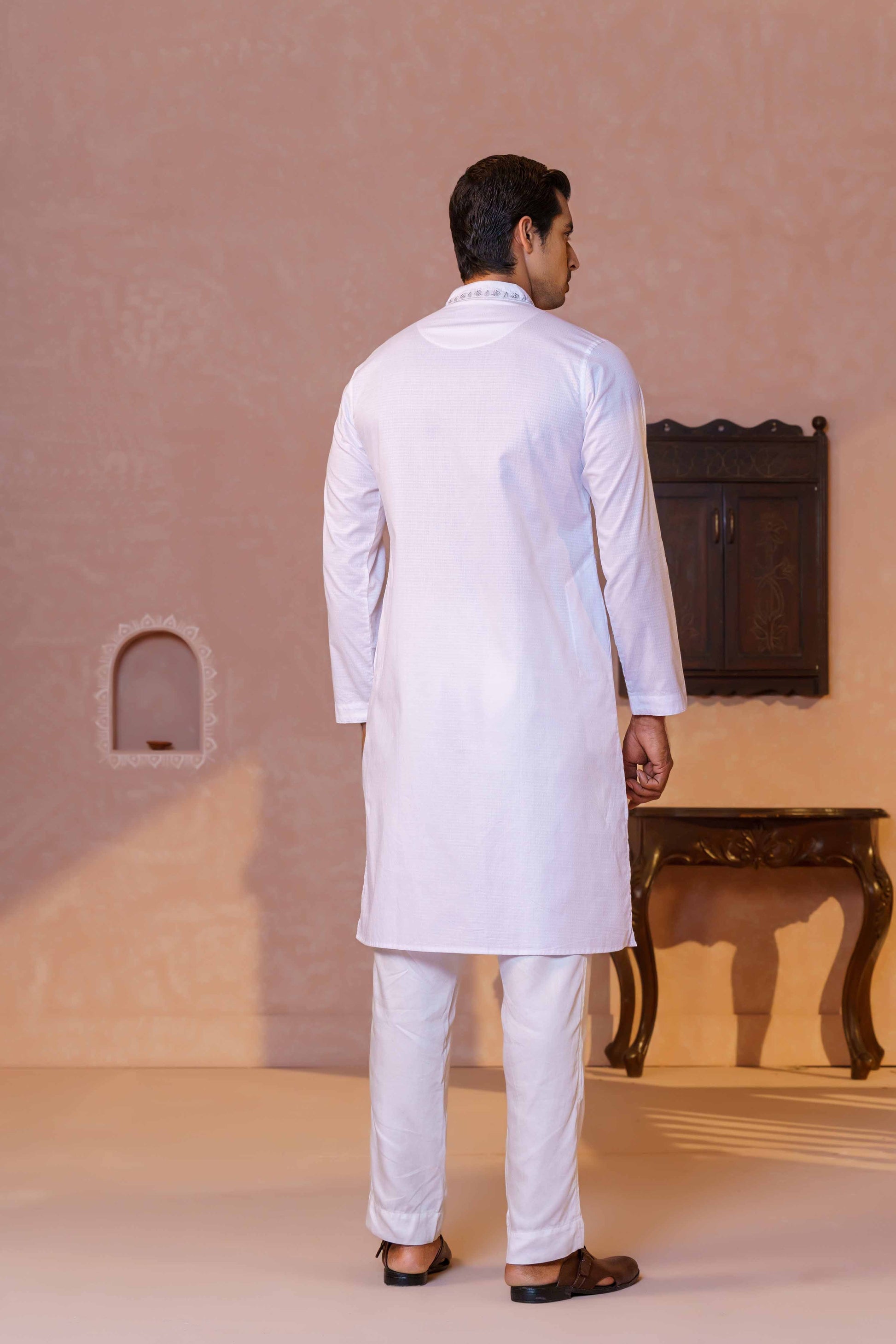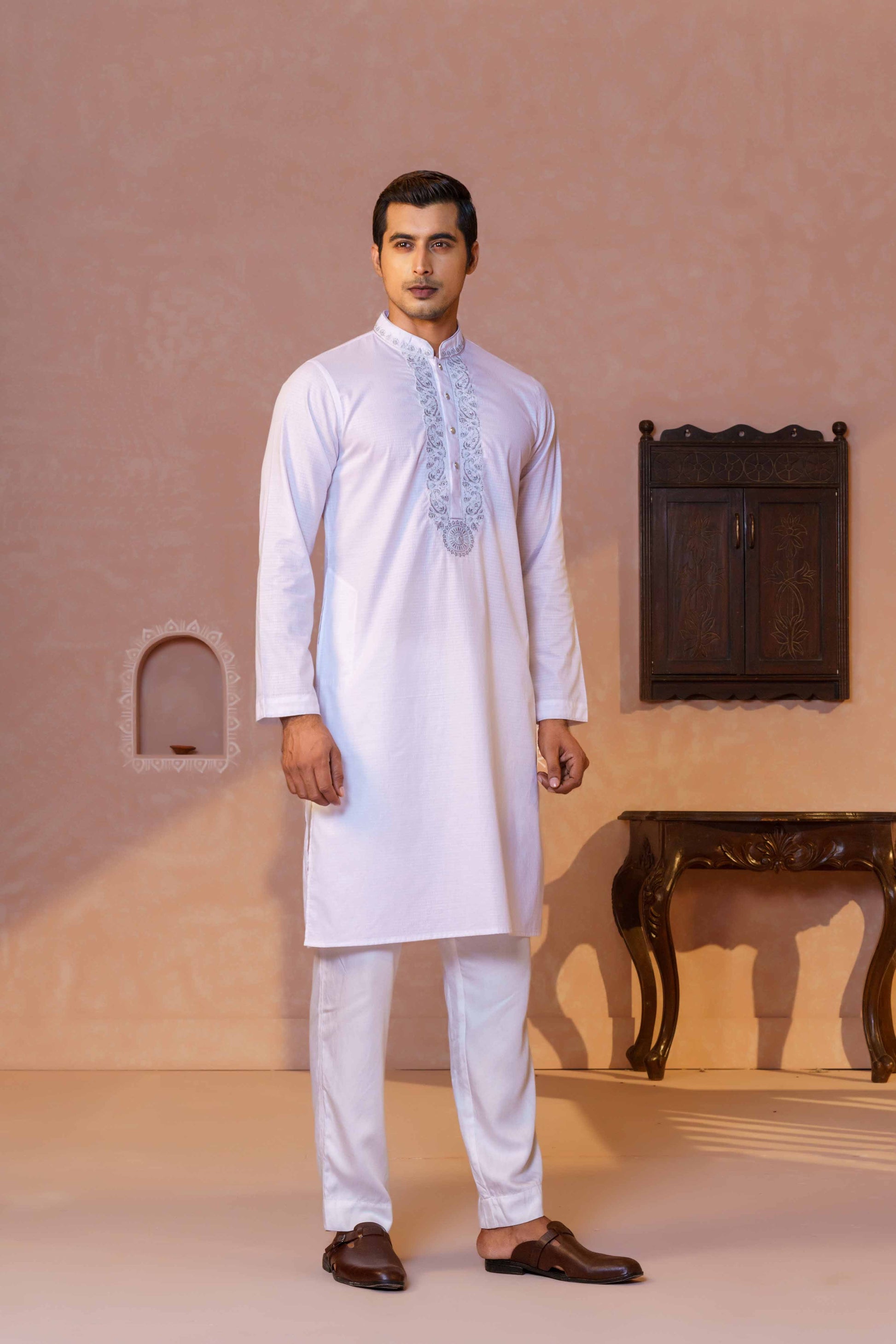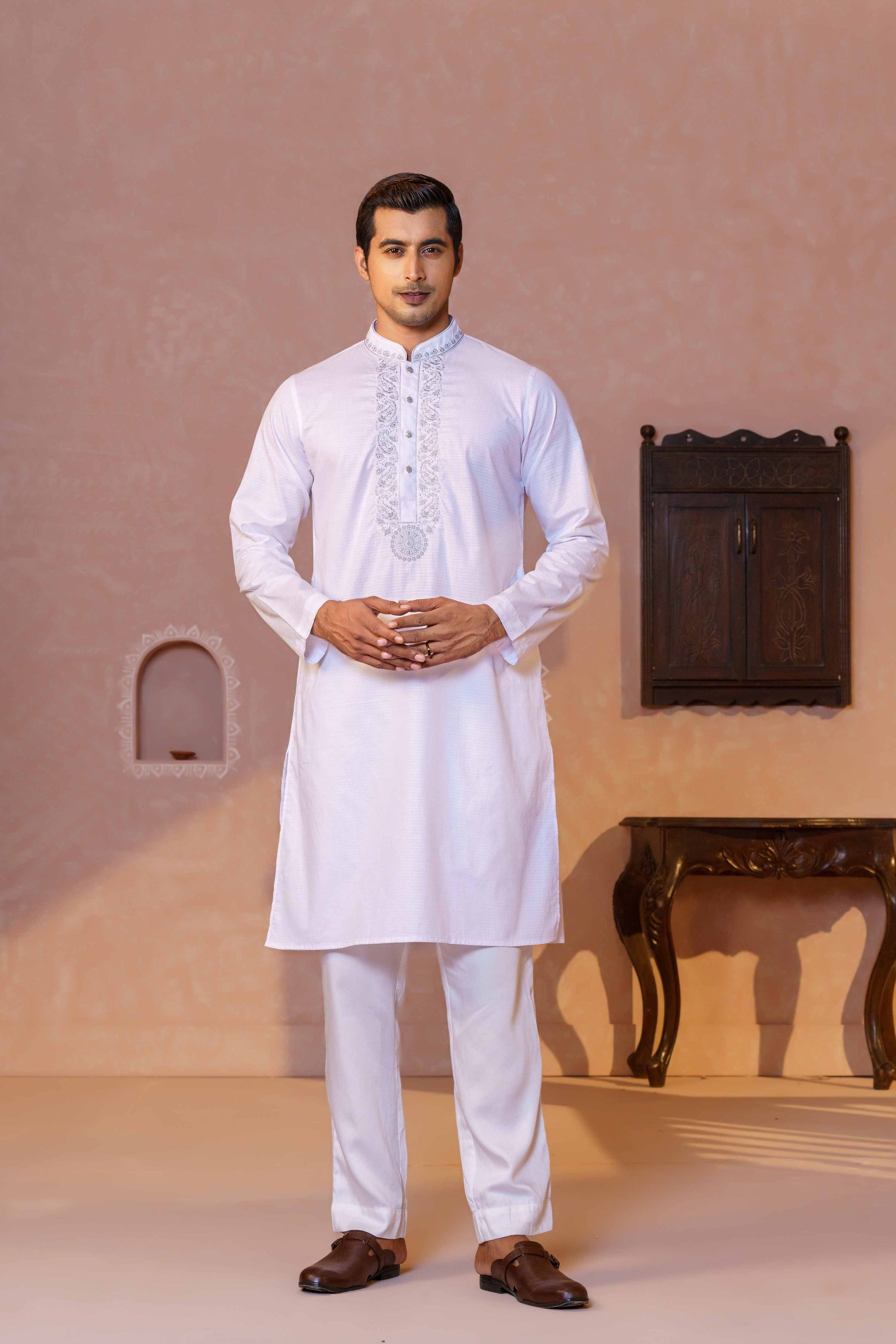 This Men's Embroidery Panjabi-White is sure to make you stand out. Featuring intricate embroidery detail, this traditional outfit is sure to make a statement. Perfect for special occasions or everyday wear.