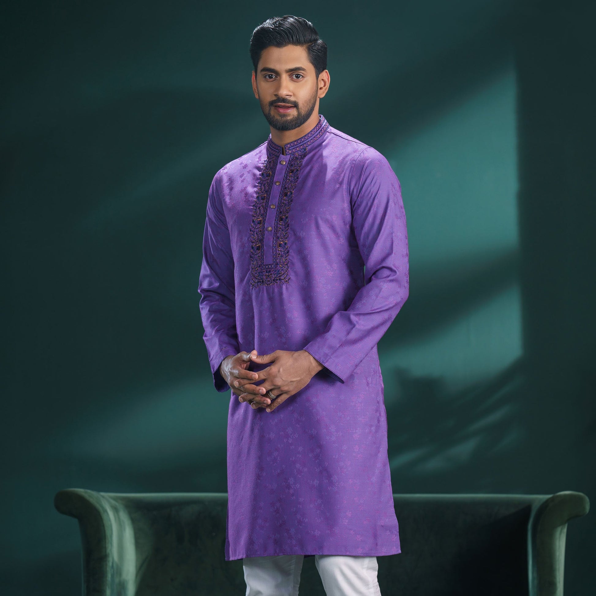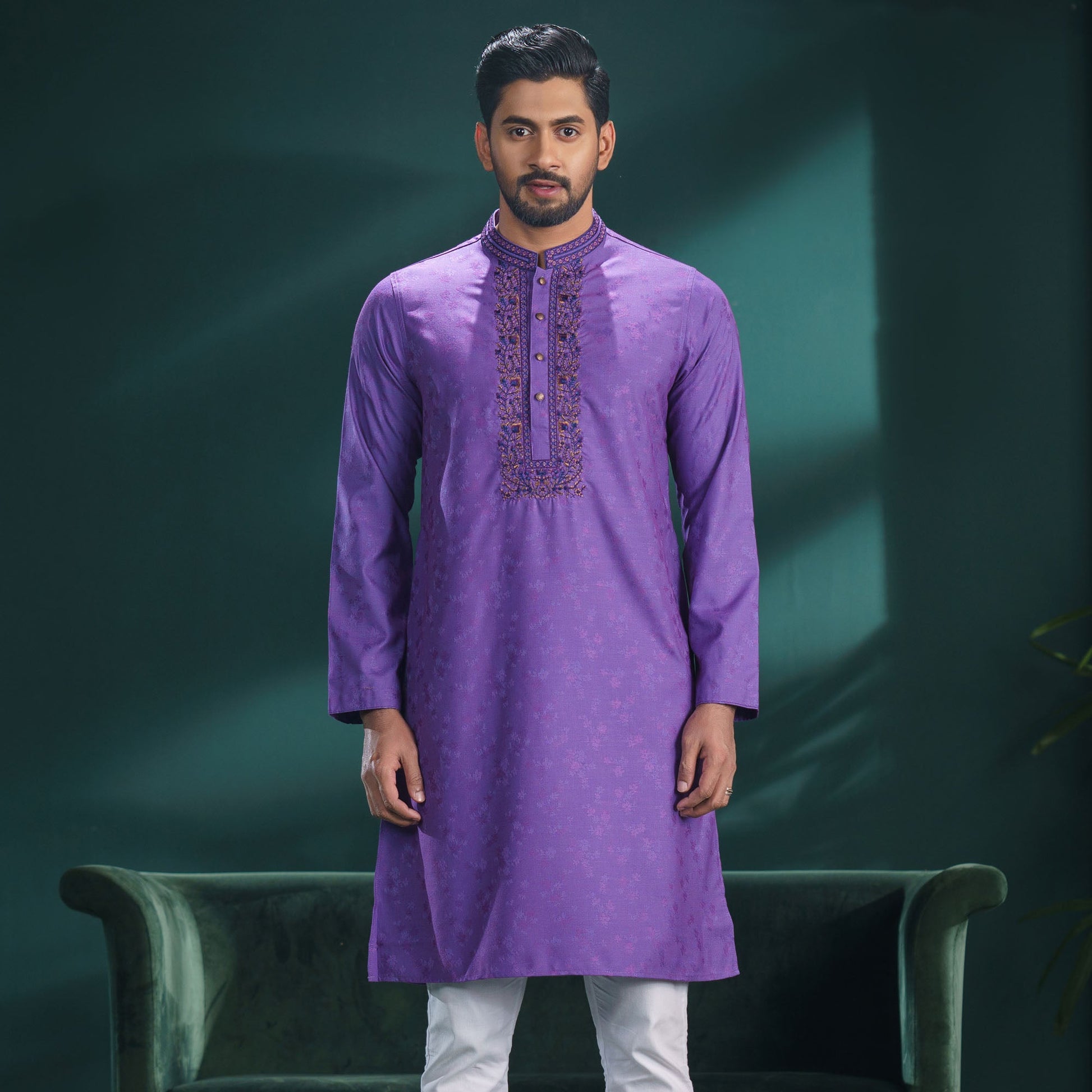 This Men's Violet Embroidered Panjabi features a mandarin collar with elegant embroidery on premium cotton jacquard fabric. The regular fit ensures comfort, while the vibrant violet color adds a striking and sophisticated touch. Ideal for special occasions and cultural events, it combines traditional charm with contemporary style.