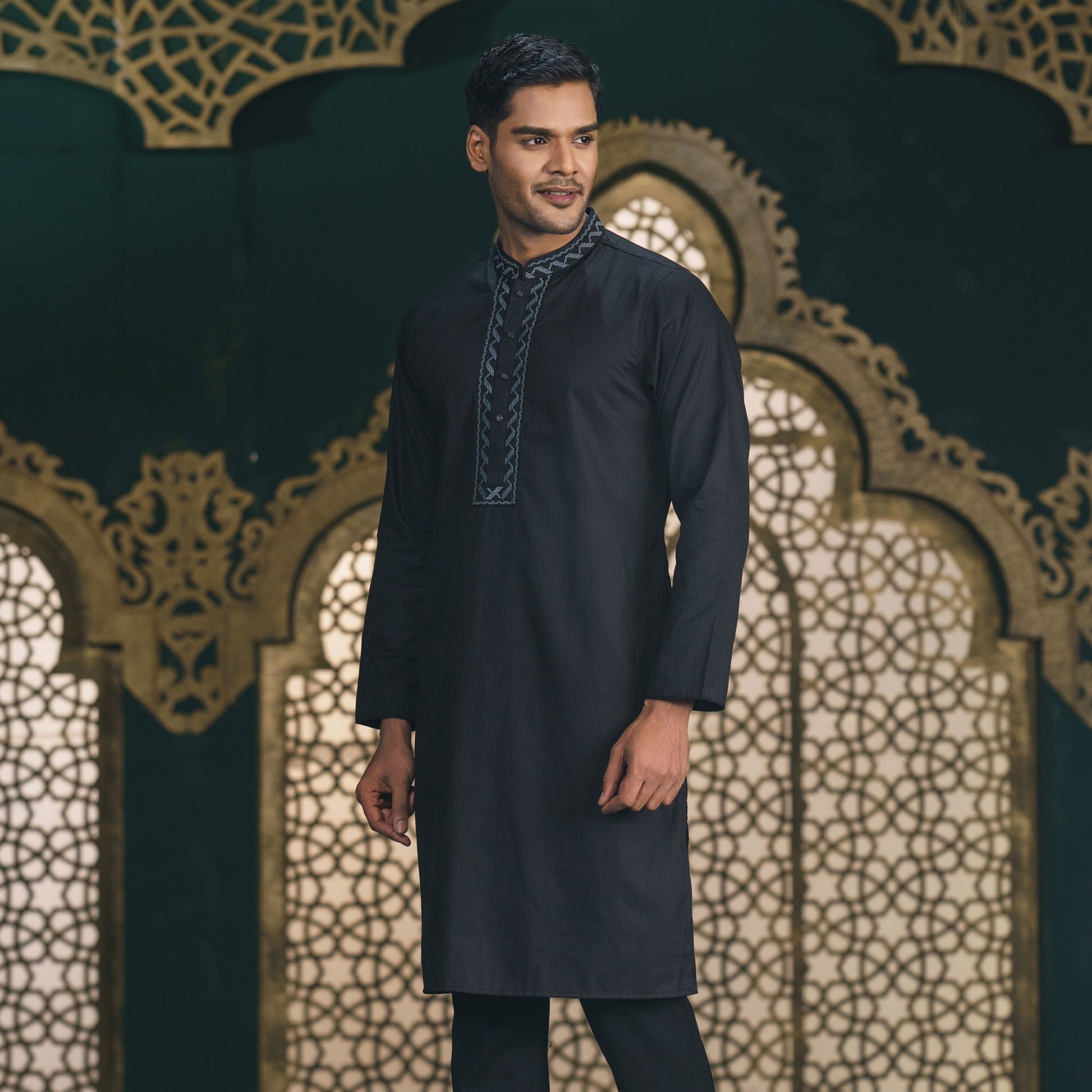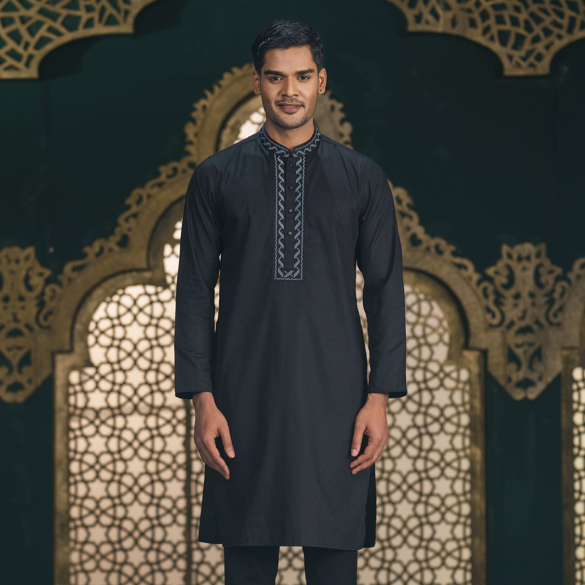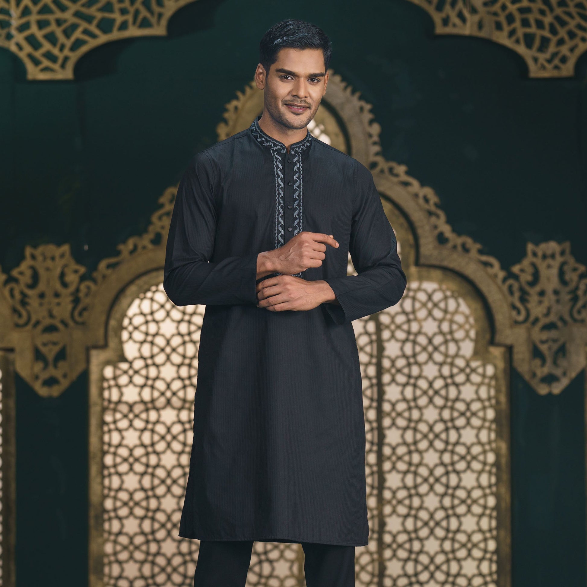 This Men's Black Embroidered Panjabi features a mandarin collar and intricate embroidery on premium cotton jacquard fabric. Designed with a regular fit and available in Panjabi Size A, it offers both elegance and comfort. The classic black color enhances its versatility, making it ideal for formal occasions and cultural events.