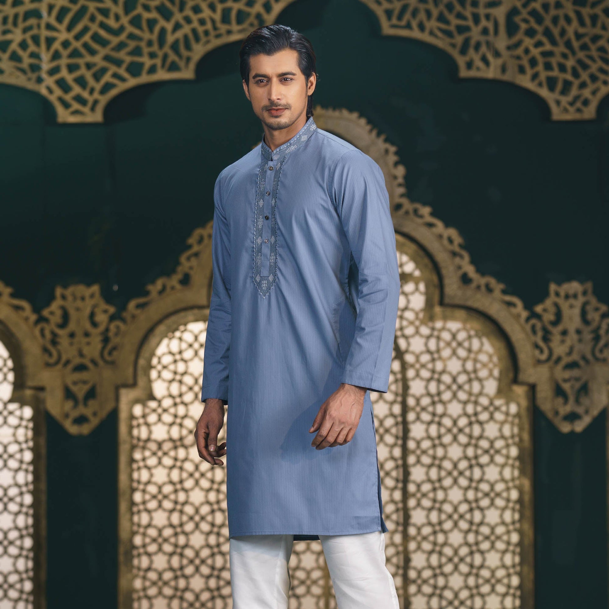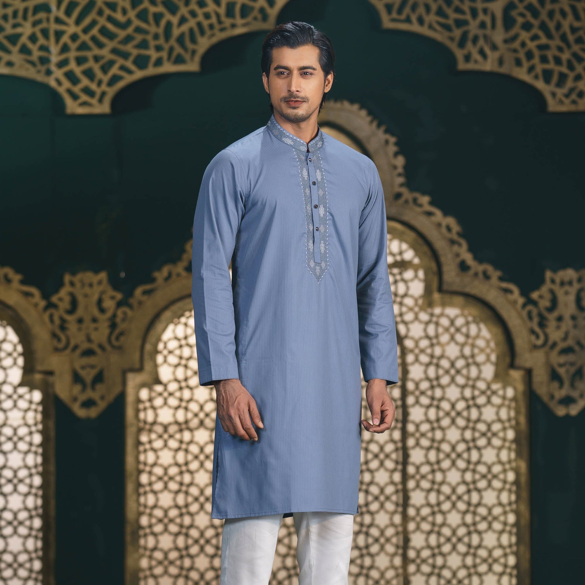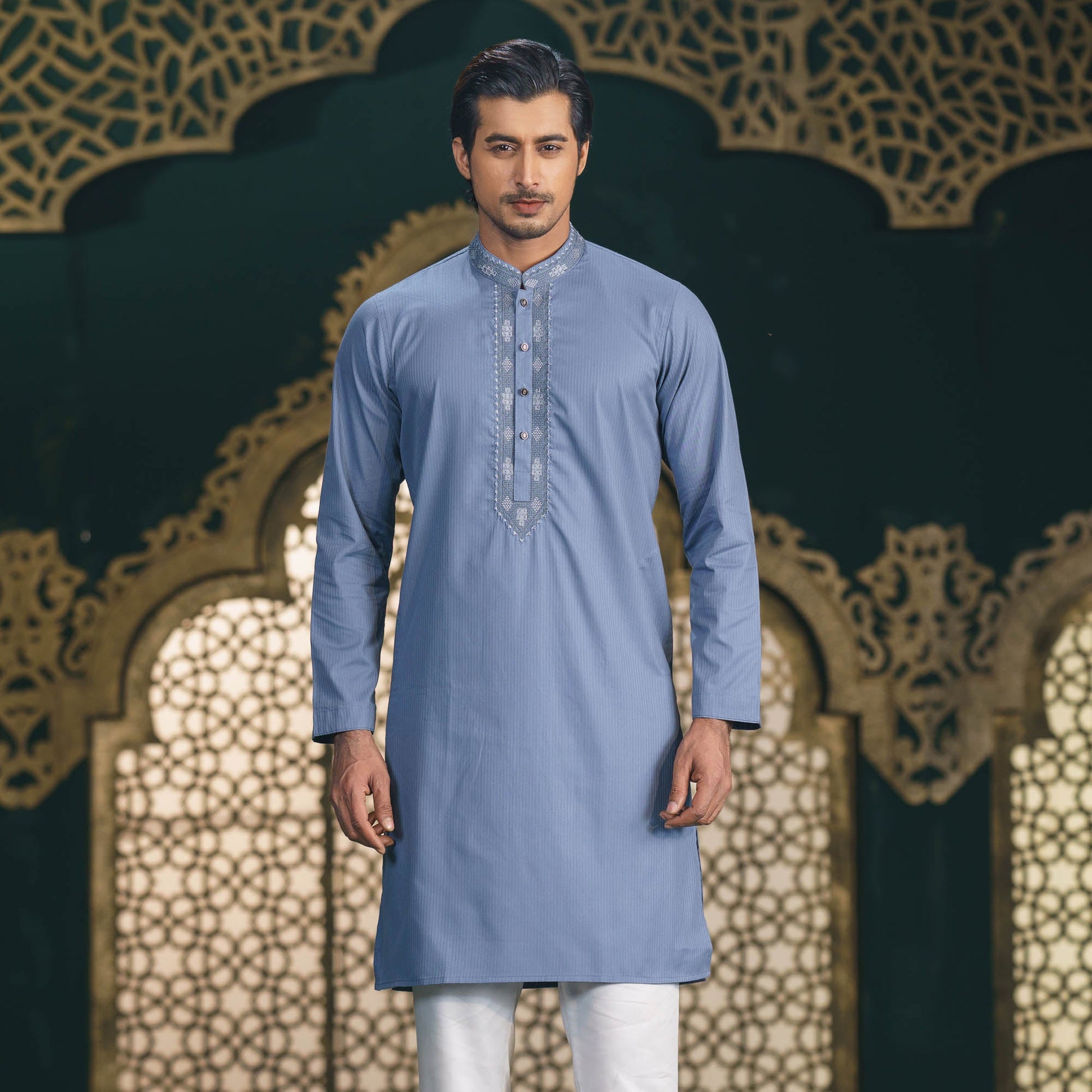 This Men's Ash Embroidered Panjabi combines a mandarin collar with intricate embroidery on soft cotton jacquard fabric. The regular fit ensures comfort and style, making it perfect for both formal and festive occasions. The ash color offers a modern, versatile look.