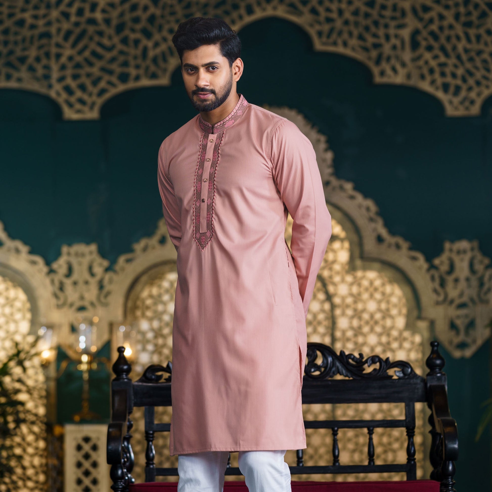 This Men's Pink Embroidered Panjabi features elegant embroidery and a mandarin collar on soft cotton jacquard fabric. Designed with a regular fit, it provides both comfort and style, making it ideal for special occasions. The pink hue adds a fresh and vibrant touch.
