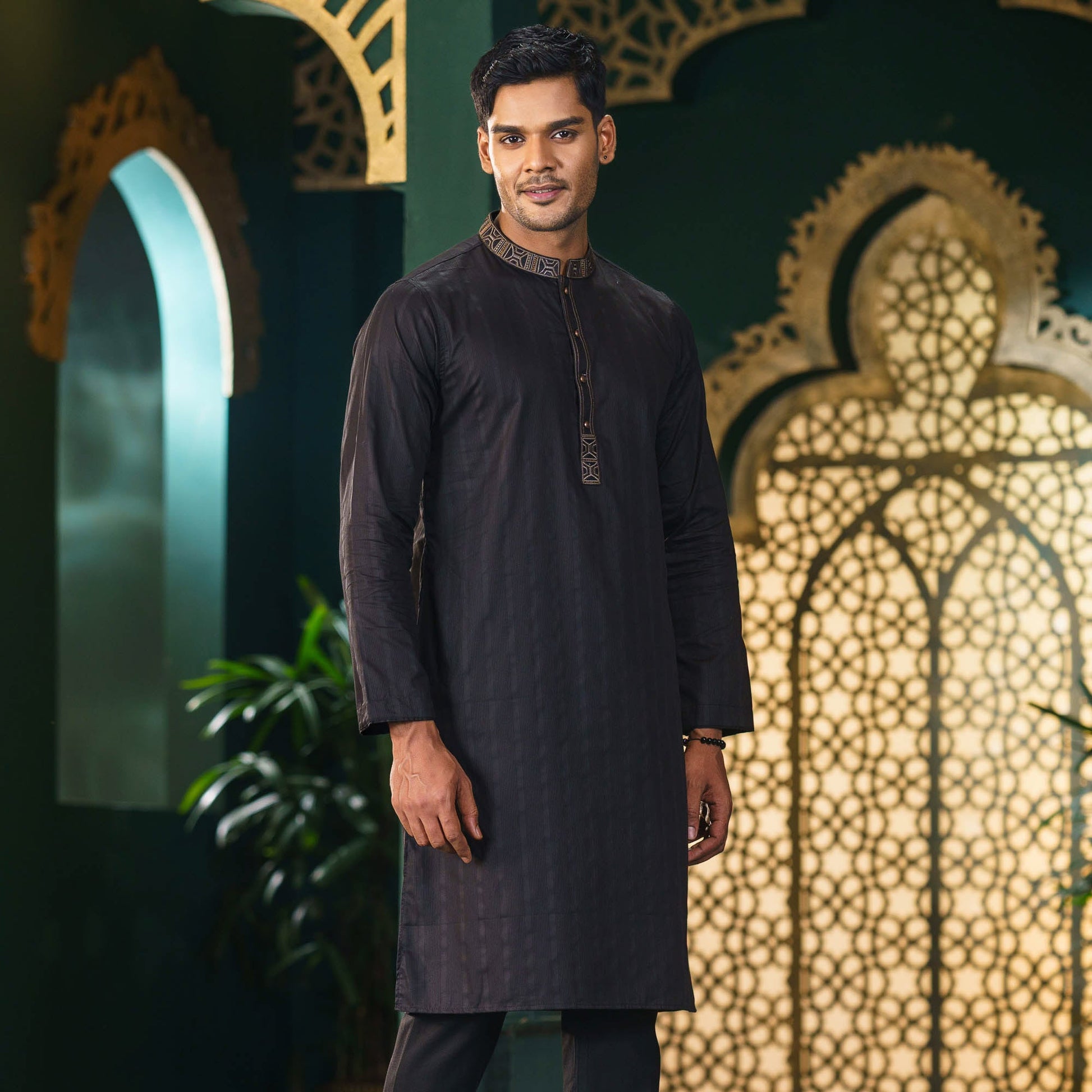 This Men's Black Embroidered Panjabi features sophisticated embroidery and a mandarin collar on premium cotton jacquard fabric. The regular fit provides comfort and a classic look, making it suitable for formal and festive occasions. The black color adds timeless elegance.