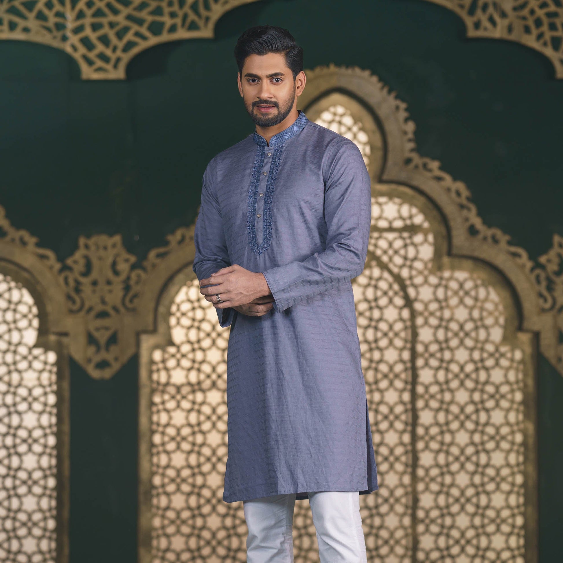 This Men's Ash Embroidered Panjabi showcases elegant embroidery and a sleek mandarin collar on premium cotton jacquard fabric. Designed with a regular fit for comfort, it's perfect for both casual and festive occasions. The ash color gives a modern, understated look.