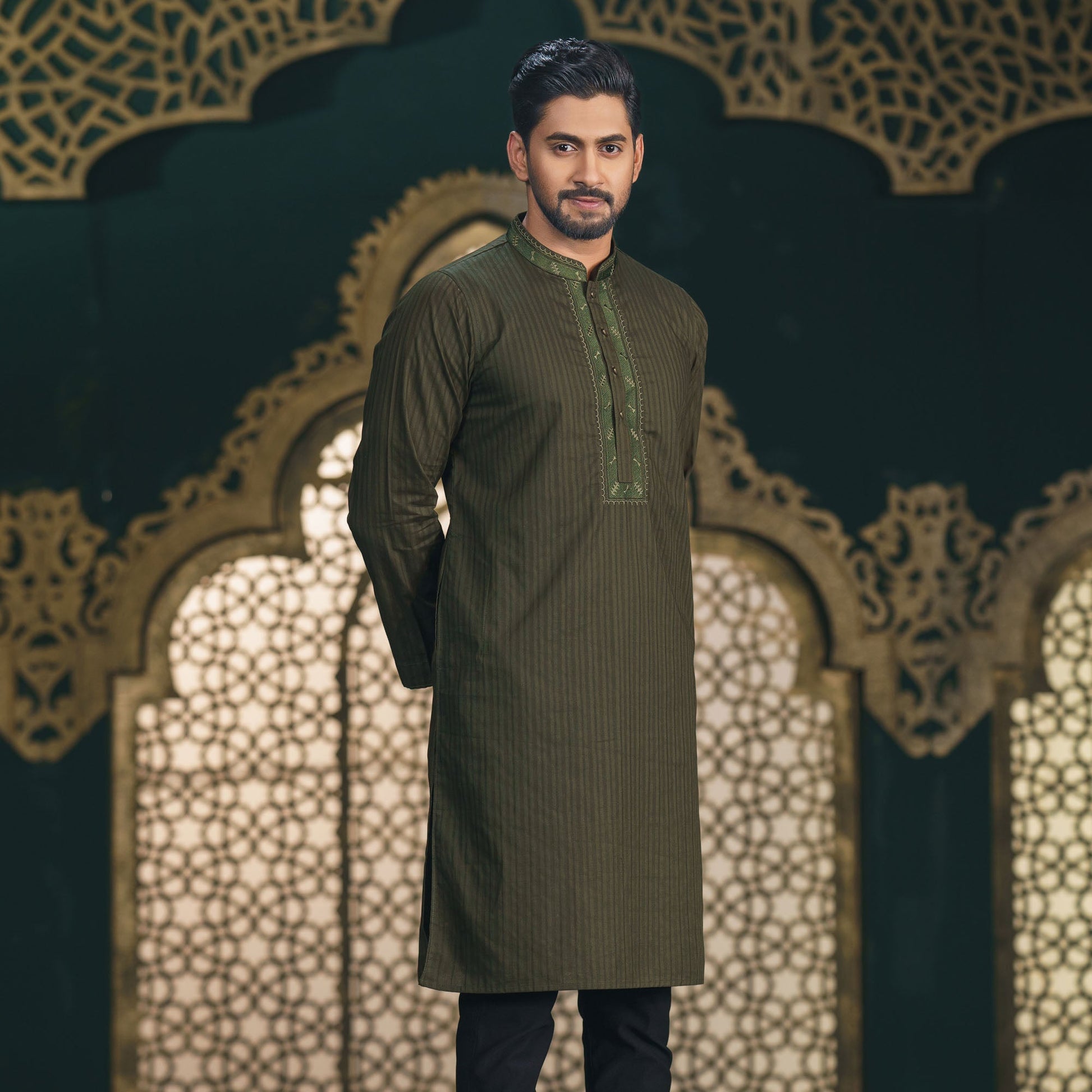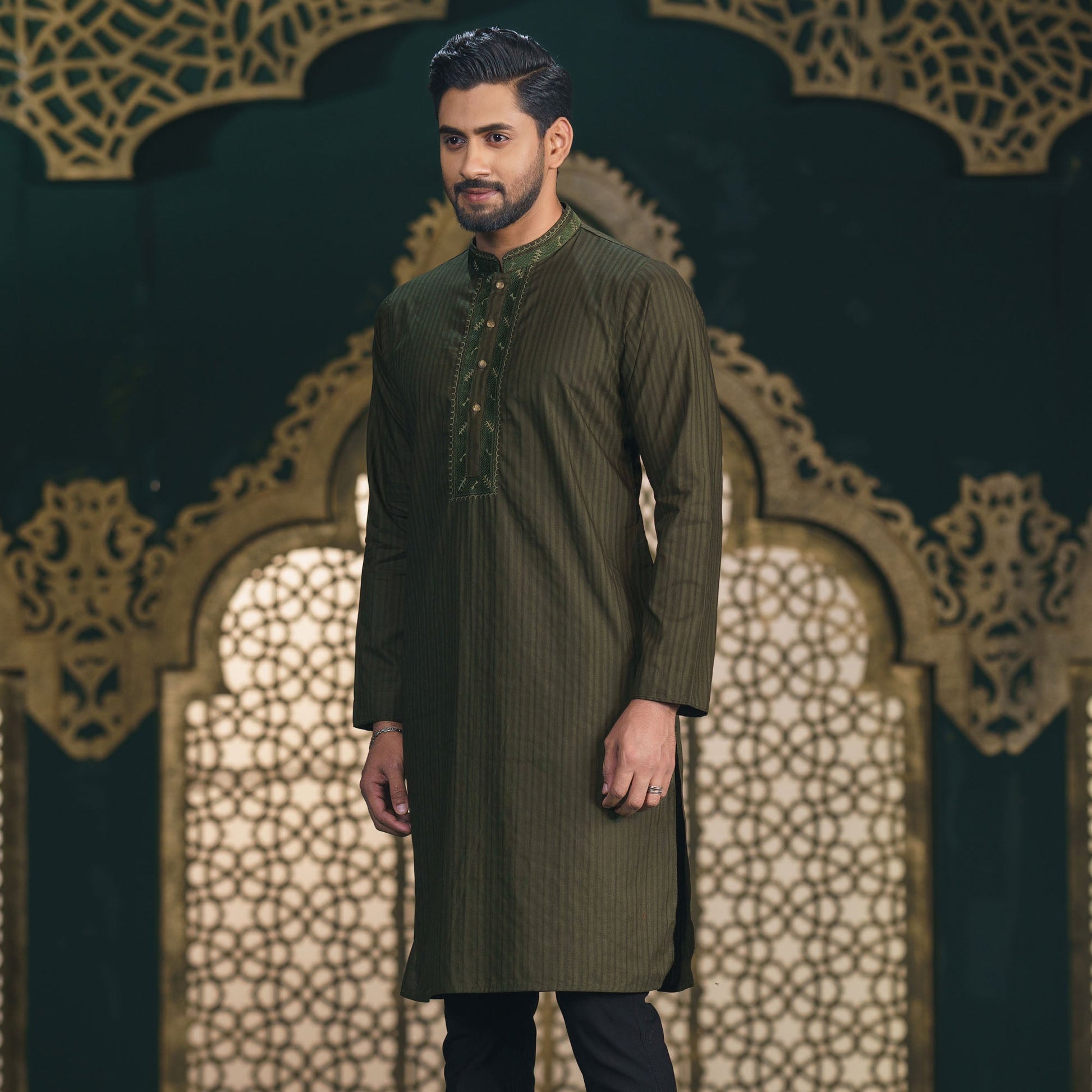This Men's Olive Embroidered Panjabi features a classic mandarin collar and elegant embroidery on cotton jacquard fabric. With a regular fit for comfortable wear, the olive color offers a unique and stylish option for traditional and formal occasions.