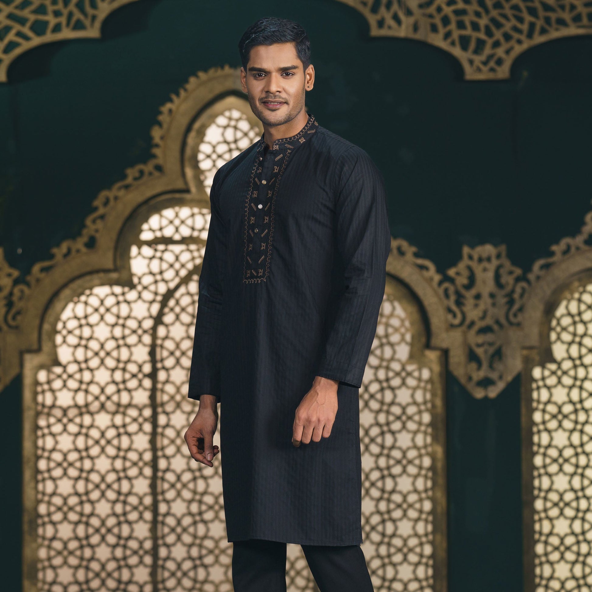 Introducing our stylish Mens Embroidery Panjabi in classic black. Made with high quality black fabric and intricate embroidery, this Panjabi is perfect for any occasion. Enjoy a sleek and sophisticated look while feeling comfortable and confident. Upgrade your wardrobe today!