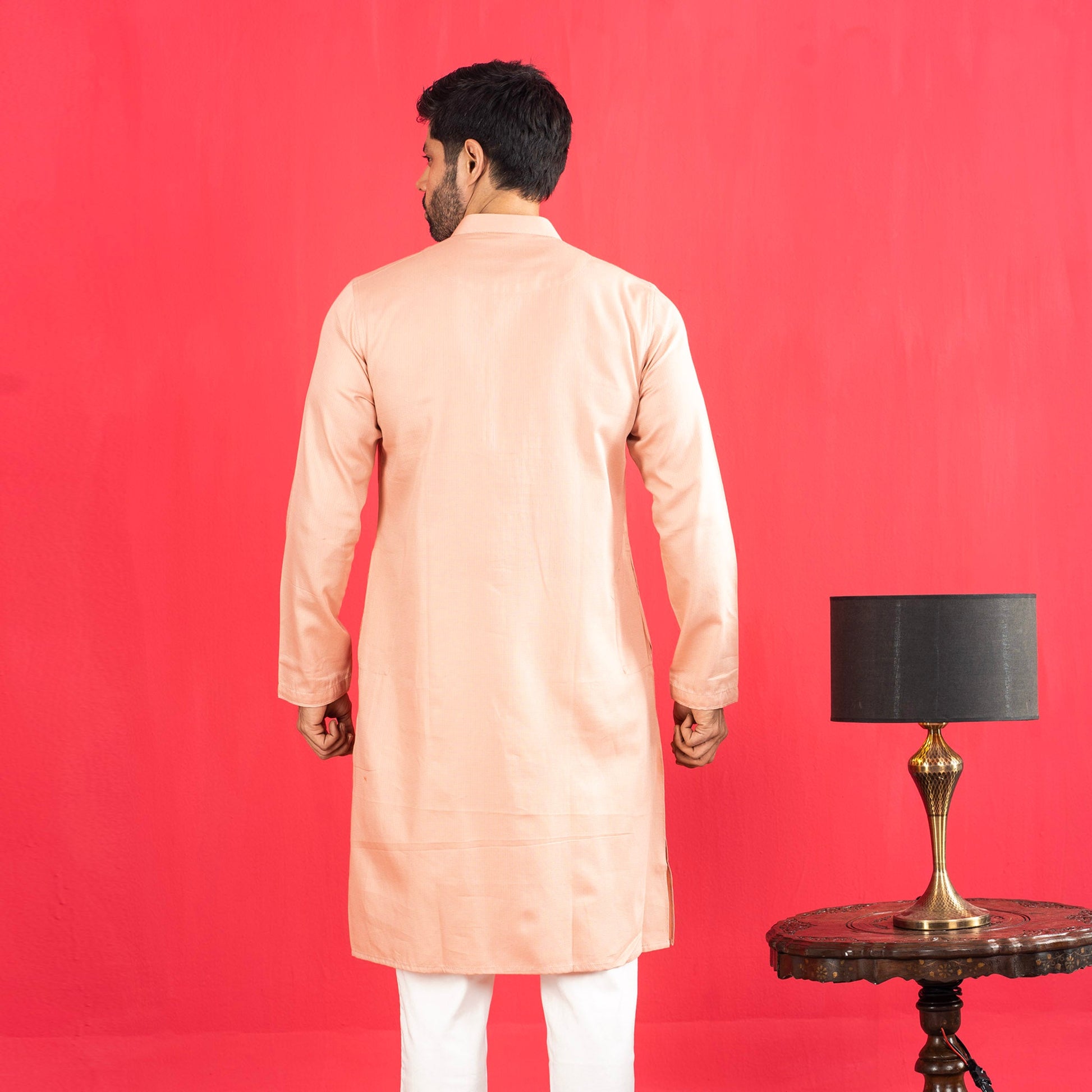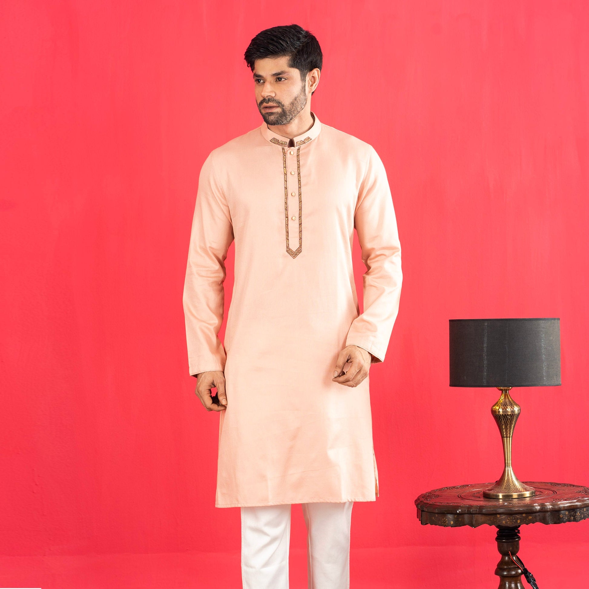 This men's pink Panjabi features delicate embroidery and elegant metal buttons, offering a stylish twist on traditional wear. Crafted from a poly-cotton blend, it provides a regular fit that is both comfortable and flattering. Ideal for cultural celebrations or special occasions, available in various sizes.