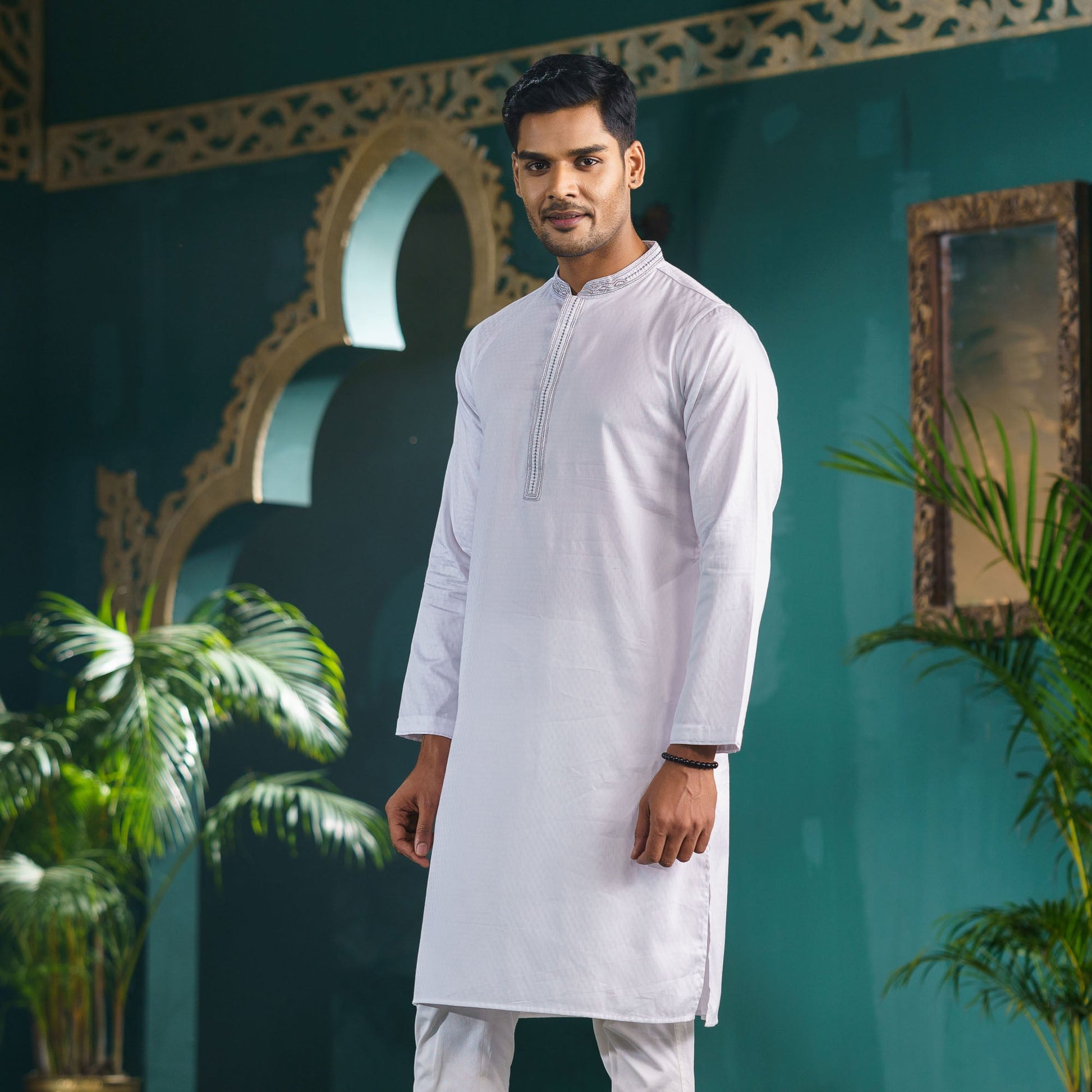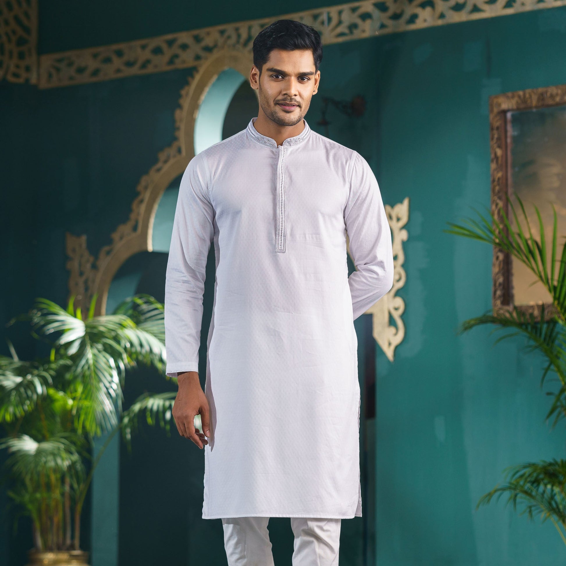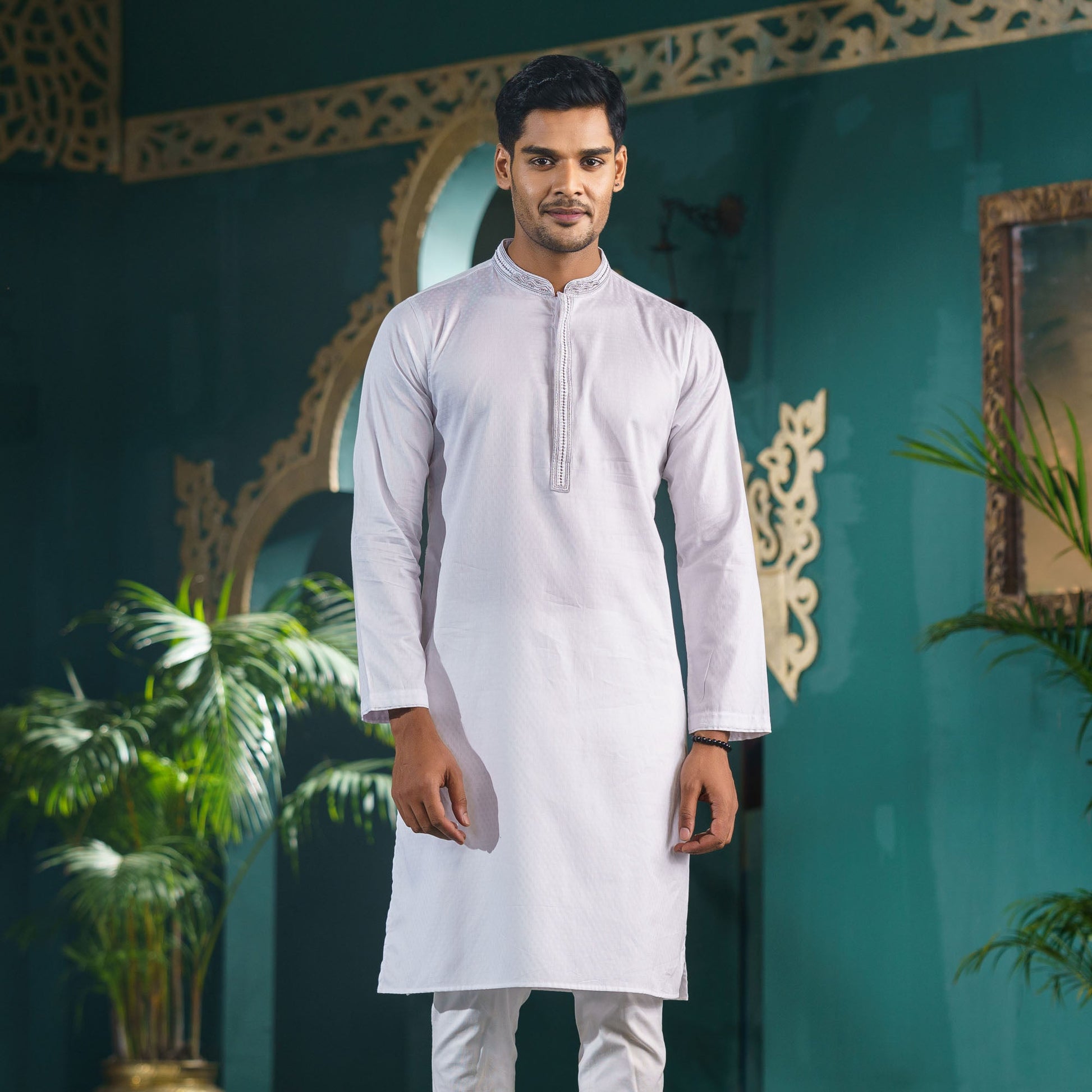 This men’s white karchupi Panjabi features a mandarin collar with zardozi embroidery and metal shank buttons for an elegant touch. Made from poly cotton, it provides a regular fit and is available in Panjabi size, perfect for traditional and festive occasions.