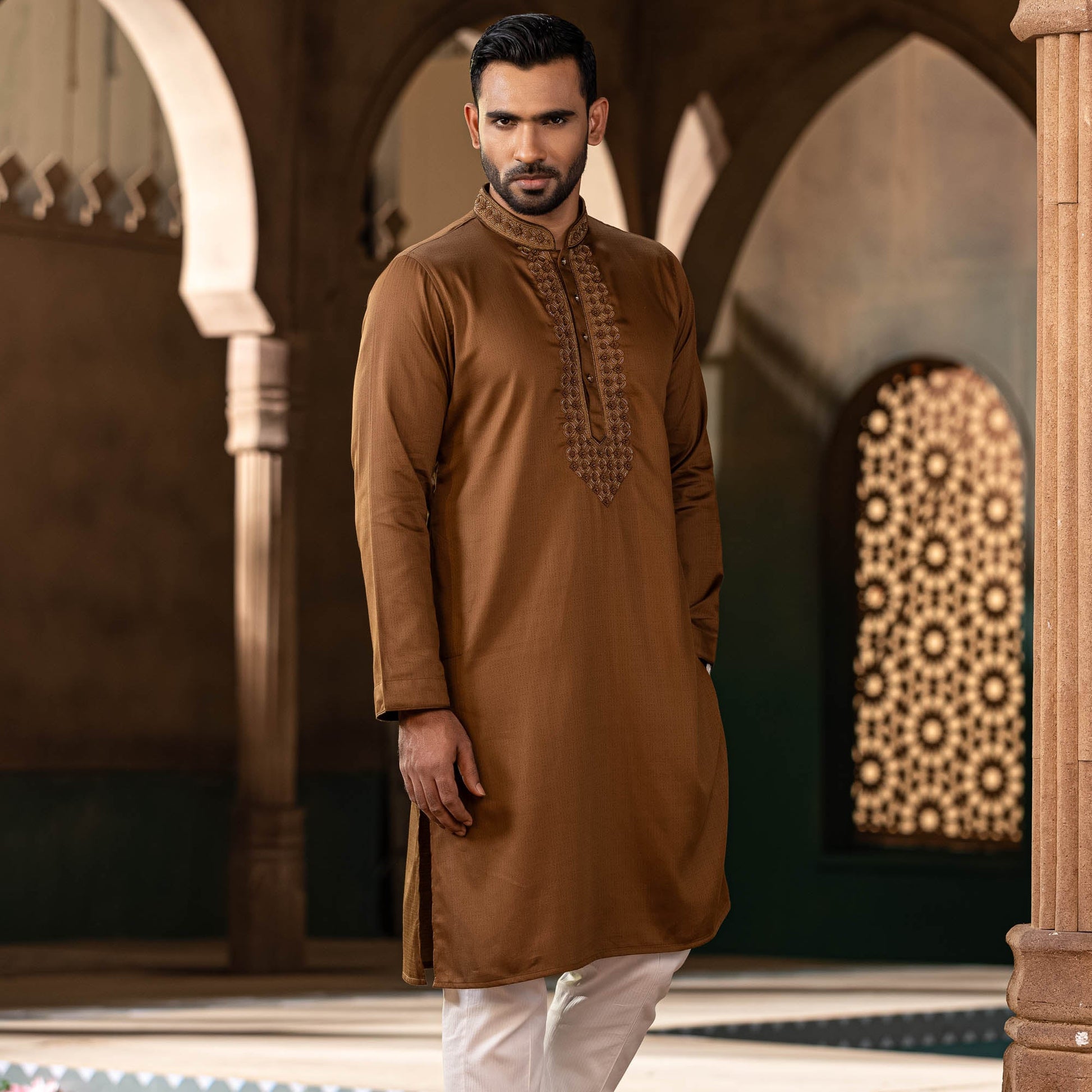 This men’s olive karchupi Panjabi features a mandarin collar adorned with zardozi embroidery and metal shank buttons, adding a refined touch. Made from poly linen, it offers a regular fit and is available in Panjabi size, perfect for traditional and festive events.