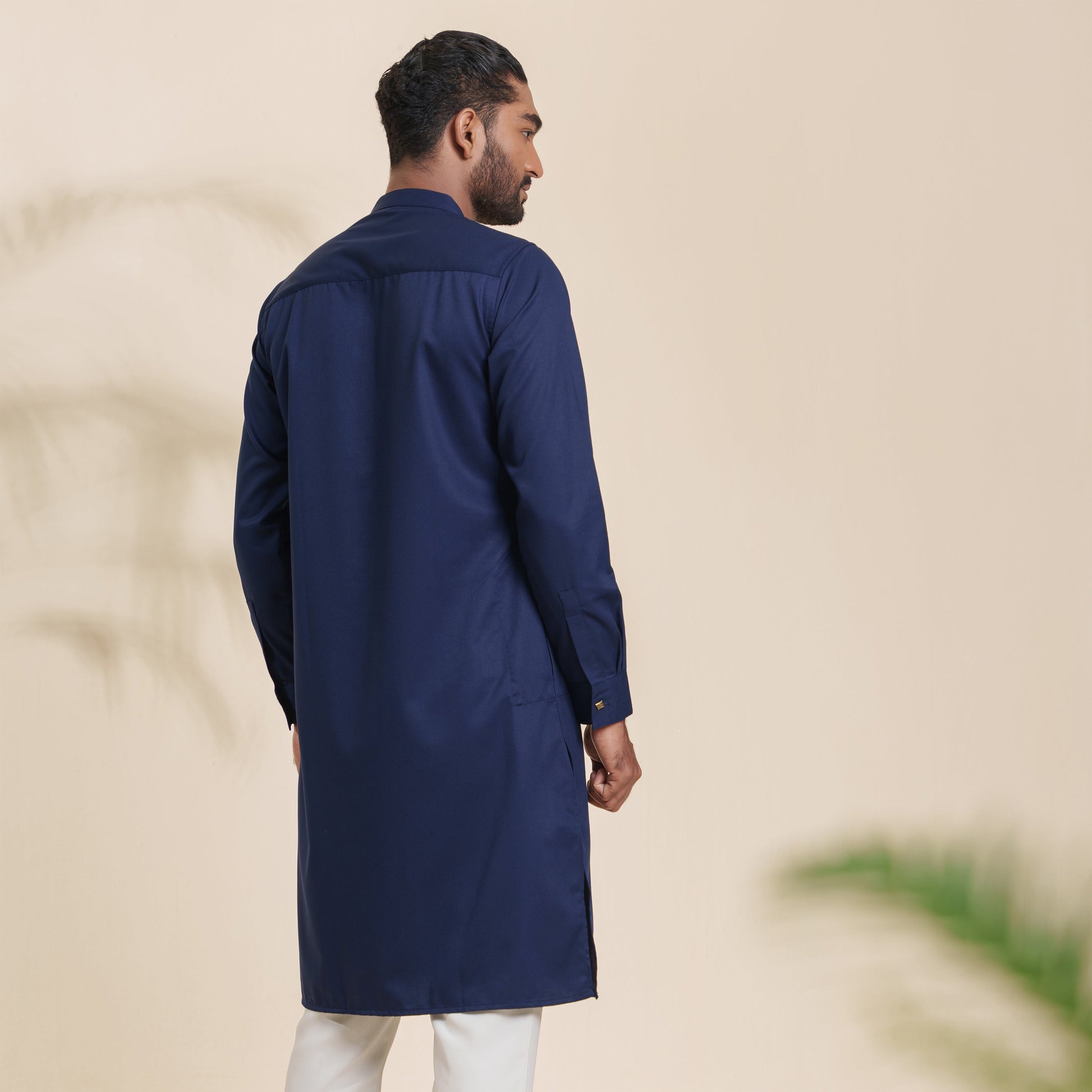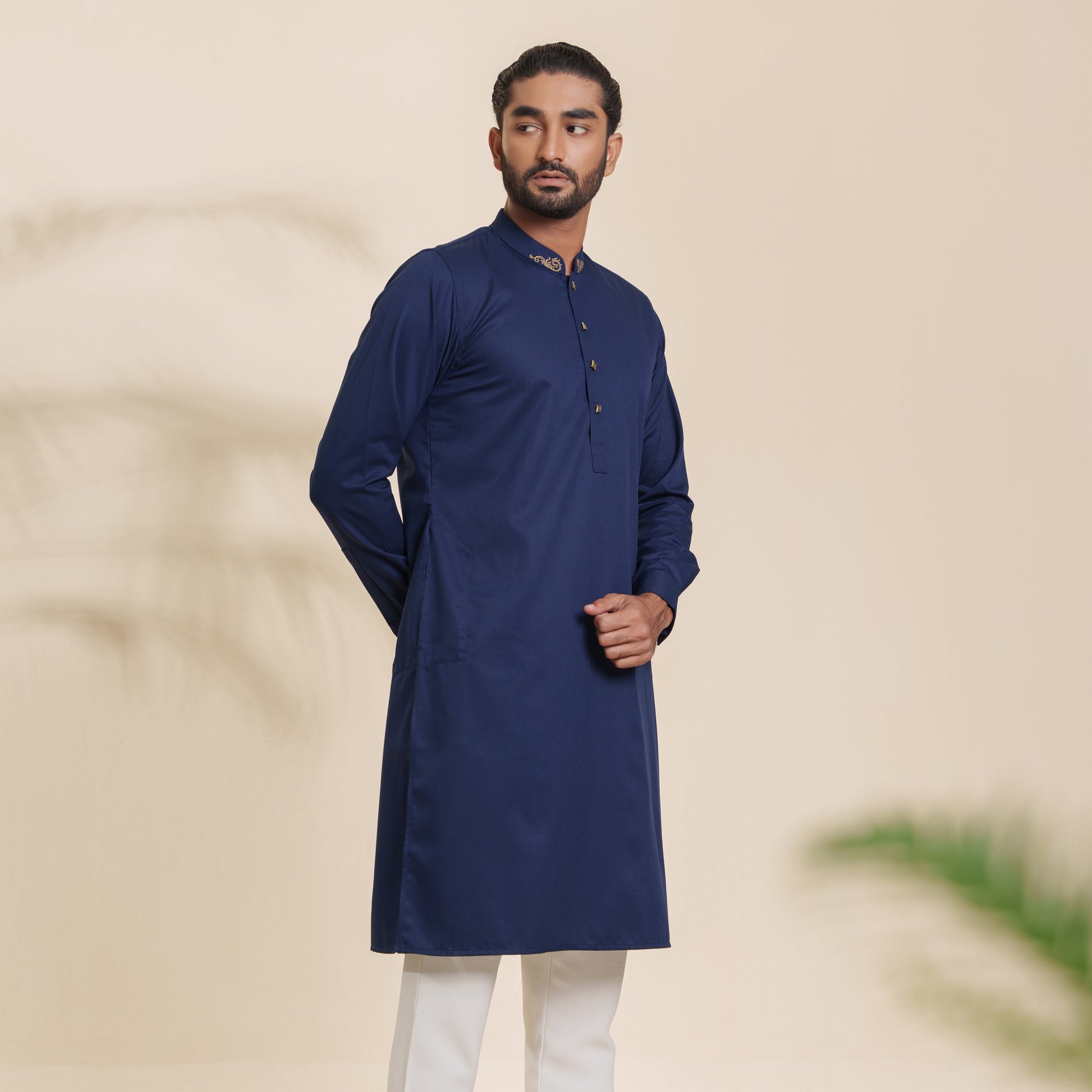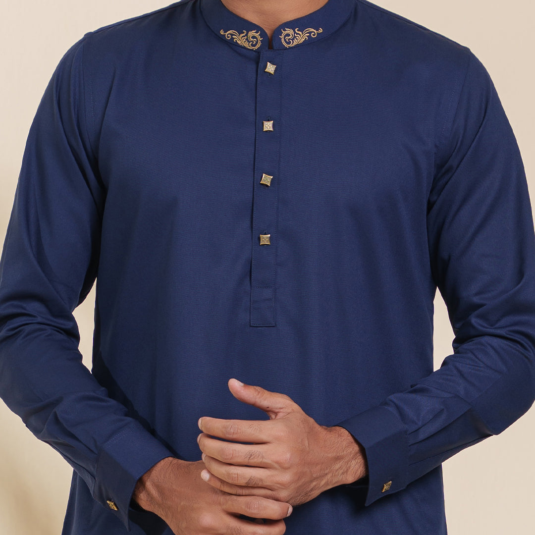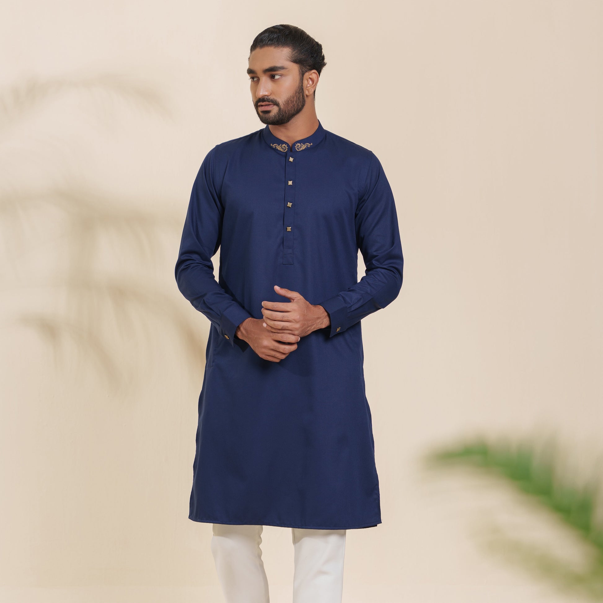 This Men'S Premium Panjabi Is Made From A Blend Of Cotton And Linen, Making It Comfortable And Durable. Navy Blue In Color, The Panjabi Is Embellished With Decorative Embroidery For A Stylish Finish. Perfect For Formal Occasions.