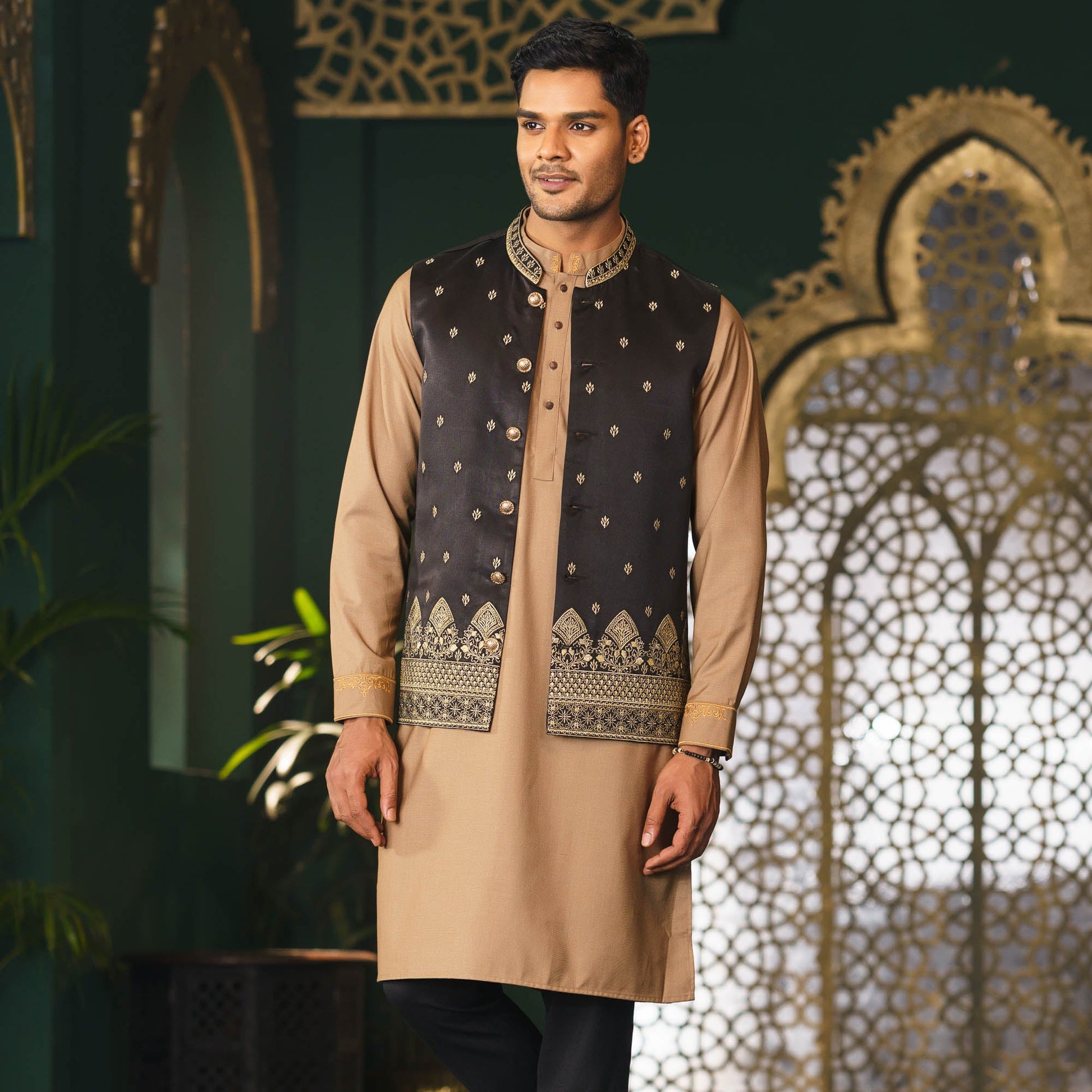 Elegant mens black vest crafted from luxurious satin fabric, offering a smooth and refined finish. Designed in a regular fit for comfort and style, it features intricate embroidery work that adds a touch of sophistication. Perfect for pairing with panjabi or formal wear for festive and special occasions.