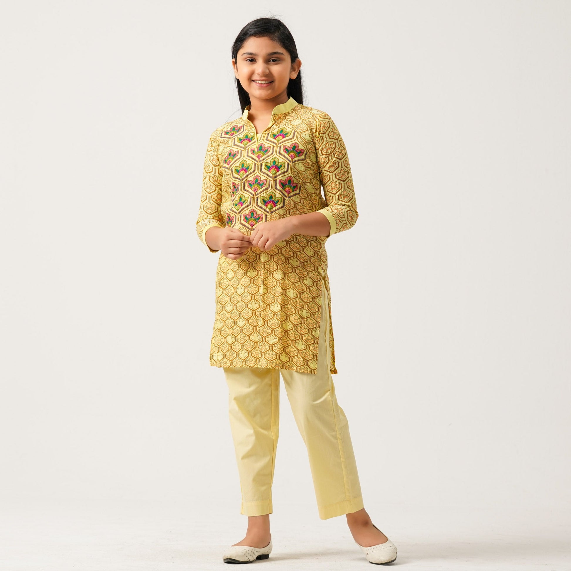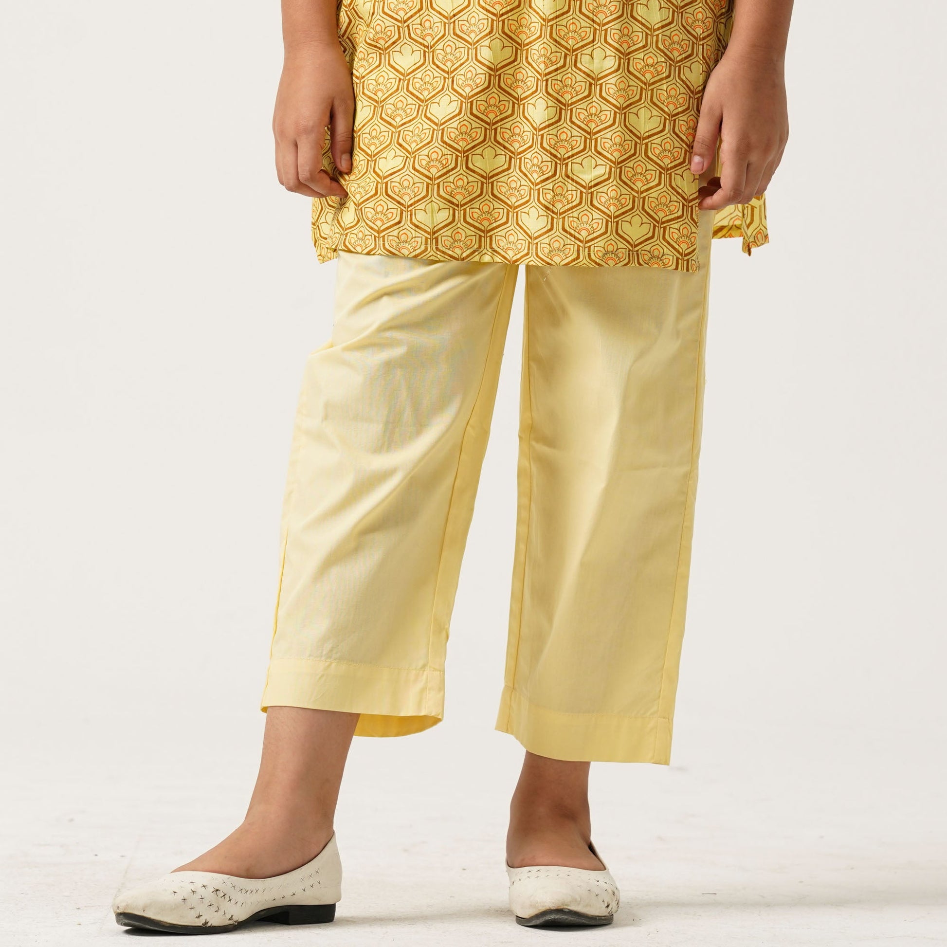 This vibrant yellow ethnic two piece set features a beautifully screen-printed design with intricate embroidery work for a touch of elegance. Crafted from crape cotton, the set offers comfort and a flattering regular fit. Perfect for festive or special occasions, it combines traditional craftsmanship with modern style for a refined look.