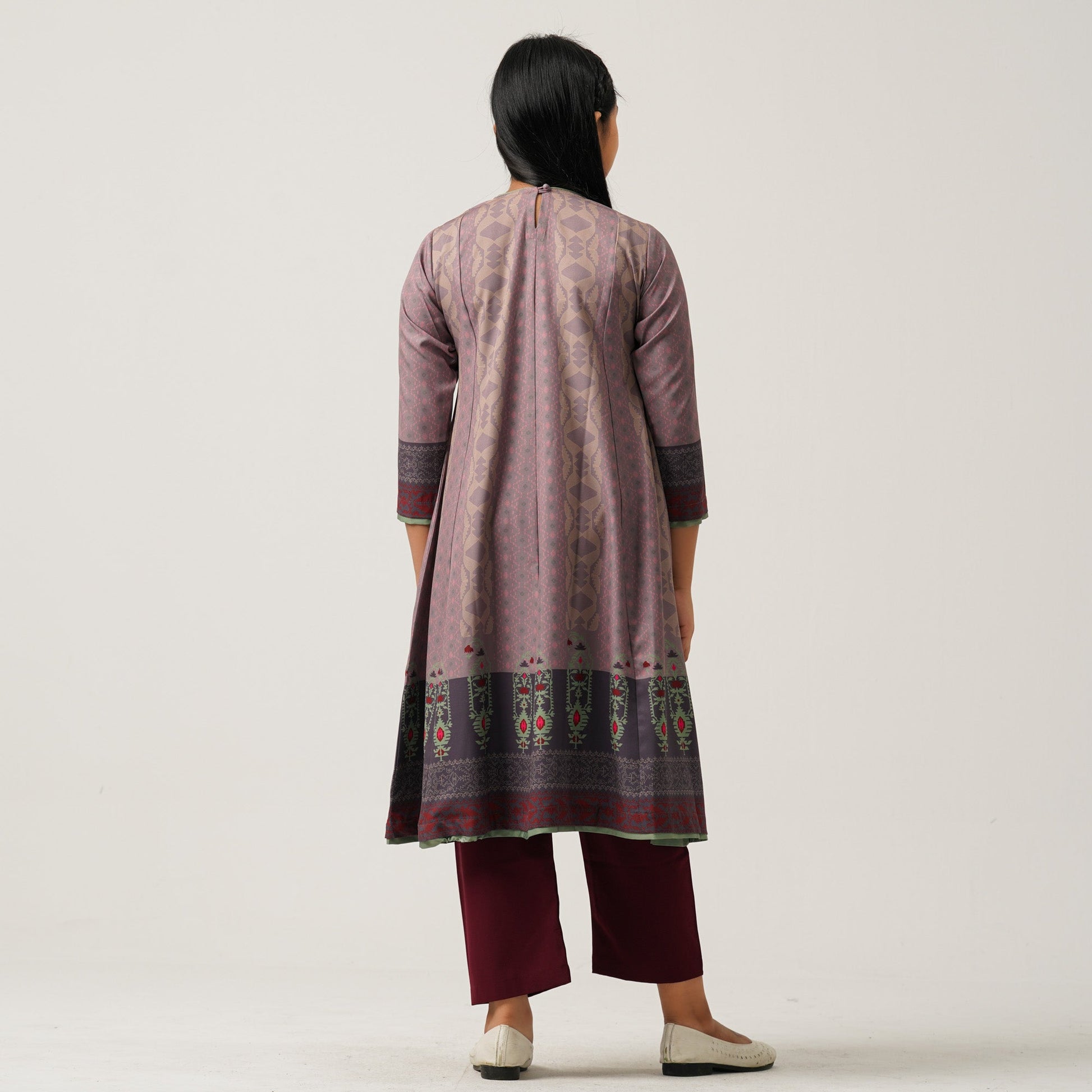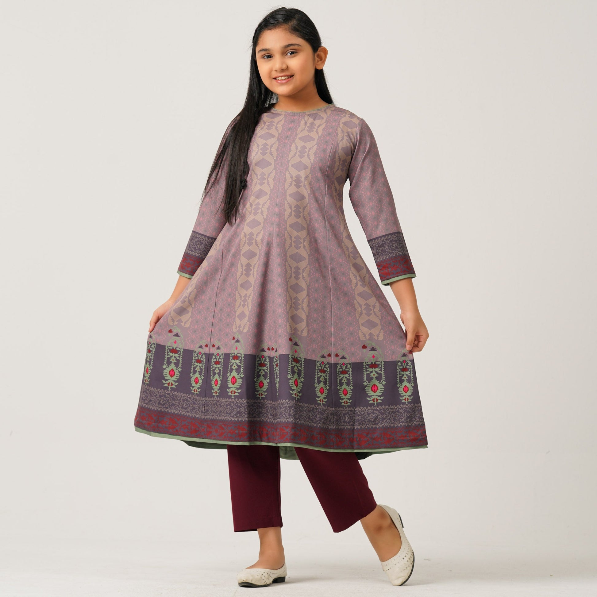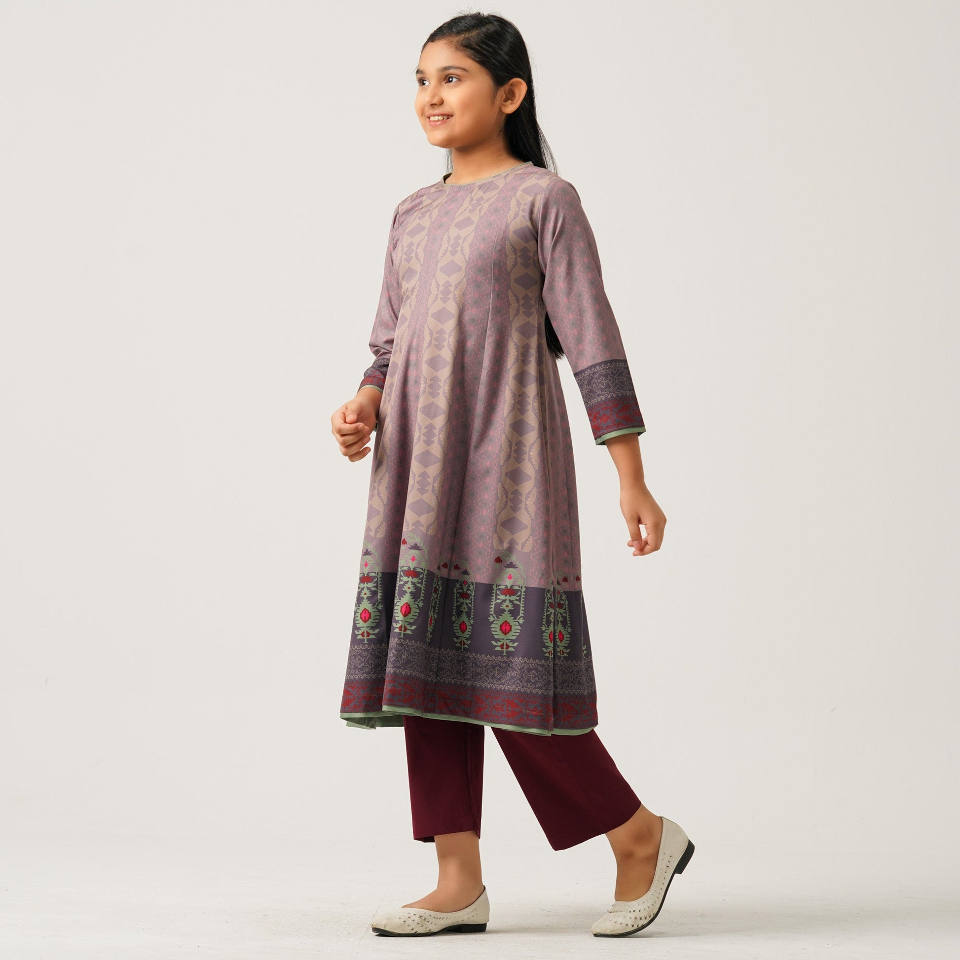 This elegant two piece set for girls is crafted from high-quality blended silk. It features vibrant digital prints that add a playful flair. Soft, lightweight, and comfortable—perfect for festive occasions and special celebrations.