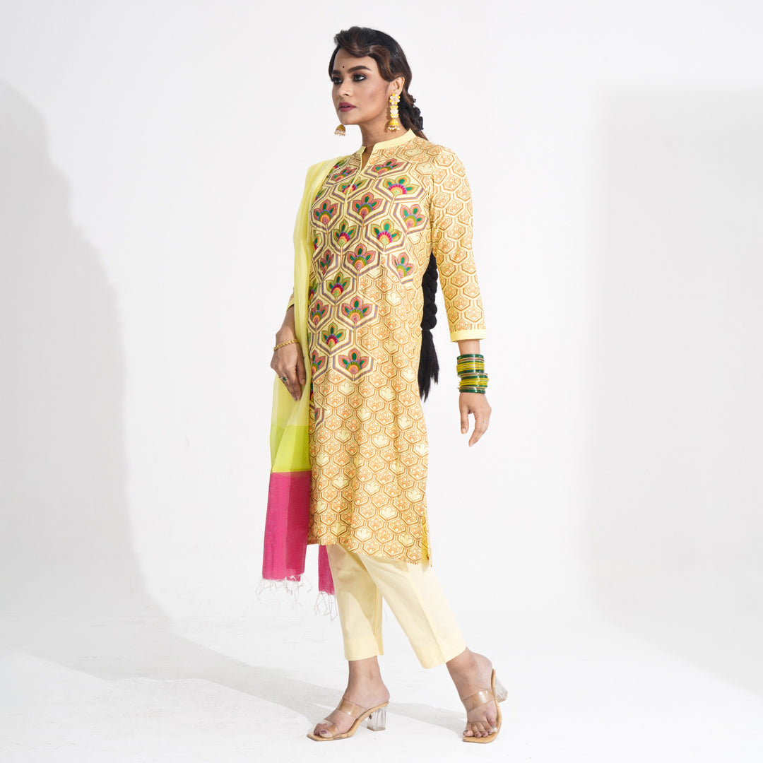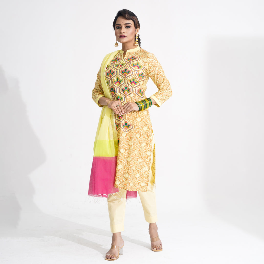 This vibrant yellow ethnic three piece set features a beautifully screen-printed design with intricate embroidery work for a touch of elegance. Crafted from crape cotton, the set offers comfort and a flattering regular fit. Perfect for festive or special occasions, it combines traditional craftsmanship with modern style for a refined look.