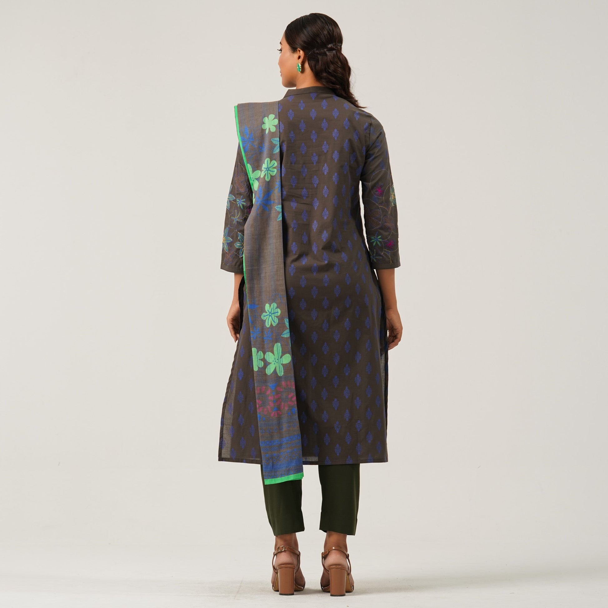 This elegant three piece set cotton salwar kameez set features screen printing and delicate embroidery on the front bodice. It is paired with a digitally printed orna and a solid cotton pant. Designed for comfort and grace, it’s ideal for both casual and semi-formal occasions.