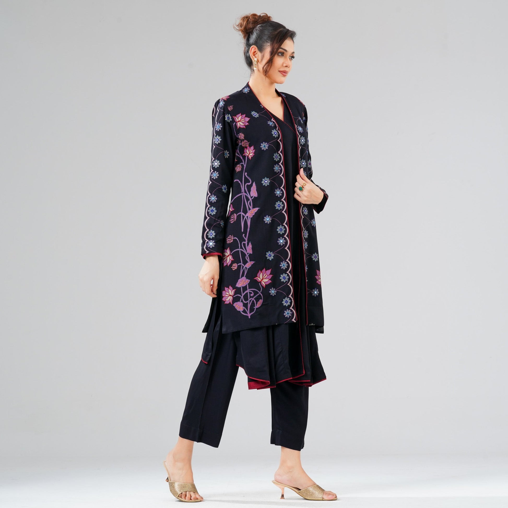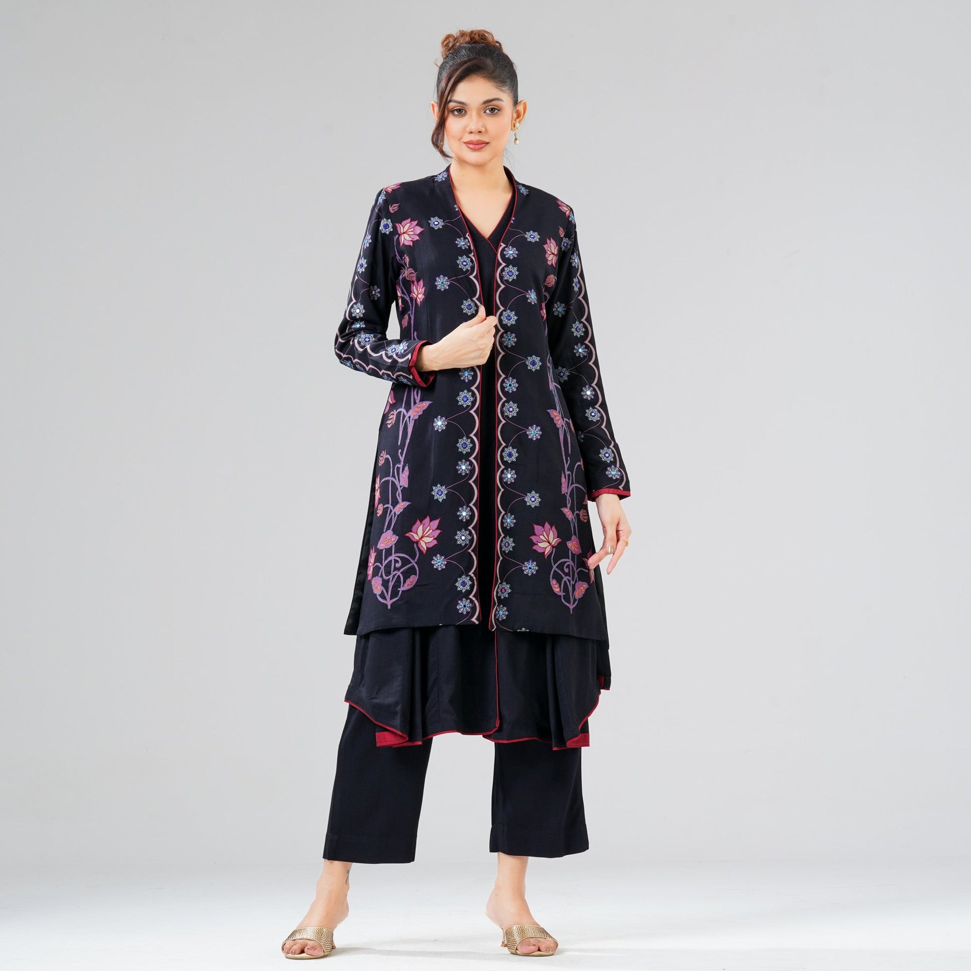 This women’s black premium three piece ethnic set features a sleeveless inner, a full-sleeve long jacket, and matching pants. The long jacket is designed in a sherwani cut with intricate screen printing and detailed embroidery for an elegant finish. Made from soft woven fabric with a regular fit, this set combines traditional charm with modern sophistication, perfect for festive occasions or special events.