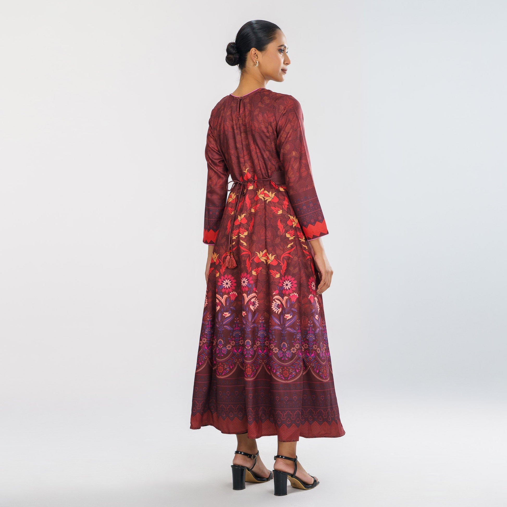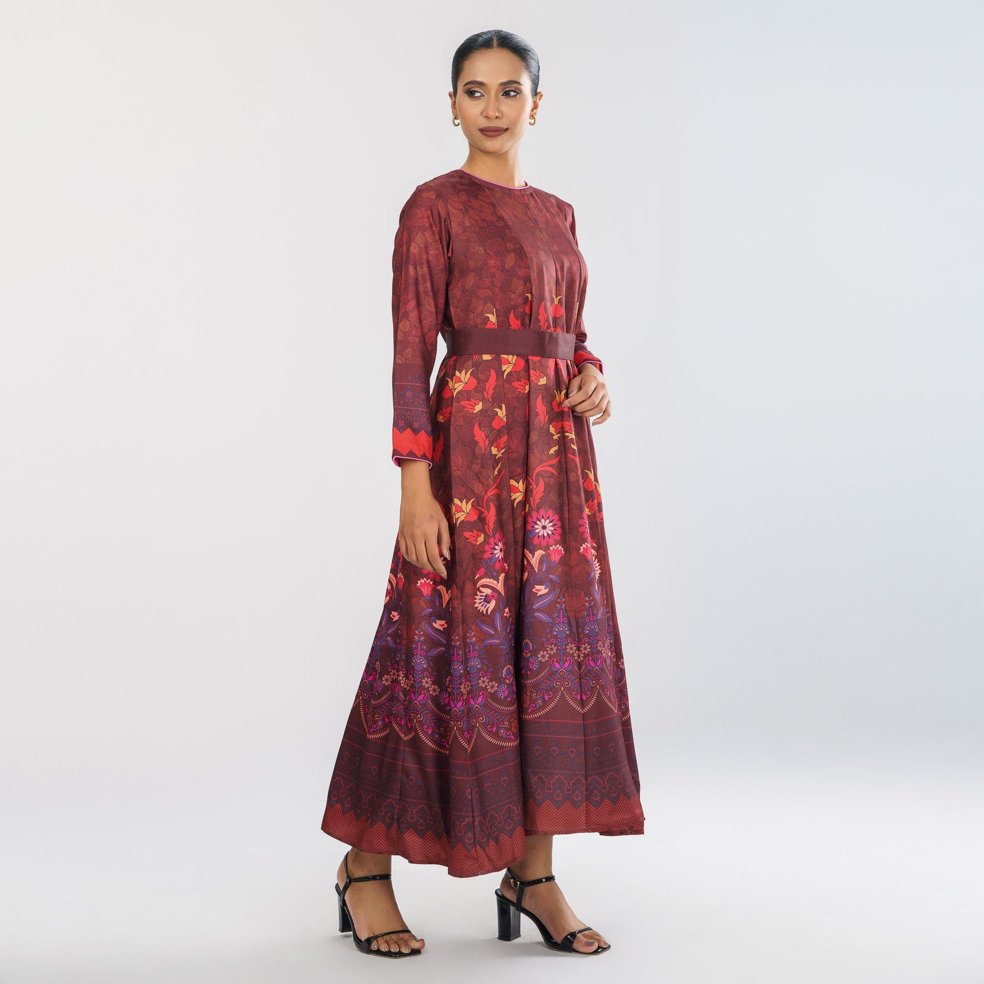 This vibrant multicolor ethnic gown is crafted from lightweight georgette fabric with an eye-catching digital print. It features an attached belt for added style and a flattering silhouette. Designed in a regular fit, this gown is perfect for festive events or special gatherings, bringing elegance to any occasion.