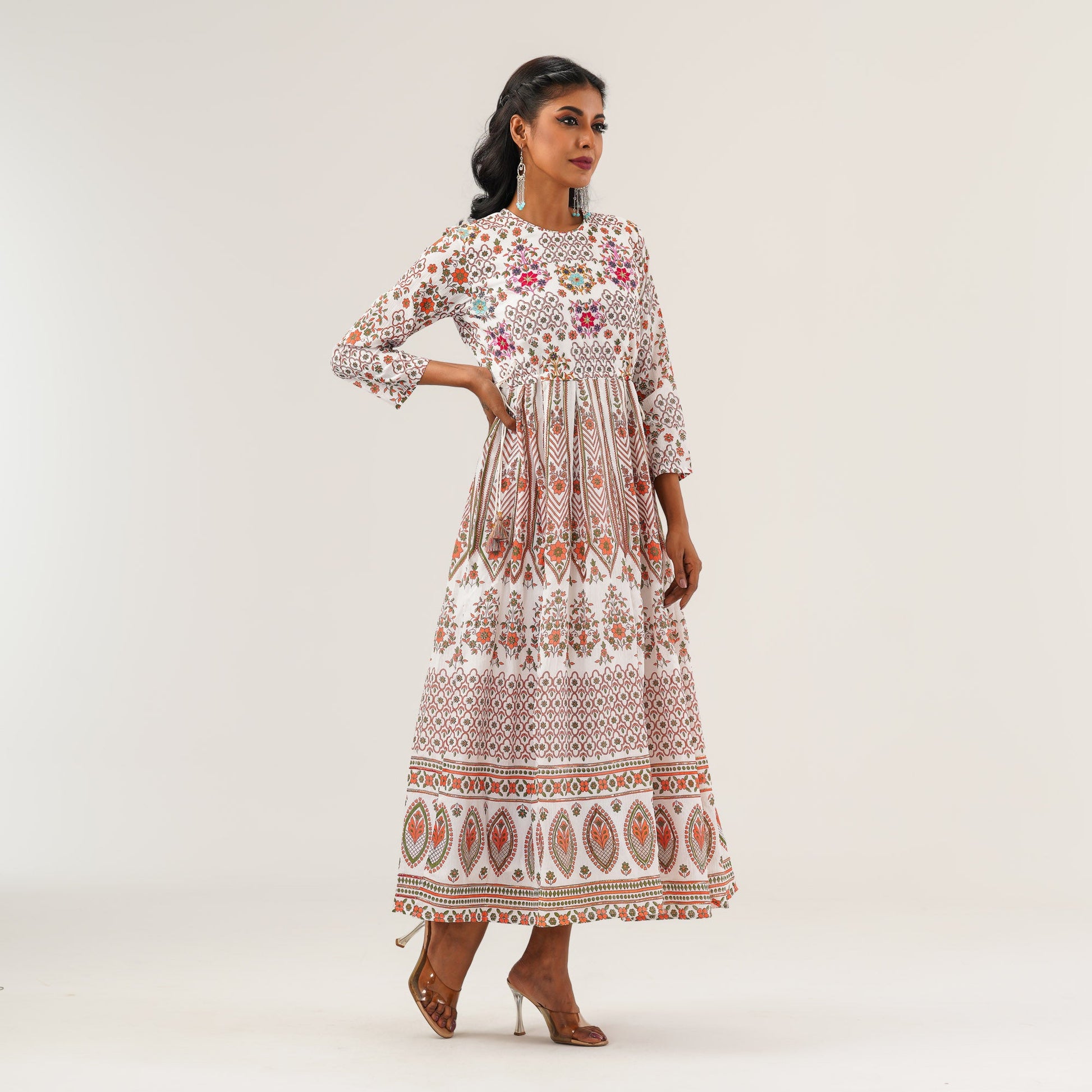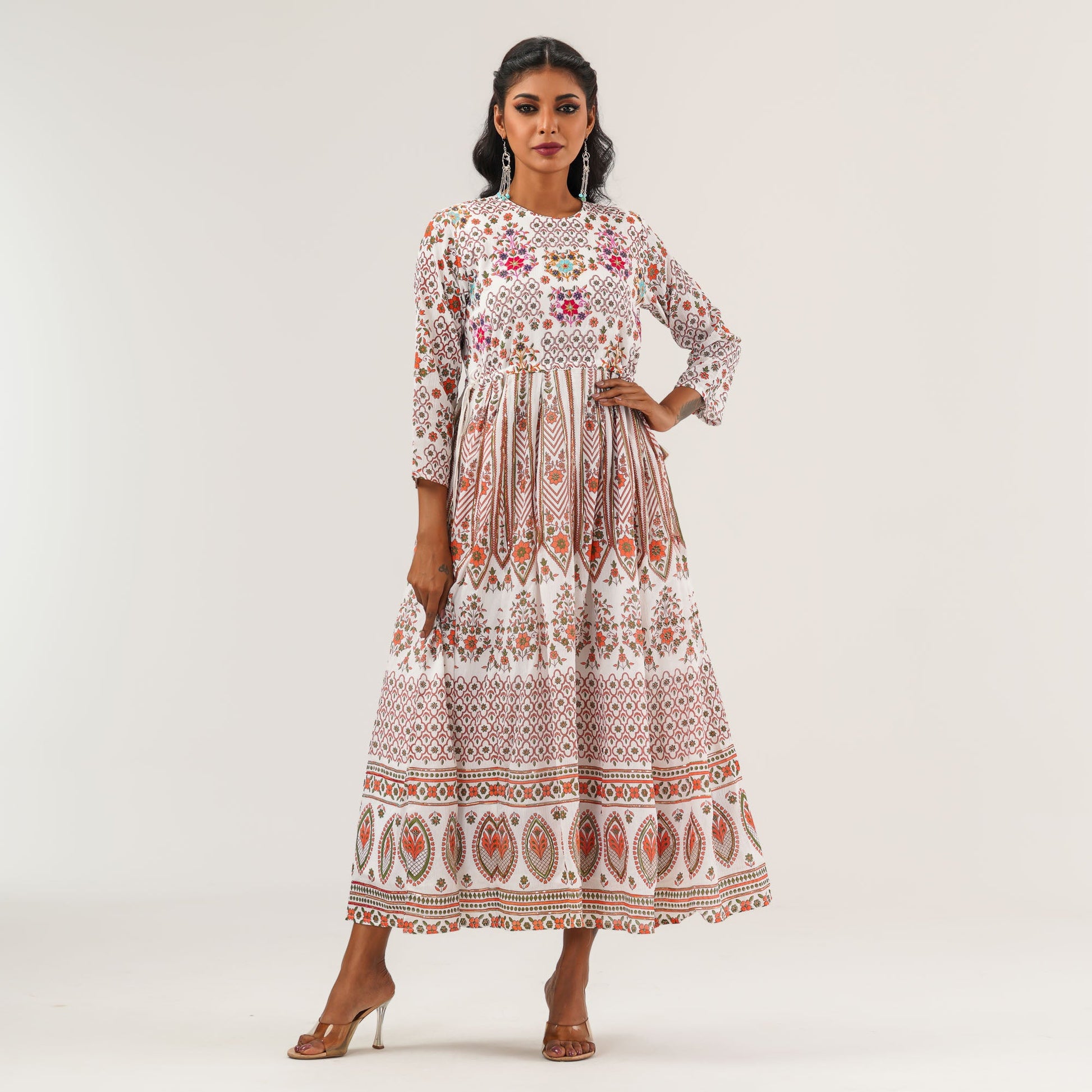 This elegant white ethnic gown is crafted from premium silk georgette, featuring intricate screen printing and manual embroidery. The waist dosti and tassel details add a refined charm, enhancing its graceful silhouette. Perfect for festive and special occasions, offering a blend of tradition and sophistication.