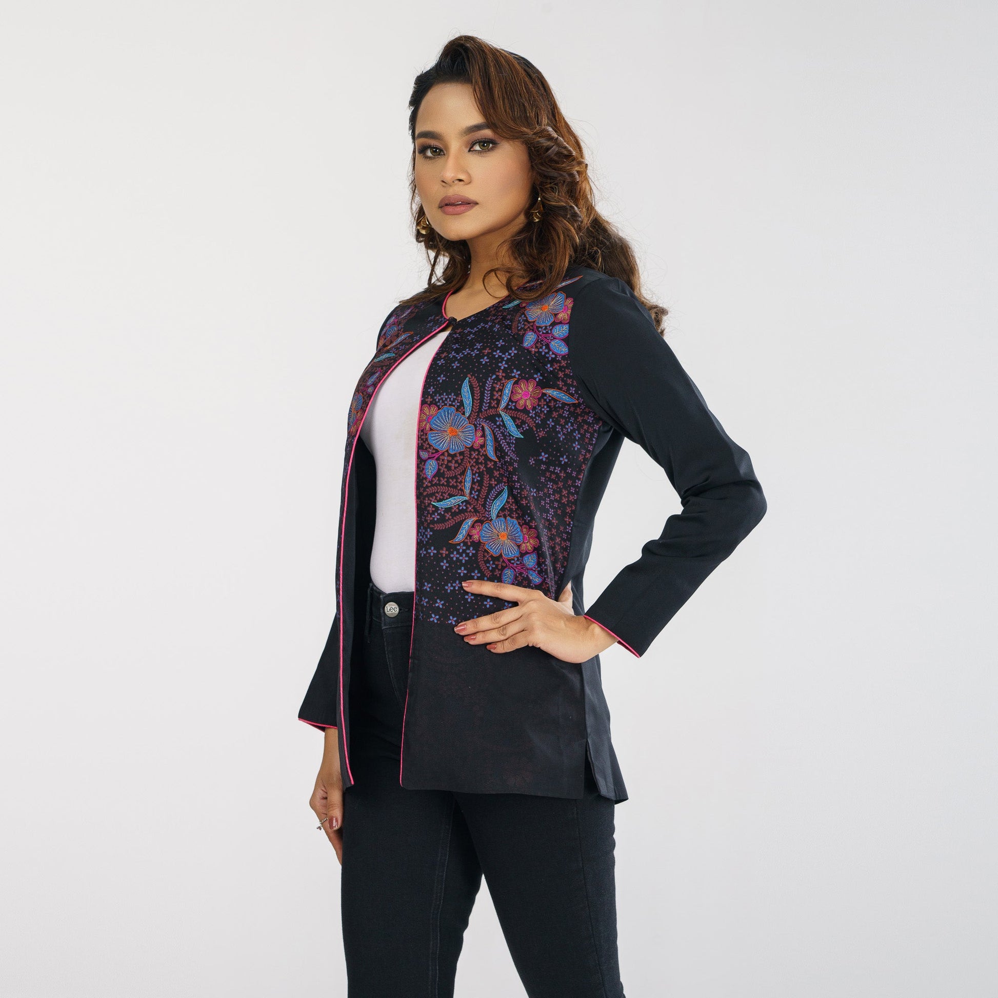 This beautifully crafted ethnic jacket is designed with screen print and intricate embroidery work, showcasing a fusion of traditional artistry and modern elegance. Made from luxurious silk fabric, it features a regular fit for added comfort and style. The multi-color design makes it a versatile piece for various occasions, ideal for festive or semi-formal wear. With its delicate detailing and premium finish, this jacket adds a refined touch to your ethnic wardrobe.
