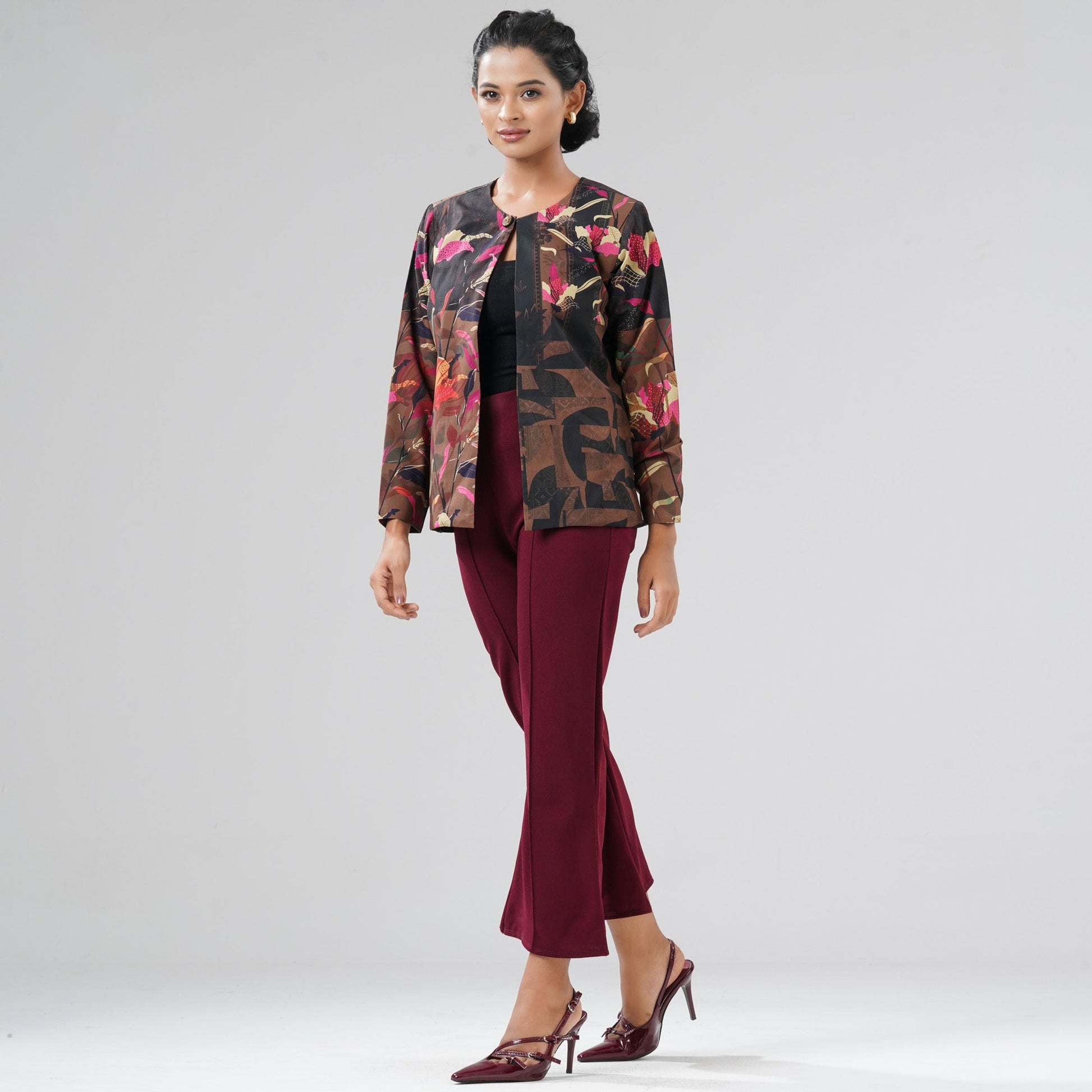 This women’s black ethnic jacket features a digital print on a smooth blended fabric. Designed with a regular fit, it is perfect for festive occasions, parties, or casual wear. Lightweight and stylish, it adds an elegant touch to any outfit.