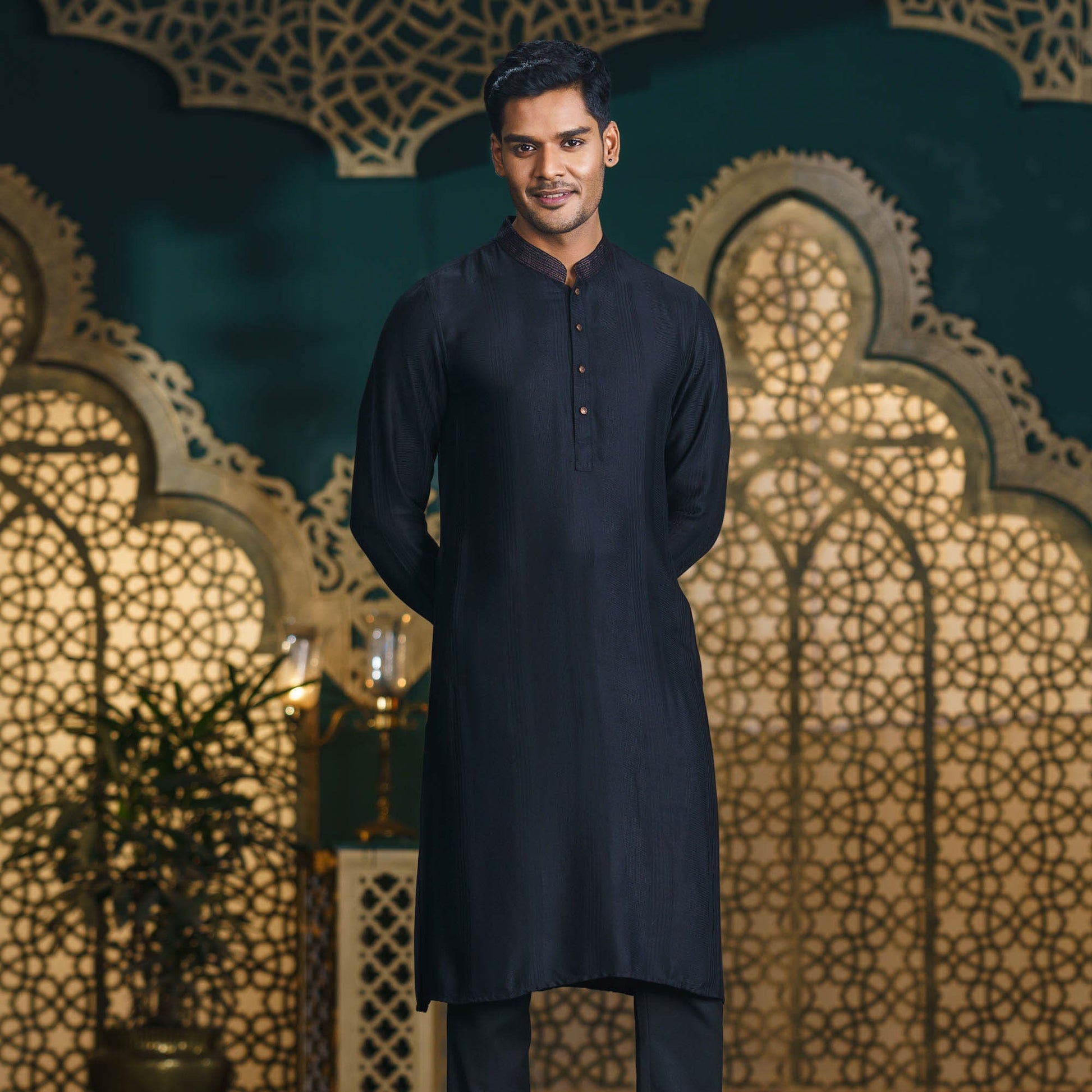 This men’s black basic panjabi features a collar embellished with stitching details and metal shank buttons, crafted from luxurious cotton silk. With a regular fit and available in panjabi size, it offers a refined and elegant choice for traditional wear.