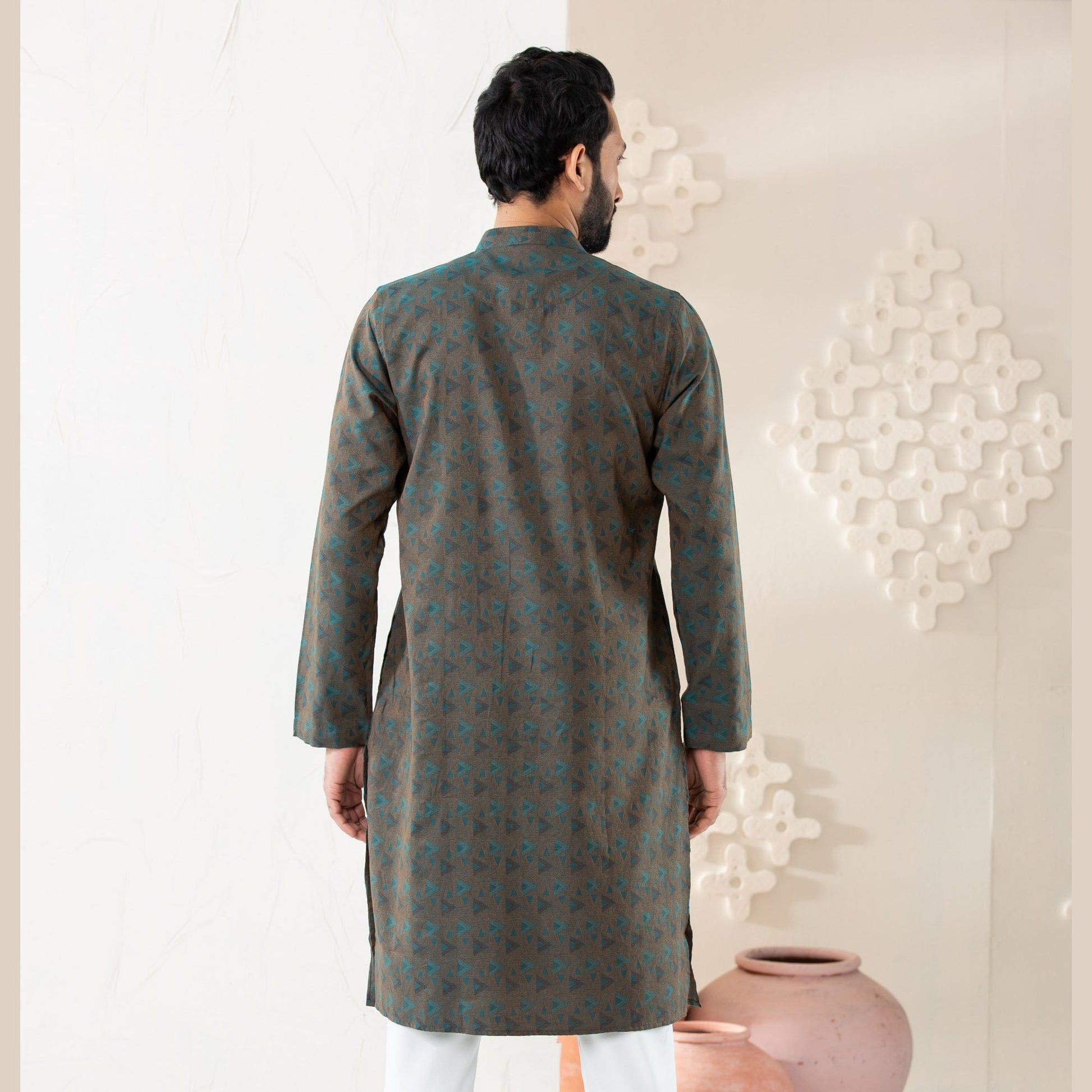 This Men's Chocolate Check Panjabi features metal shank buttons and a stylish jacquard fabric with a printed check design. With a regular fit, it combines comfort with a modern look. The rich chocolate color and distinctive check pattern make it perfect for both festive occasions and everyday wear.
