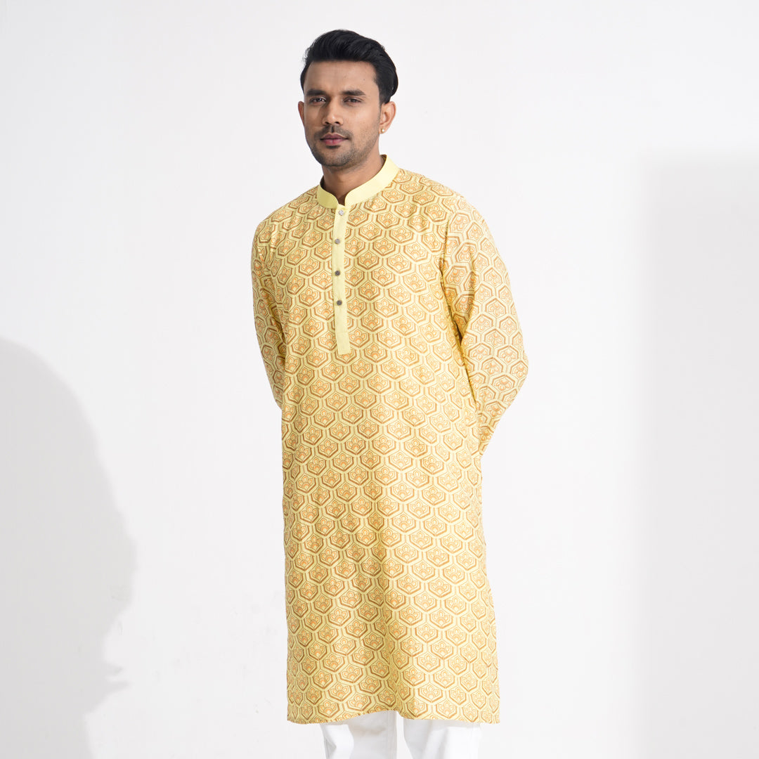 This yellow men's Panjabi features a stylish screen print, combining tradition with modern design. Crafted from crape cotton, it offers both comfort and durability, while the slim fit adds a polished look. Ideal for festive occasions, this Panjabi provides a refined yet relaxed style.