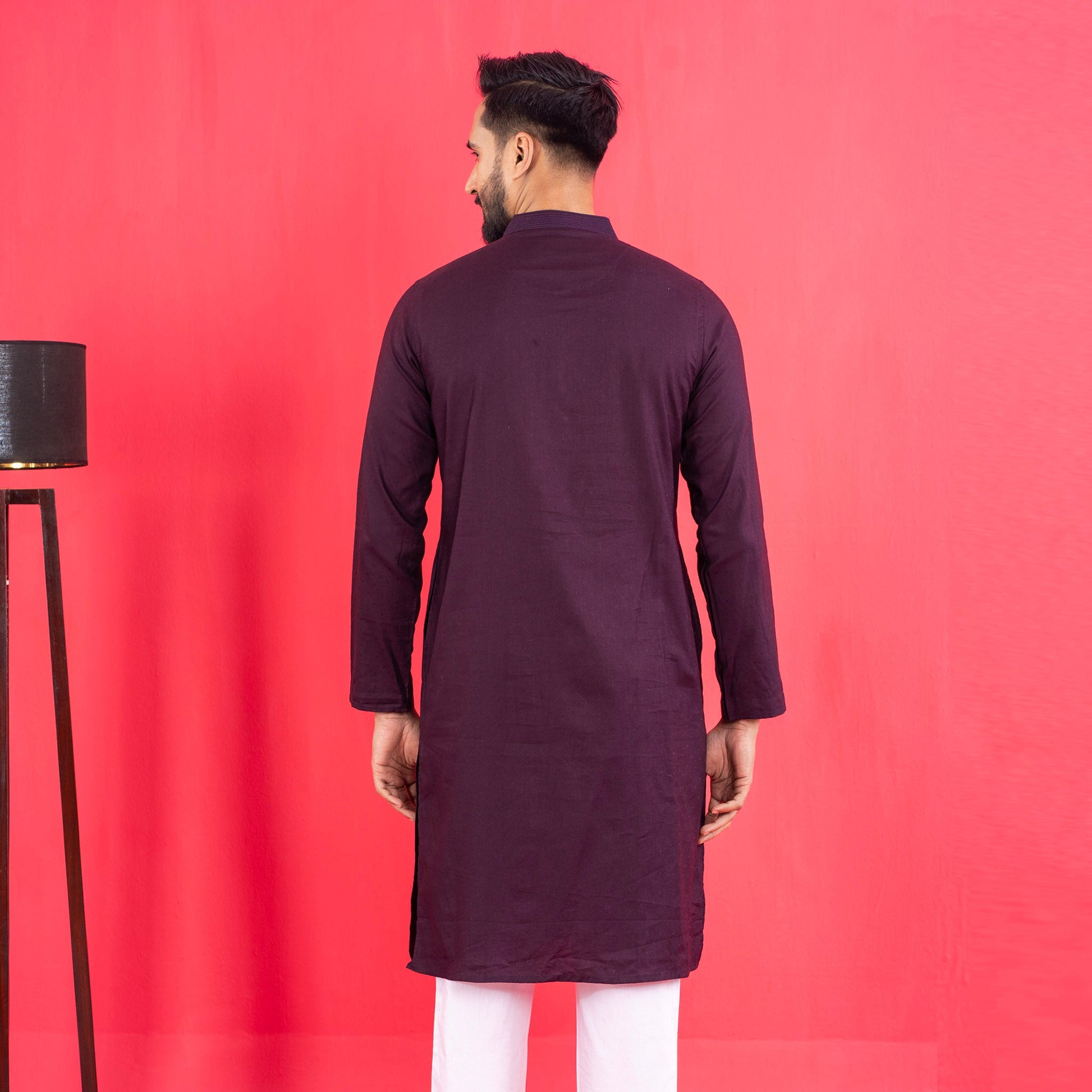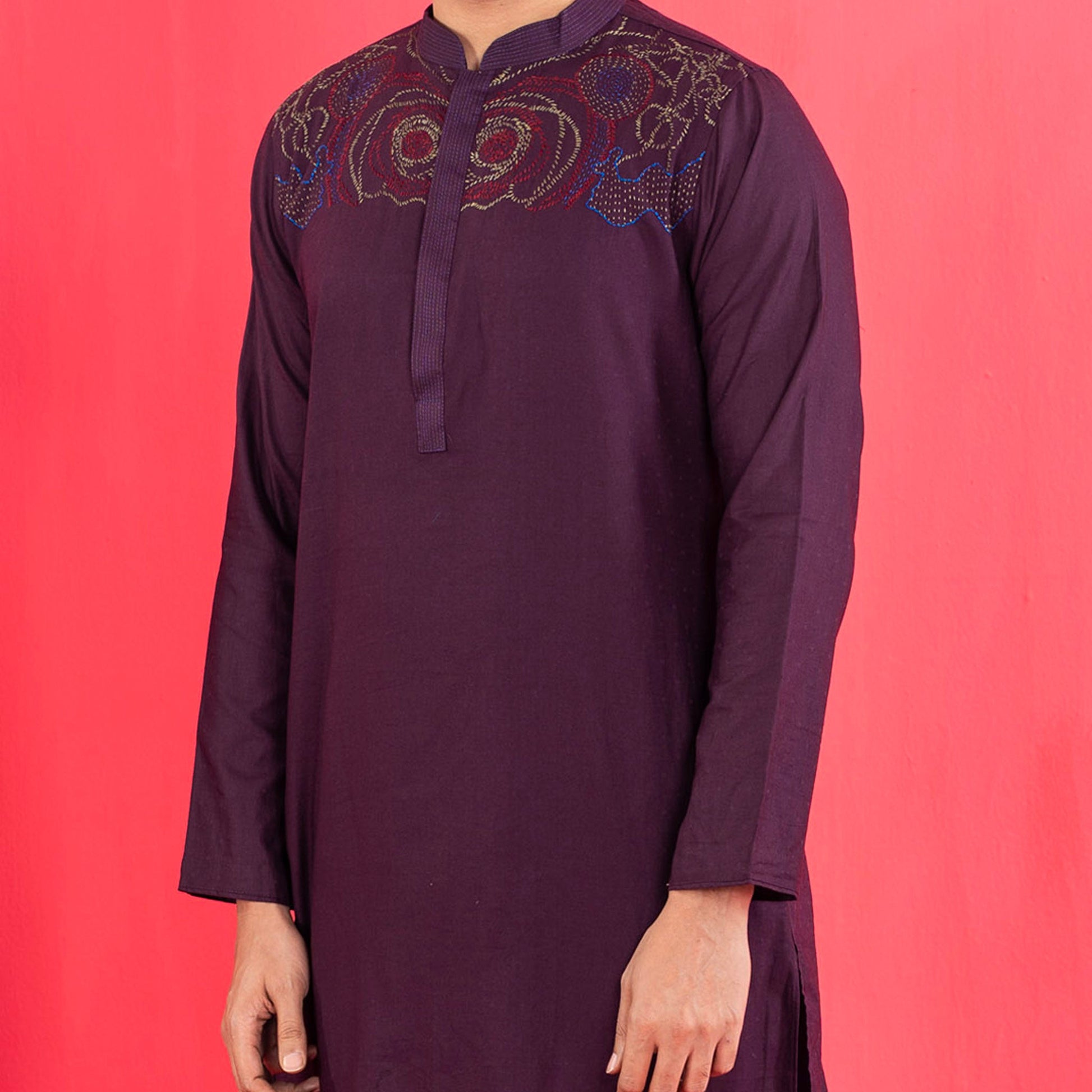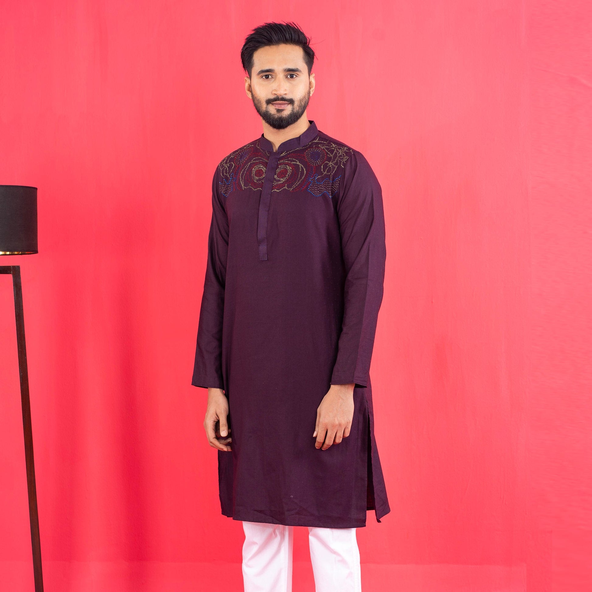 Elevate your traditional attire with this men's Byzantine Panjabi. Featuring half-body embroidery and metal buttons, it is crafted from a poly-cotton blend for a comfortable regular fit. Ideal for cultural events and special occasions, this panjabi combines rich color with intricate detailing for a sophisticated look.