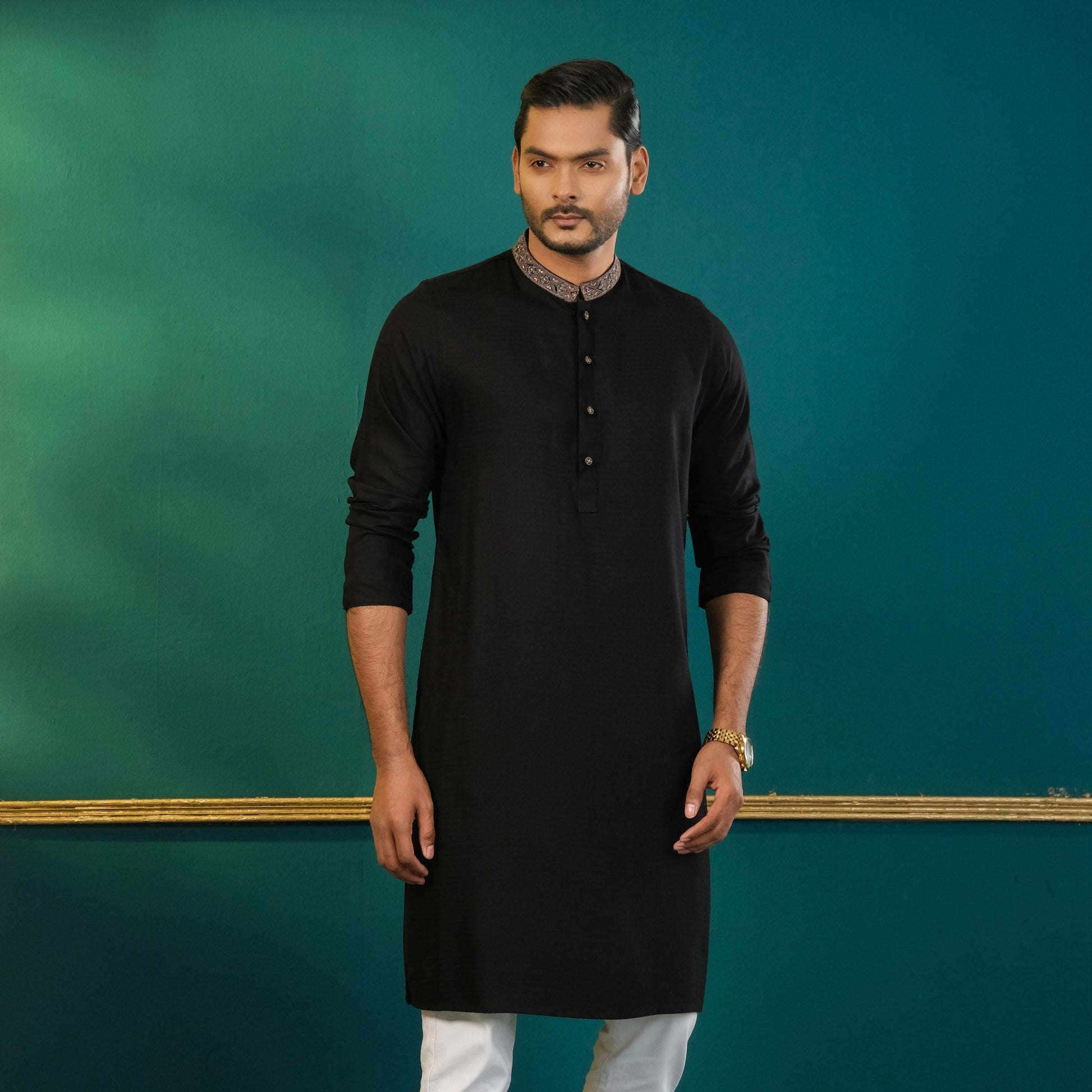 Crafted from a soft cotton-blended fabric, this black Panjabi features intricate embroidery and a stylish mandarin collar. Designed for comfort with a regular fit, it’s ideal for both festive gatherings and cultural events. Enhance your ethnic wardrobe with this elegant and versatile piece.
