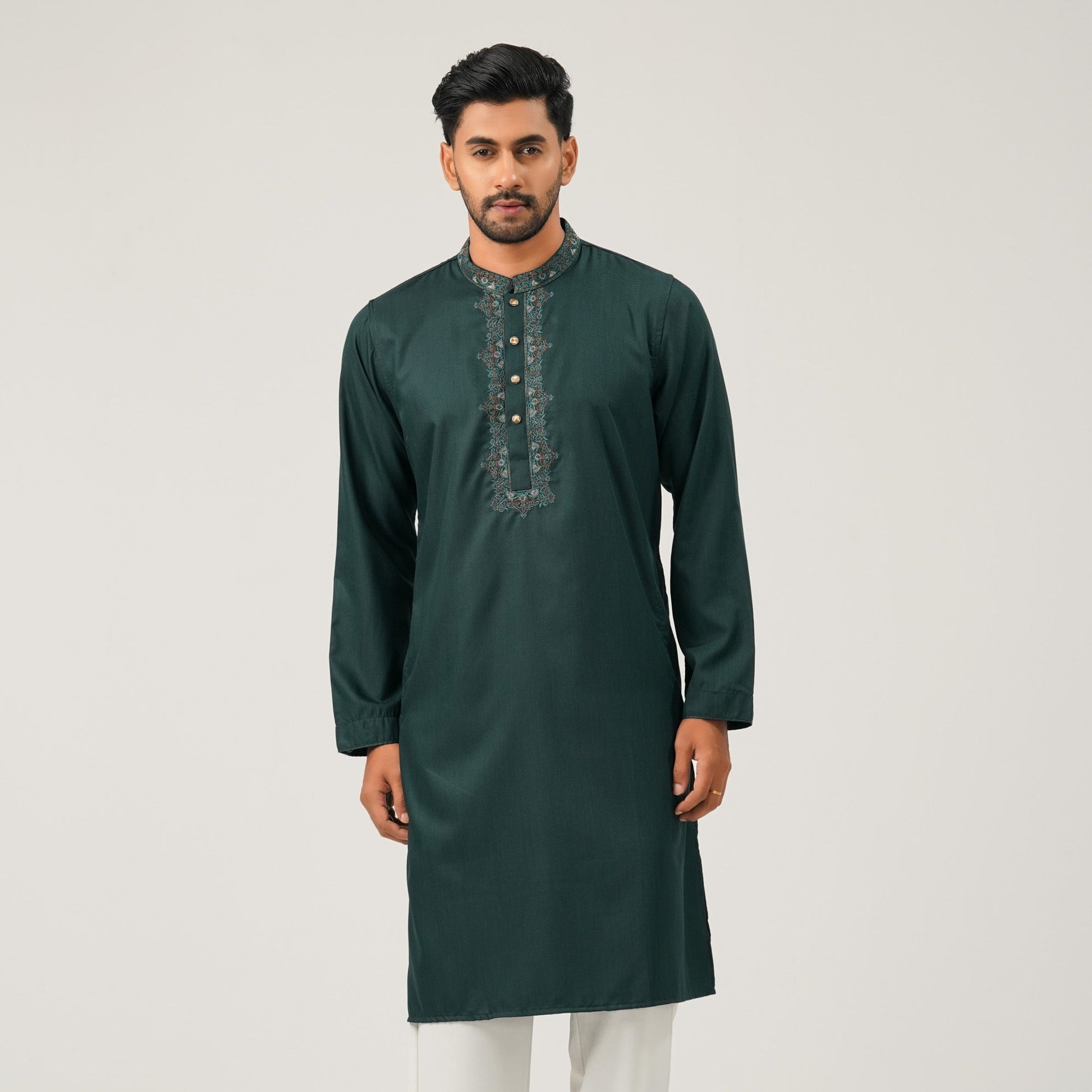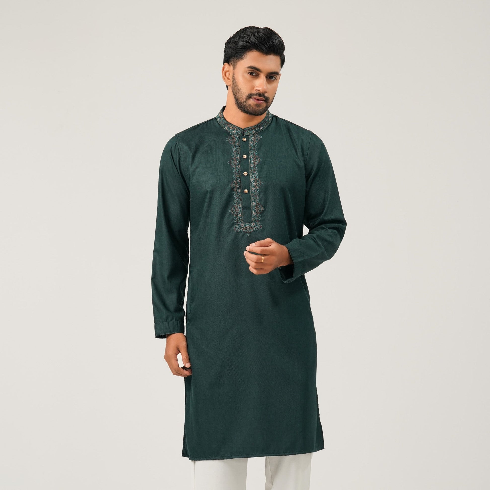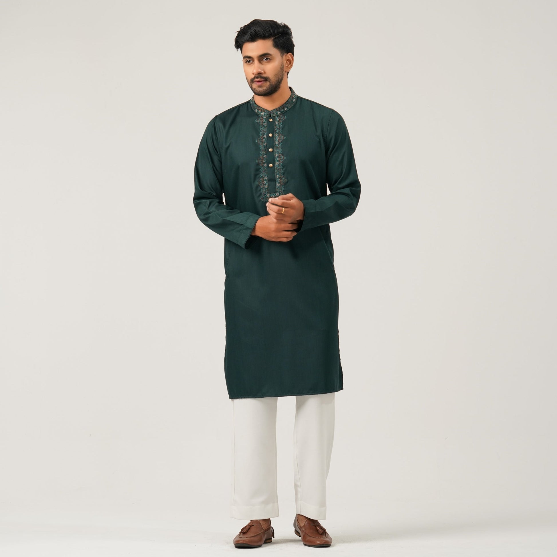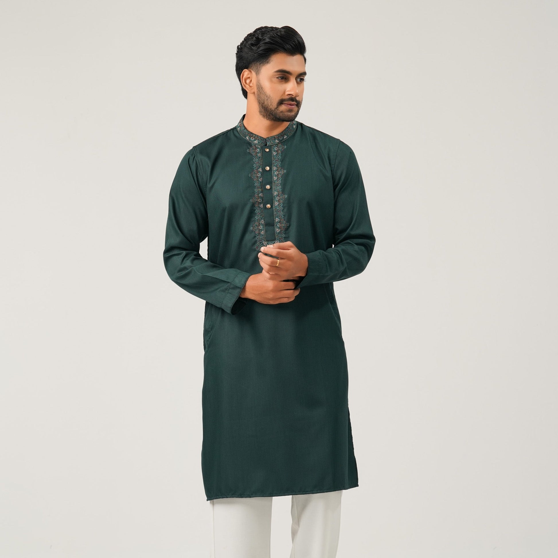 Elegant mens Panjabi made from luxurious bamboo silk fabric. Features fine embroidery work and a touch of sophistication with metal buttons. Perfect for festive and formal occasions. Comfortable with a smooth, premium finish.