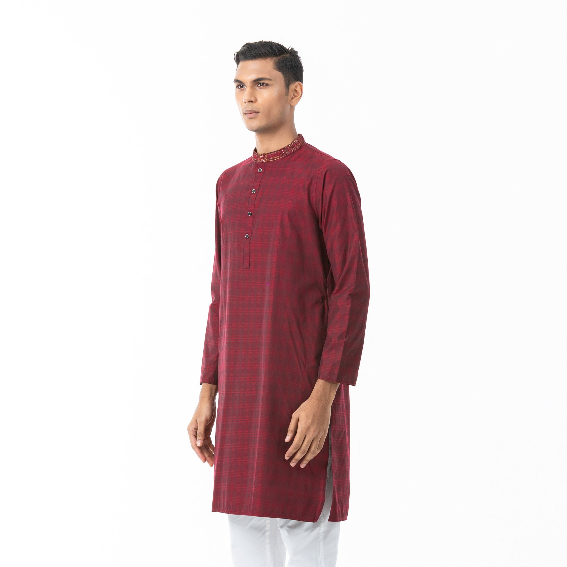 This maroon karchupi panjabi, crafted from rich silk jacquard fabric, features decorative metal buttons for an elegant touch. The regular fit ensures comfort, making it ideal for traditional and festive occasions. Its sophisticated design and luxurious fabric make it a standout choice for celebrating cultural events.