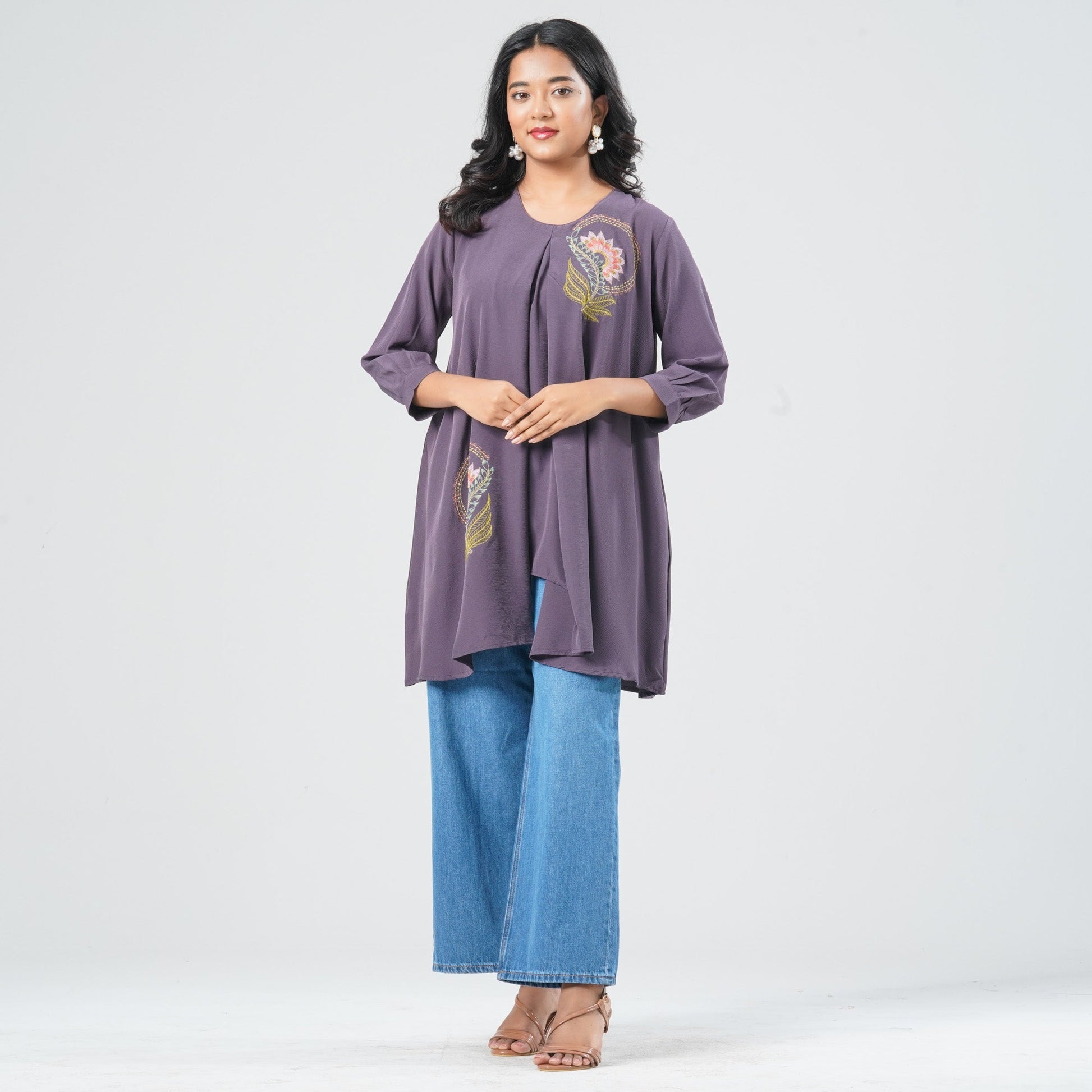 This women’s ethnic tunic is crafted from smooth blended silk fabric for a refined and comfortable feel. Designed in a straight-fit silhouette, it features an elegant shawl collar that adds a modern ethnic touch. The tunic is enhanced with eye-catching digital prints, making it stylish yet versatile. Decorative run stitch detailing completes the look, perfect for casual to semi-formal wear.