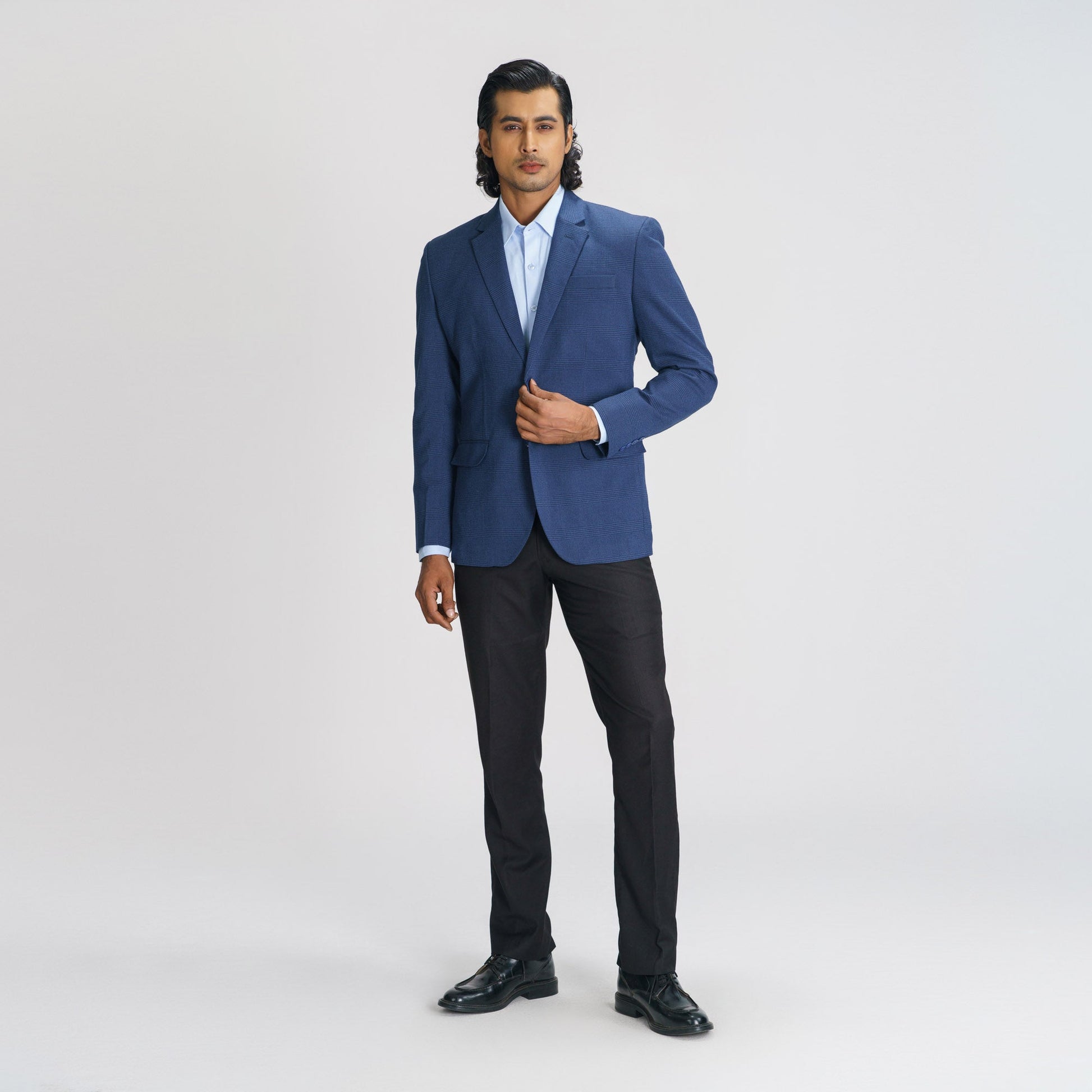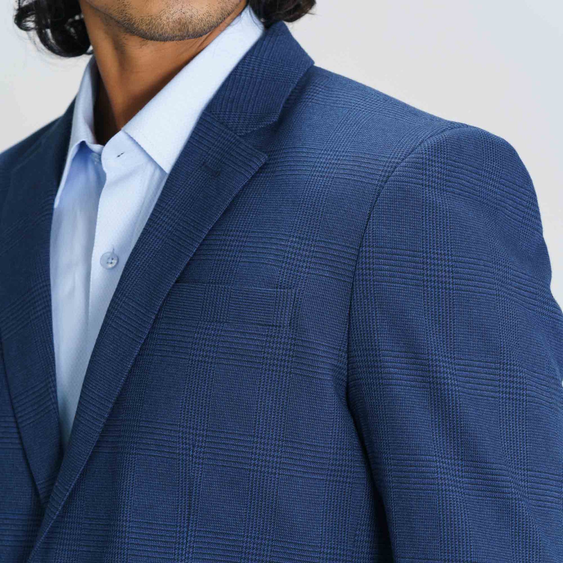 This stylish blue blazer features a sleek slim fit with two front buttons and a double back vent for comfortable movement. Made from a cotton blend, it offers a lightweight and versatile option, ideal for casual layering or semi-formal occasions. A perfect balance of style and ease.