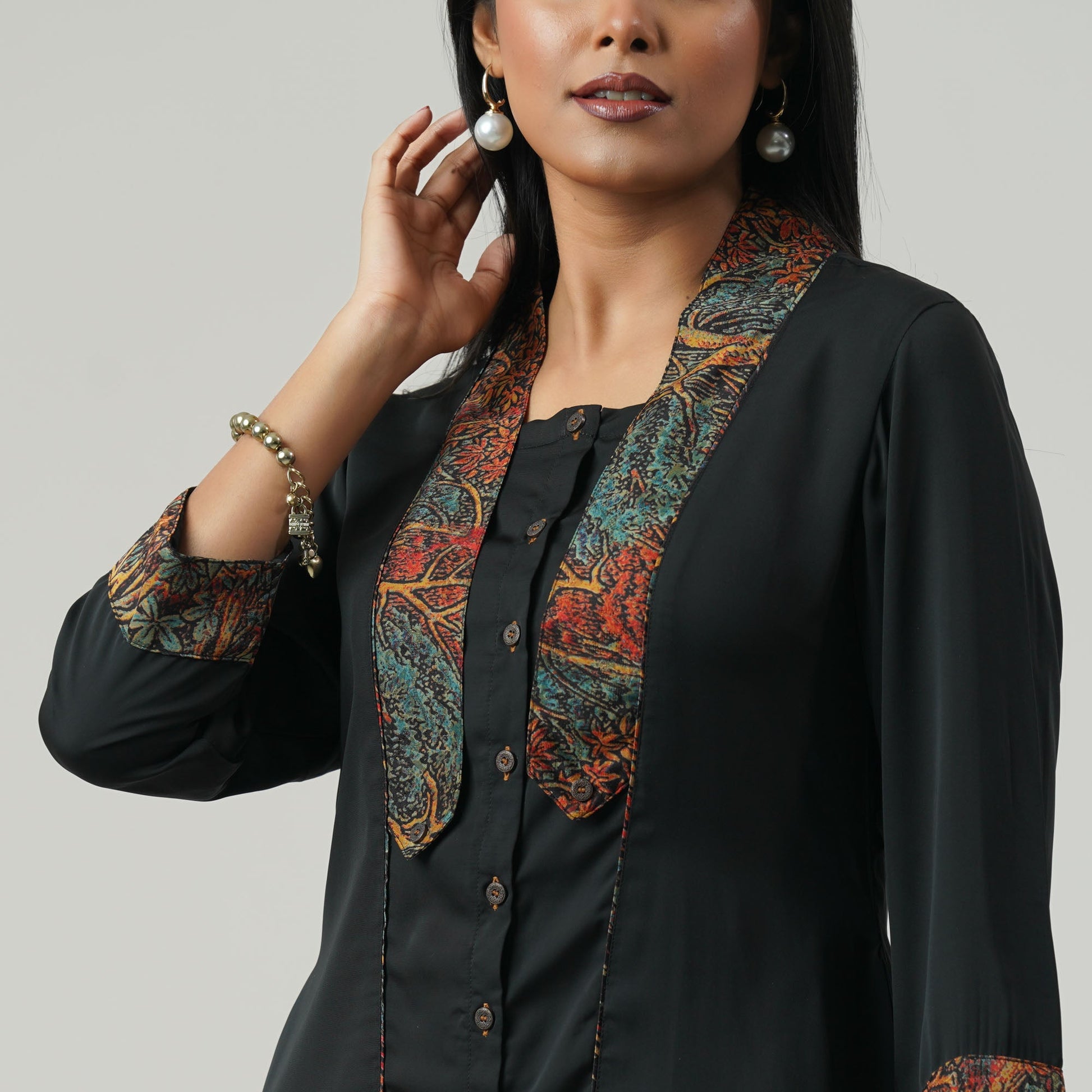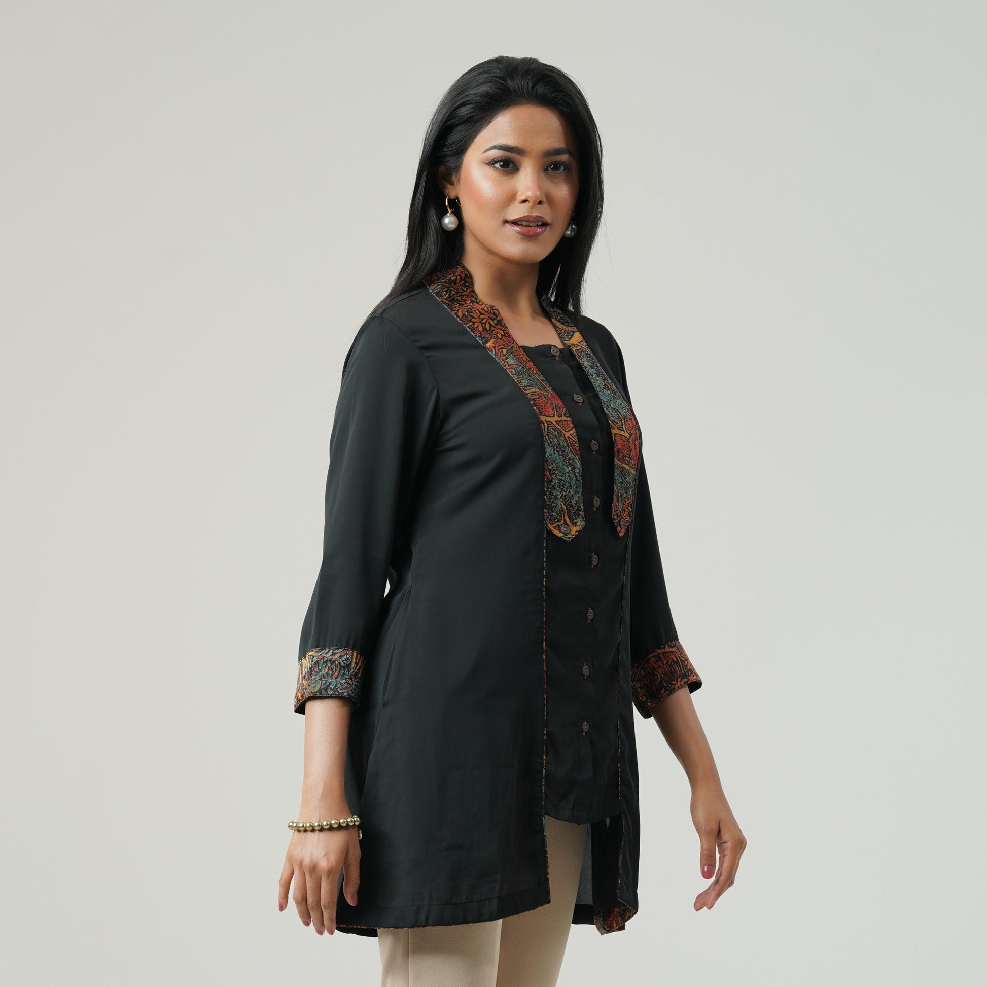This elegant ethnic shrug is crafted from a georgette fabric Perfect for layering over festive or casual outfits, it adds a touch of sophistication and cultural charm. Ideal for special occasions and celebrations.