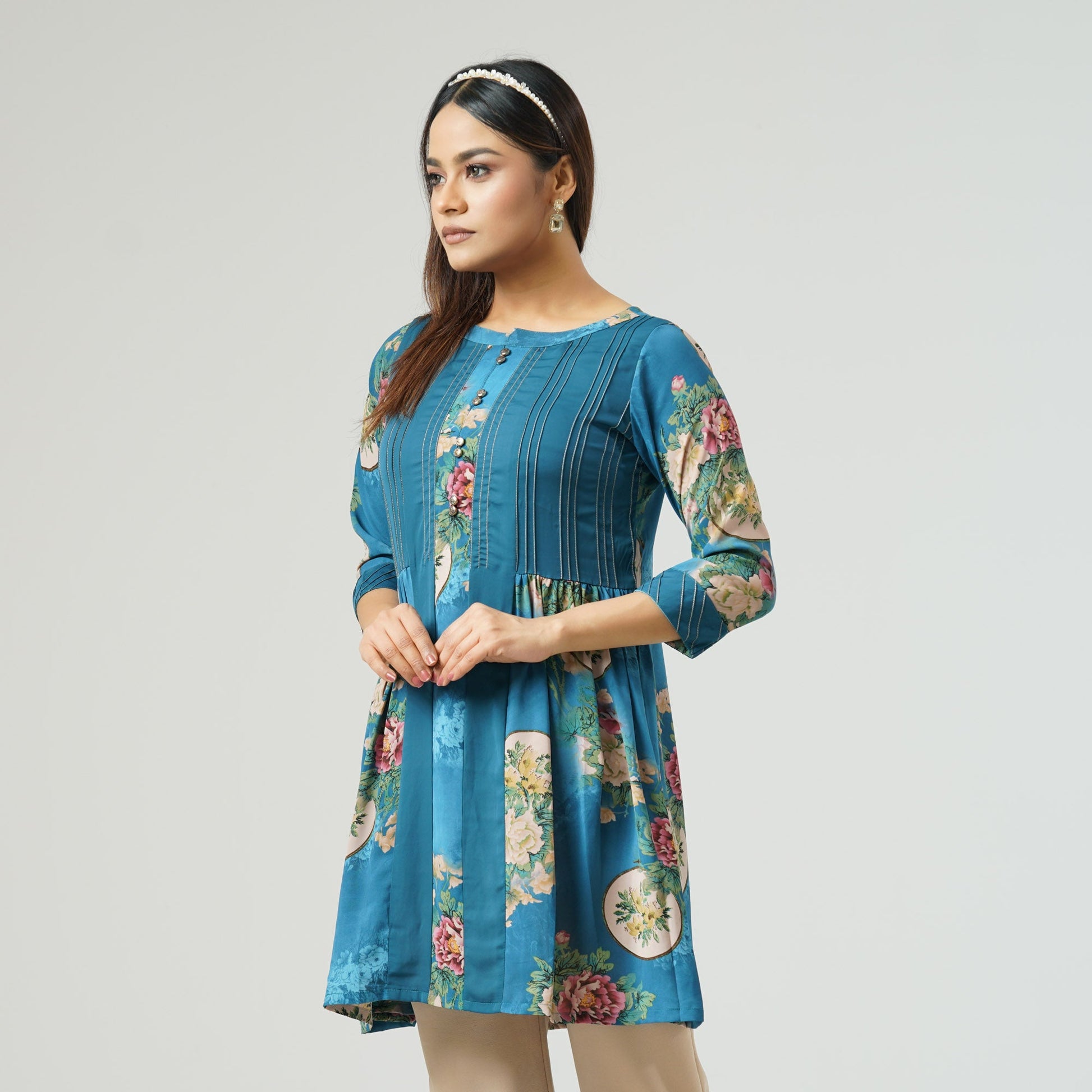 This stylish tunic features a vibrant digital print on luxurious Samo silk fabric, enhanced with elegant satin side contrast detailing. The smooth and lightweight texture ensures a comfortable yet sophisticated look, perfect for both casual and festive occasions. Elevate your wardrobe with this effortlessly chic piece.