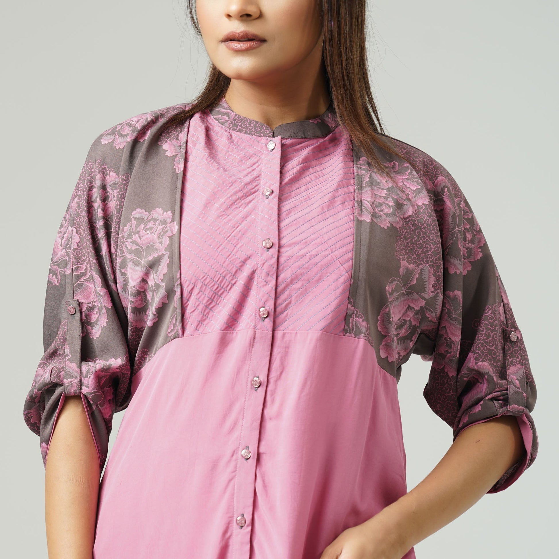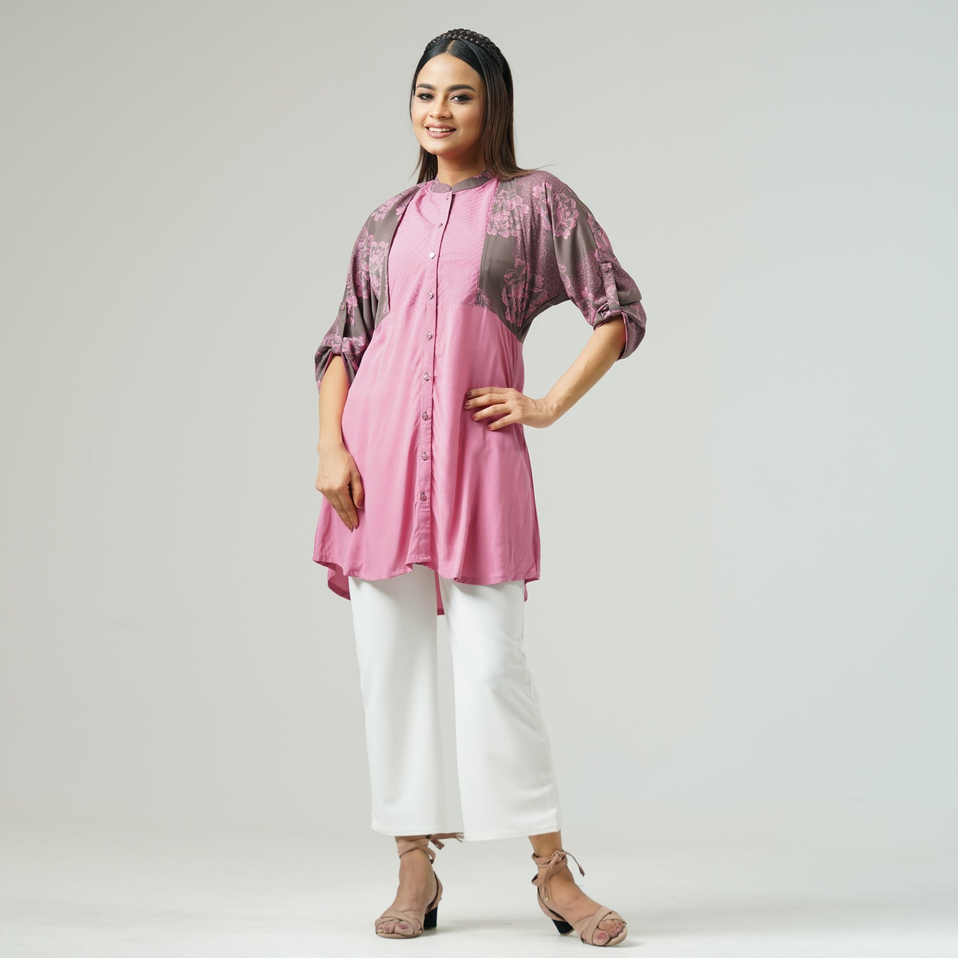 This stylish tunic features a vibrant digital print on luxurious Samo silk fabric, enhanced with elegant satin side contrast detailing. The smooth and lightweight texture ensures a comfortable yet sophisticated look, perfect for both casual and festive occasions. Elevate your wardrobe with this effortlessly chic piece.