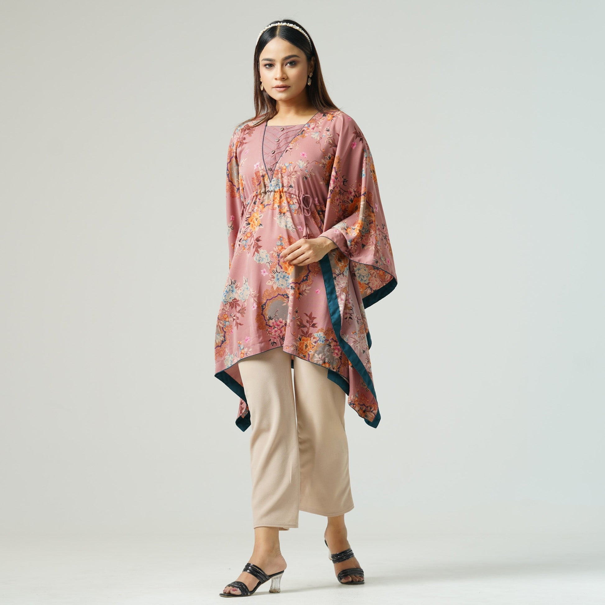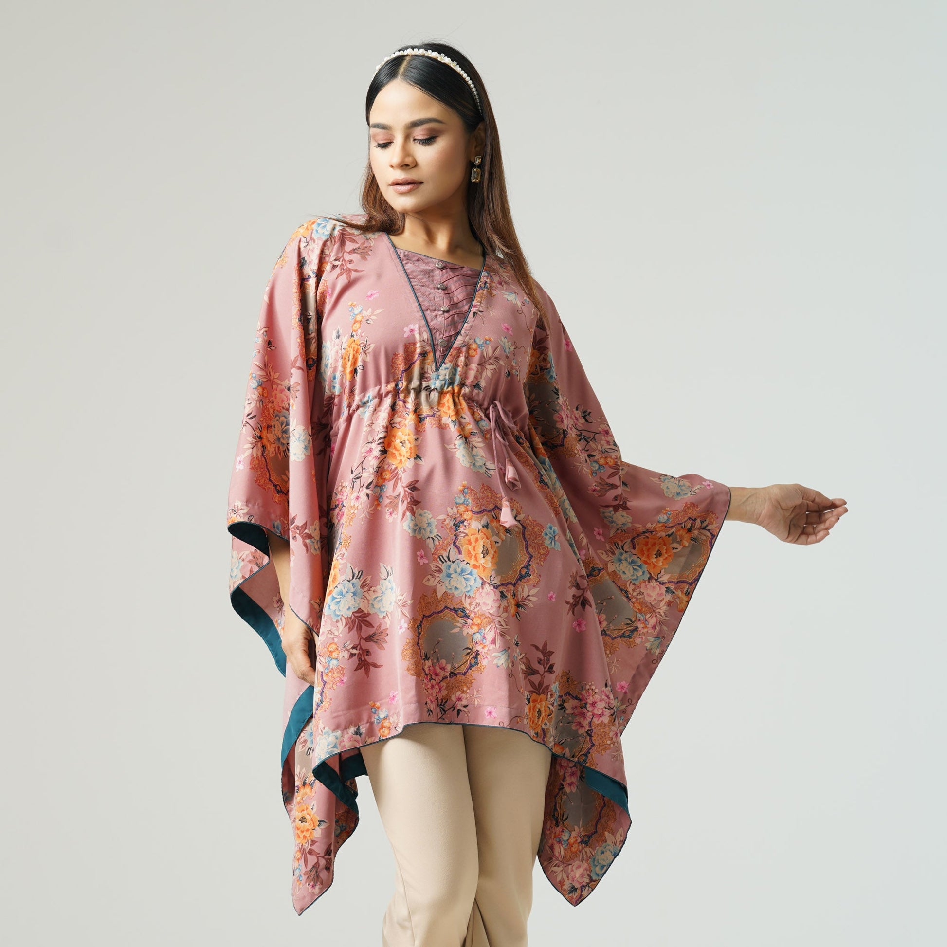 This stylish tunic features a vibrant digital print on luxurious Samo silk fabric, enhanced with elegant satin side contrast detailing. The smooth and lightweight texture ensures a comfortable yet sophisticated look, perfect for both casual and festive occasions. Elevate your wardrobe with this effortlessly chic piece.