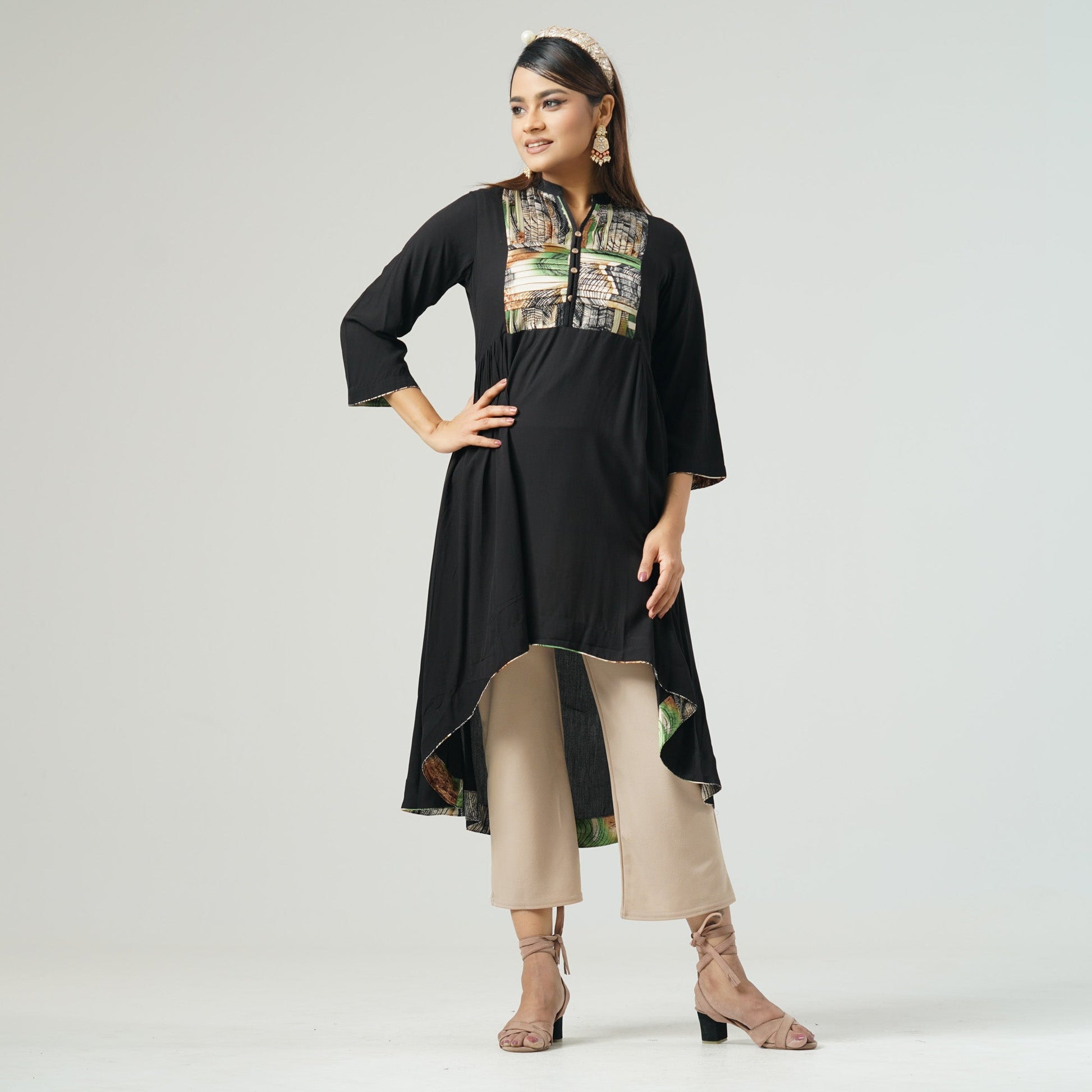 This elegant black kurti is crafted from a comfortable blended fabric, featuring intricate neck work with multicolor printed fabric. Designed in a regular fit, it blends traditional charm with modern style, making it perfect for festive and casual wear.
