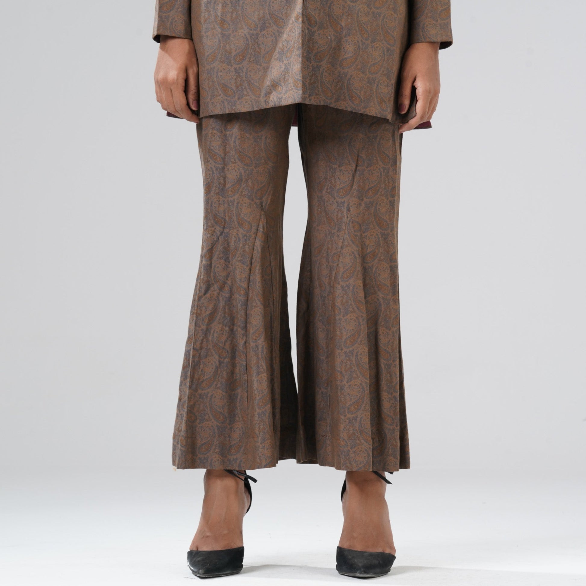 Grace your festive moments with this stunning womens brown ethnic two piece set, featuring a jacquard full-sleeve jacket paired with bell-bottom pants. Designed in a regular fit, the outfit is embellished with intricate zari embroidery detailing, offering a perfect blend of elegance and tradition.