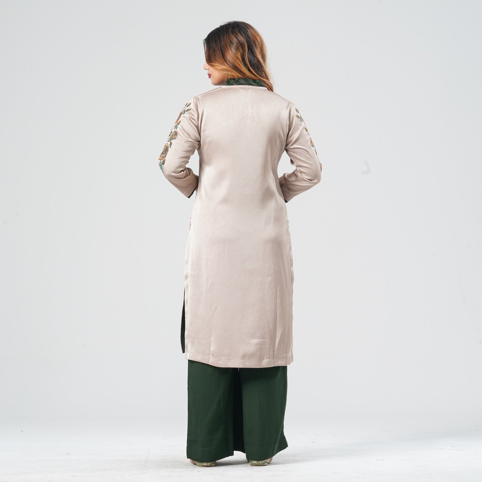 This women’s beige ethnic two-piece set includes a shawl collar pleated Kurti paired with a stylish bell-shaped pant. The design is enhanced with delicate sequin embroidery, run stitch detailing, and contrast piping for a refined look. Crafted from silk fabric on the top and blended silk on the pant, it ensures a graceful drape and comfortable wear. A perfect choice for festive events and elegant day occasions.