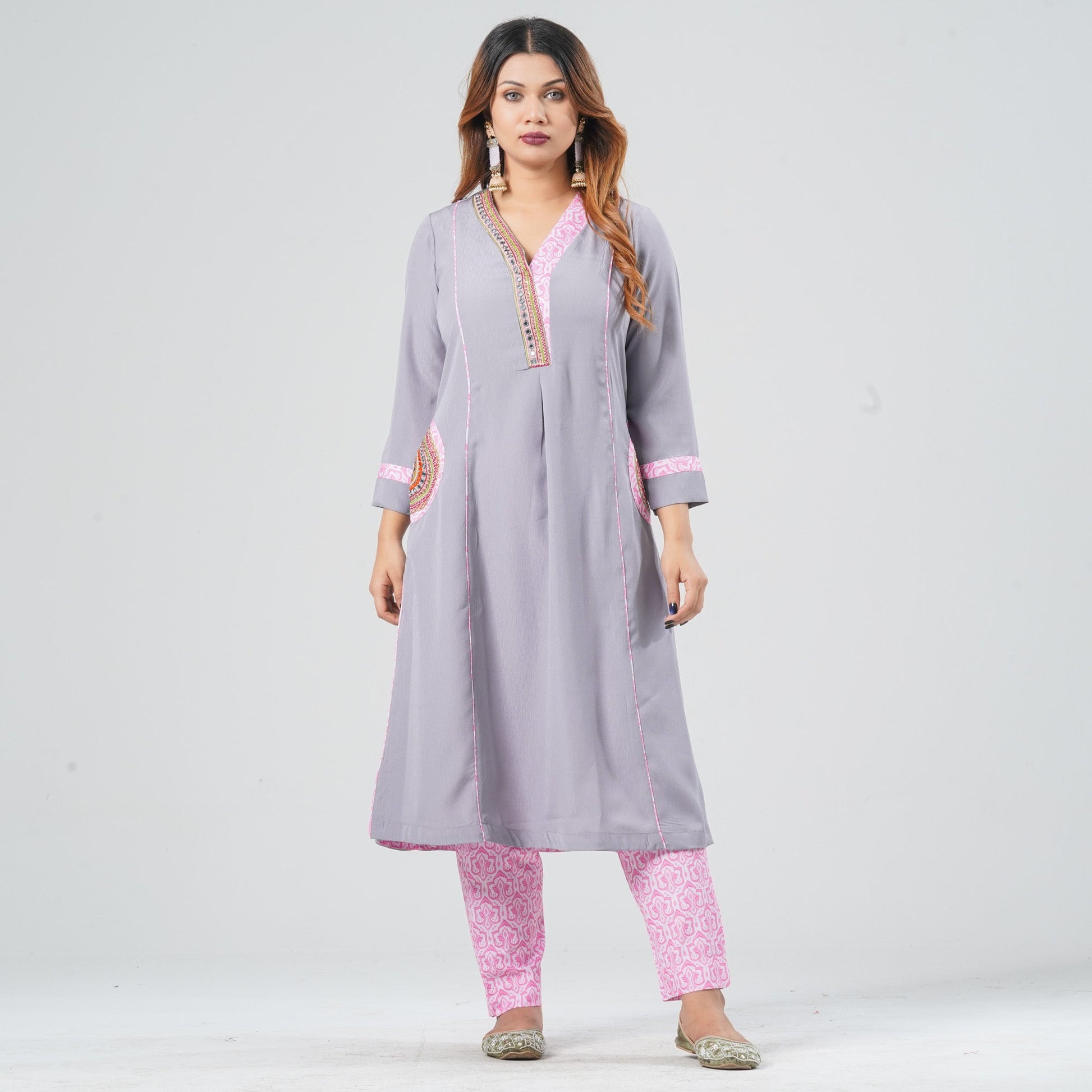 This women’s two-piece ethnic set features a graceful A-line kameez paired with a straight-cut pant. Crafted from crinkle georgette, the solid kameez is enhanced with contrast digital printed patches and intricate karchupi work on the collar and pocket. The blended cotton pant adds comfort and breathability for all-day wear. Designed in a regular fit, it’s perfect for festive, casual, and semi-formal occasions.