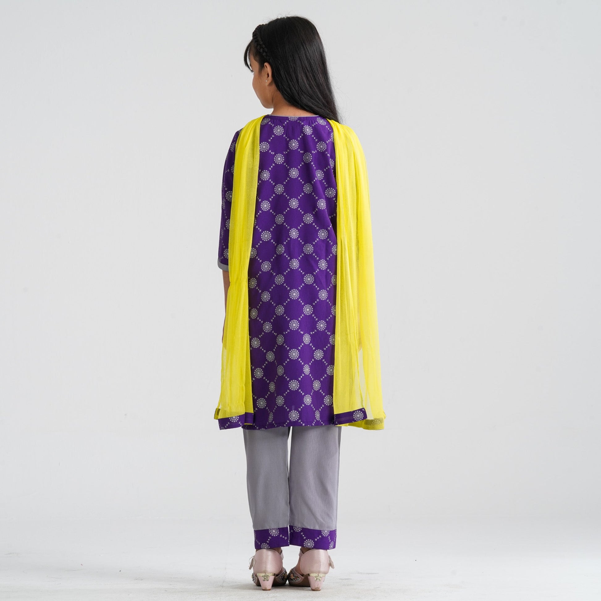 This girl’s purple three piece set features a round neck basic pattern kameez paired with a straight cut pant for a classic ethnic look. Crafted from slub georgette fabric, it offers a graceful drape and lightweight comfort. The outfit is completed with a soft chiffon dupatta for an elegant finish. Perfect for festive occasions, weddings, and cultural celebrations.