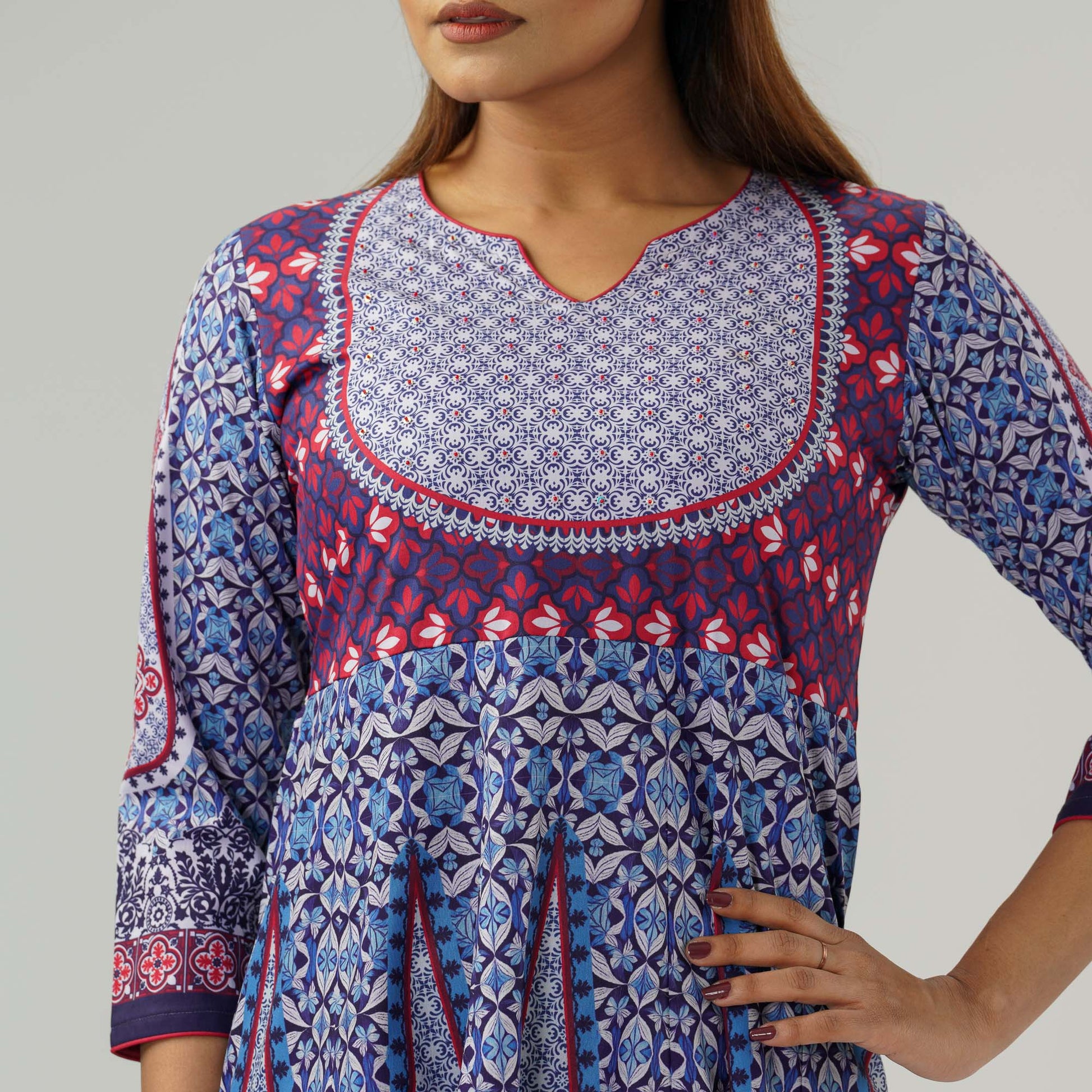 This elegant three piece set is designed for any celebrations. The kalidar kameez is crafted from digitally printed blended cotton, offering a graceful and airy feel. Paired with a solid-colored pant and a beautifully printed georgette orna, this set blends tradition with modern elegance, making it a perfect festive outfit.