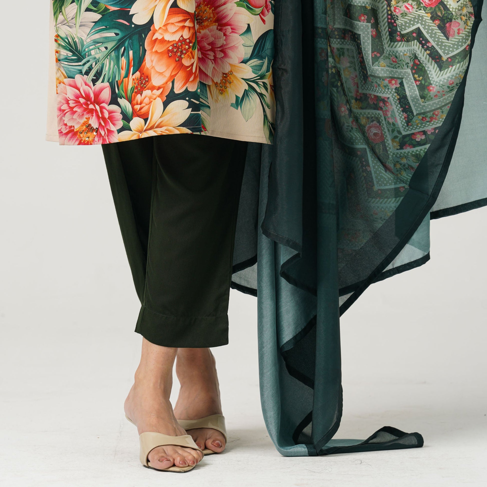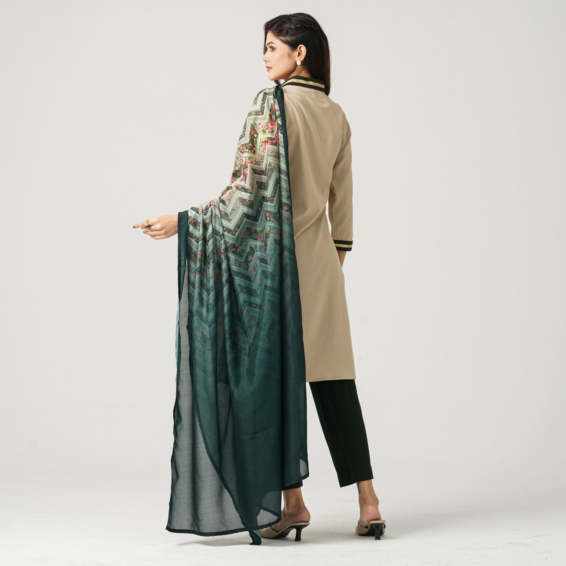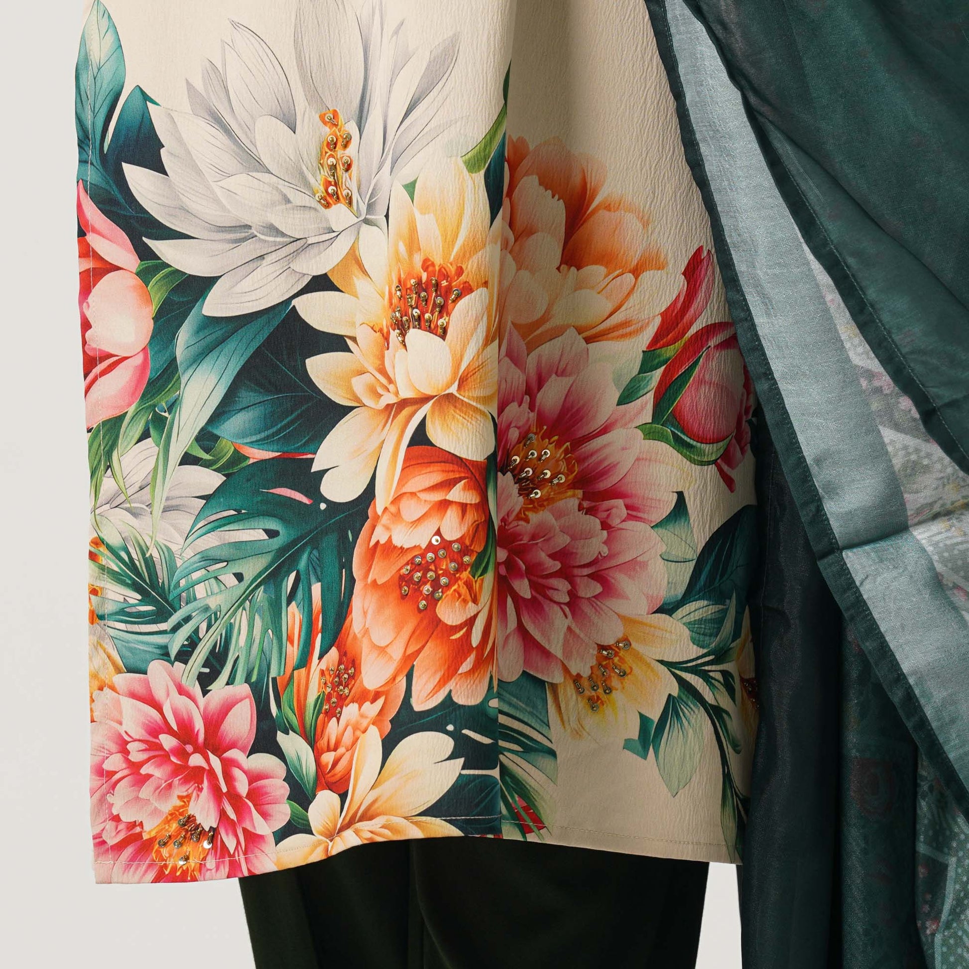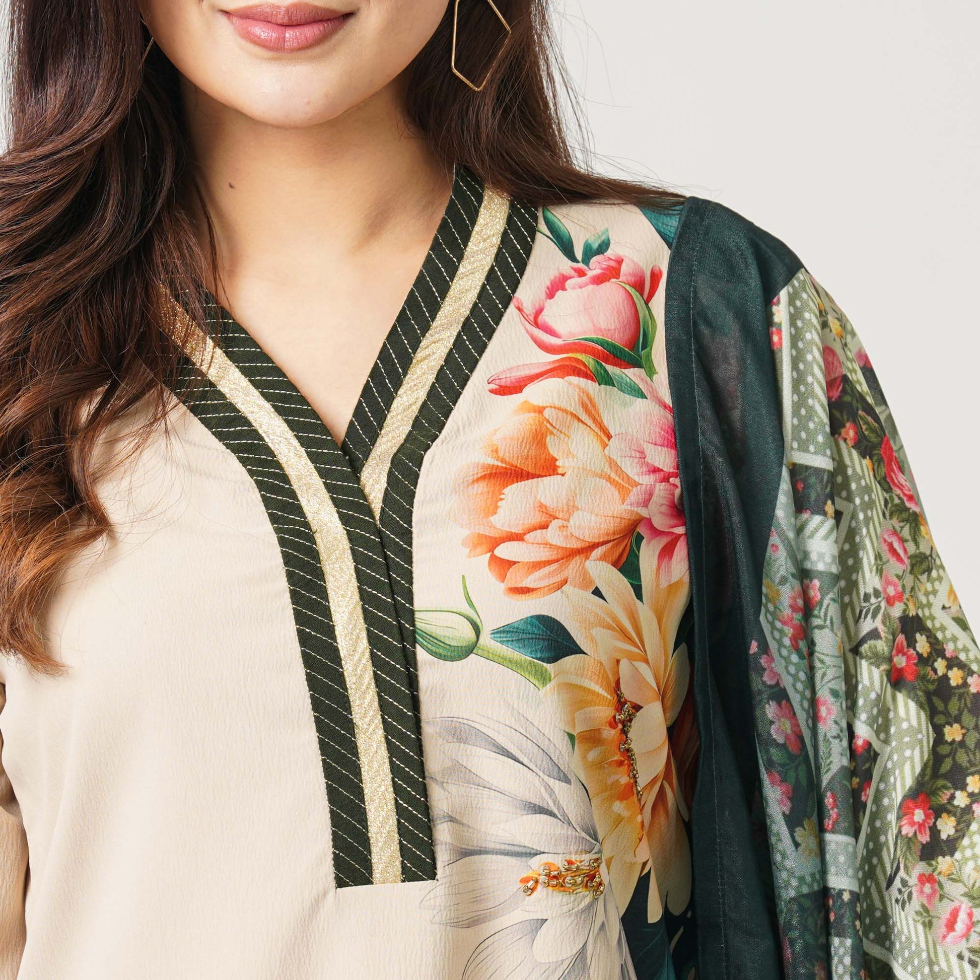 Elegant beige three-piece set with a straight-cut top and matching pant. The front features placement digital prints with subtle sequin work on the yoke and body. Designed with contrast fabric detailing on the neckline and sleeve openings. Paired with a digitally printed zari georgette orna. Crafted from premium mixed georgette, suitable for festive wear, family gatherings, and elegant casual occasions.