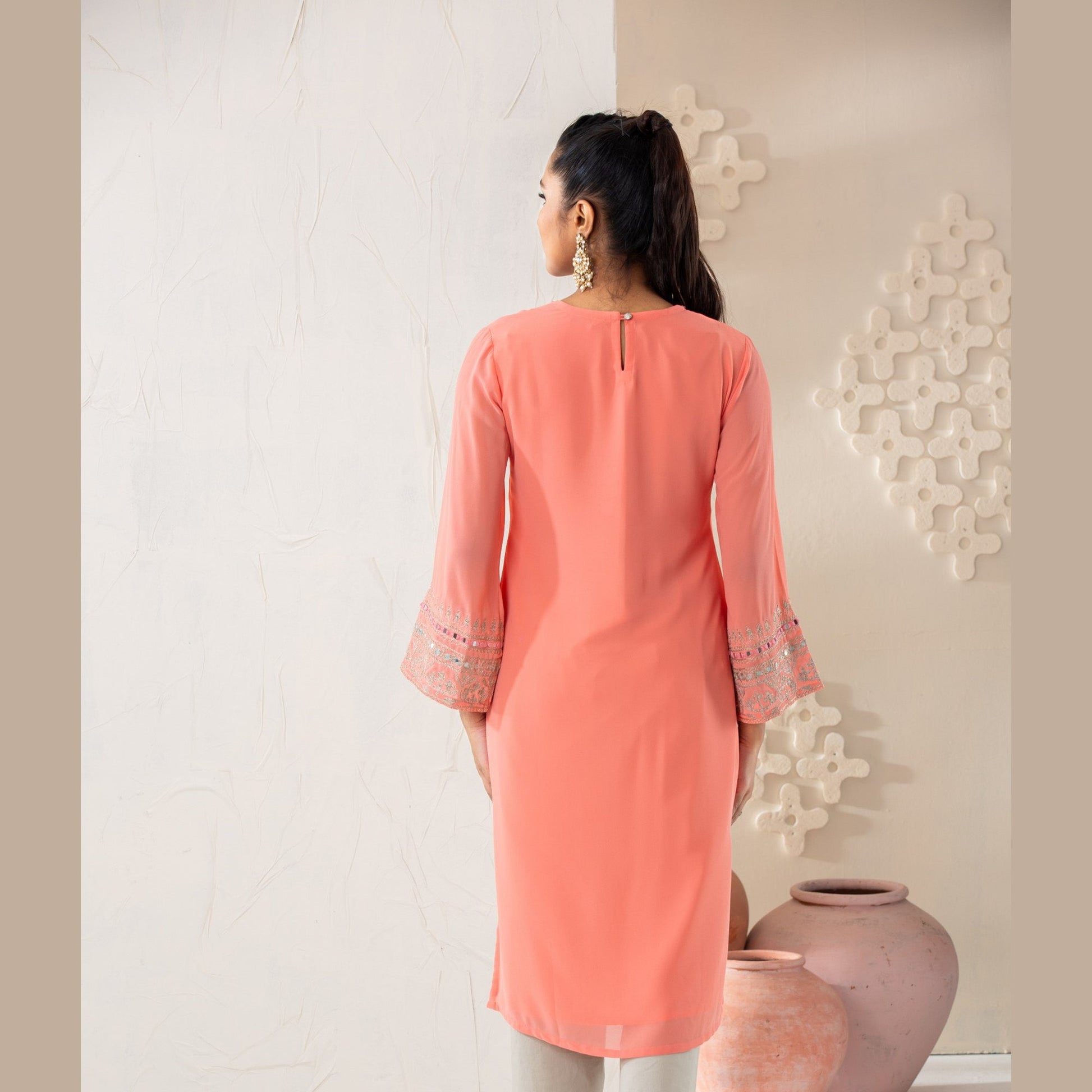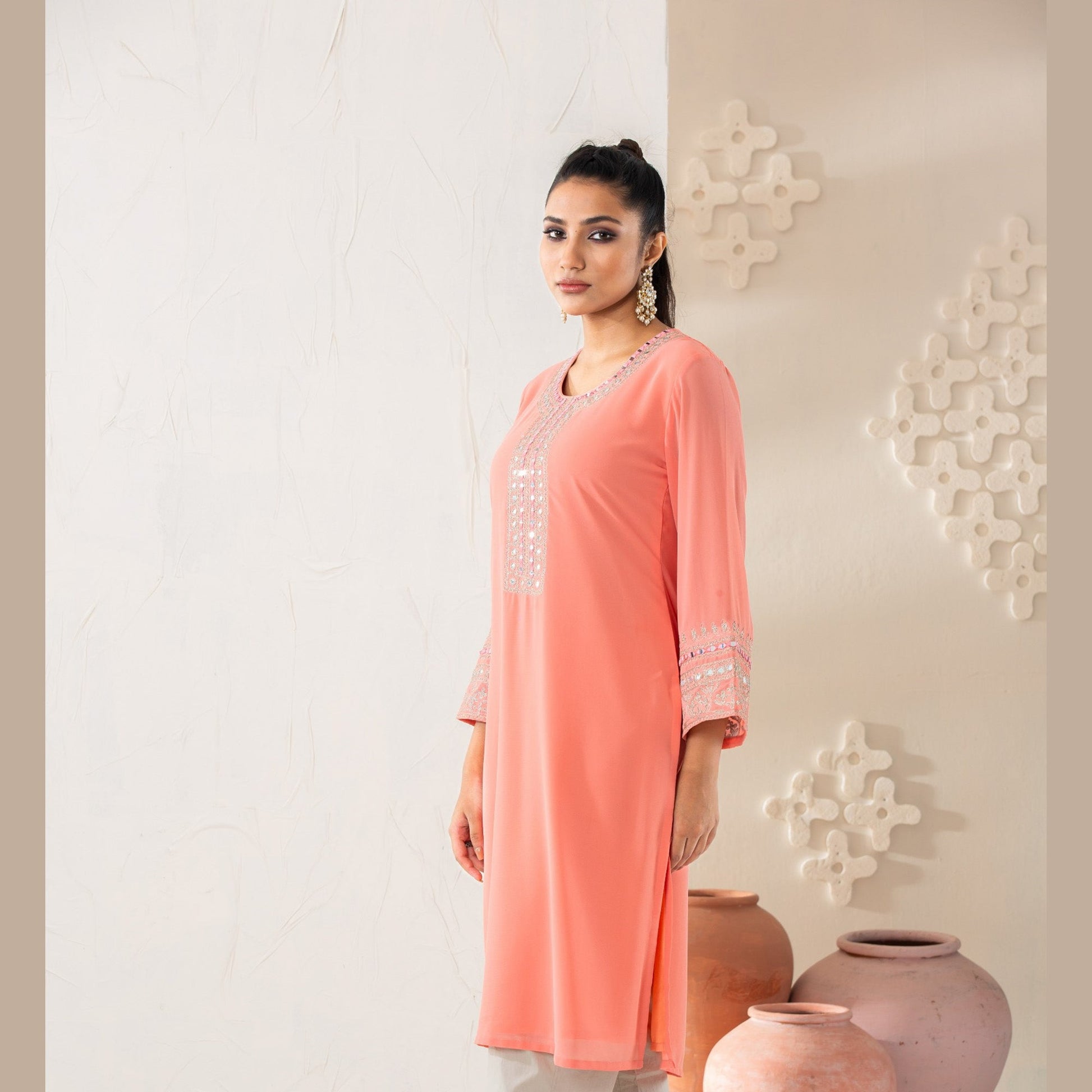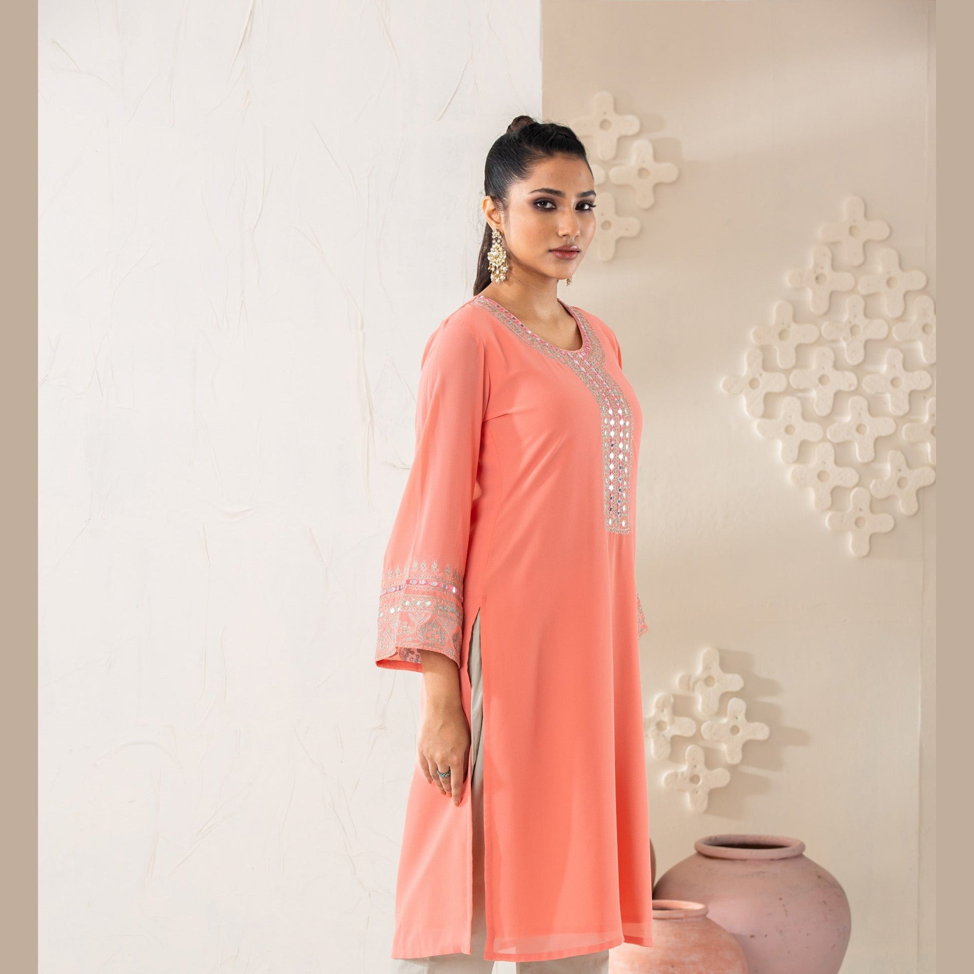 Step into elegance with this peach ethnic kurti, showcasing a refined solid design adorned with exquisite embroidery work. Crafted from airy georgette, it offers a flattering regular fit that flows gracefully with every movement. Perfect for both casual outings and festive gatherings, this kurti effortlessly blends comfort and style, making it a must-have addition to your wardrobe.