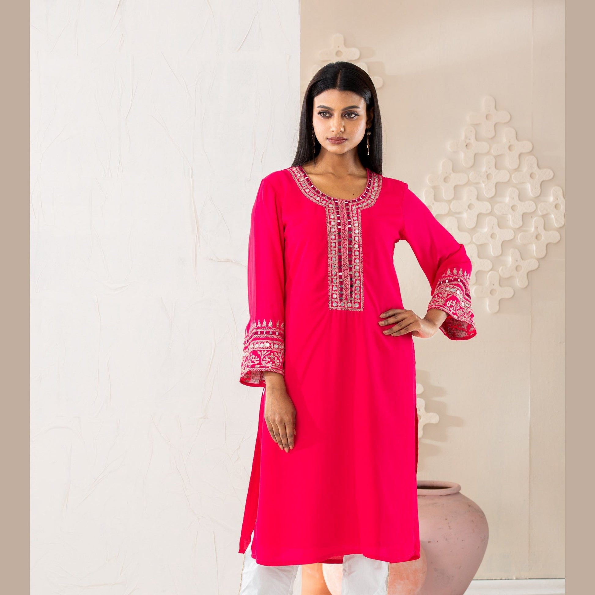 Introducing our Ethnic High Range Kurty in Pink. Made from luxurious georgette and adorned with beautiful embroidery on the yoke and print on the hem, this kurti exudes elegance and sophistication. The buttersilk lining and bell sleeves add to its luxurious appeal. Elevate your wardrobe with this exclusive piece.