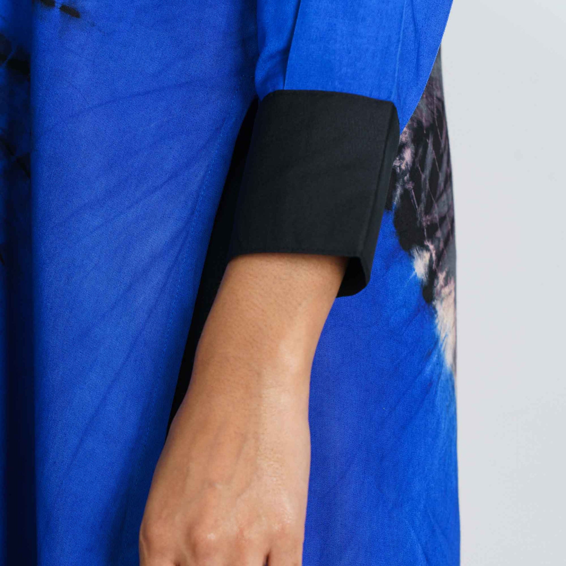 Add a fusion touch to your wardrobe with this women's blue tie-dye kurti. Styled in a classic shirt pattern and crafted from soft linen, this kurti offers a comfortable regular fit. Perfect for casual outings and cultural gatherings, it combines traditional style with a modern twist.