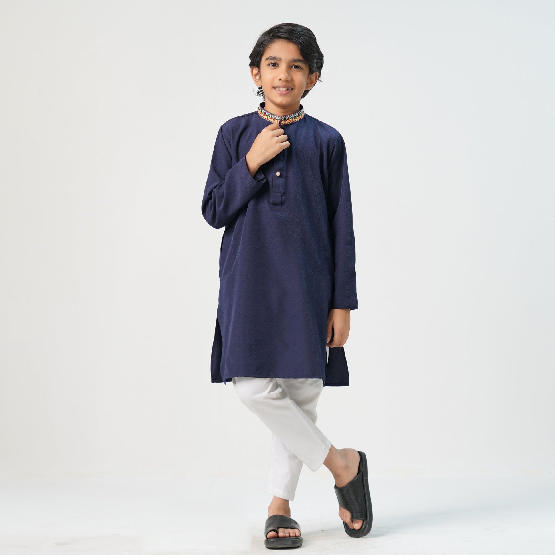 This classic boys panjabi is designed in a versatile navy shade, offering a timeless and elegant look. Made from blended fabric, it ensures comfort and durability. The regular fit and basic design make it perfect for festive occasions and casual wear.