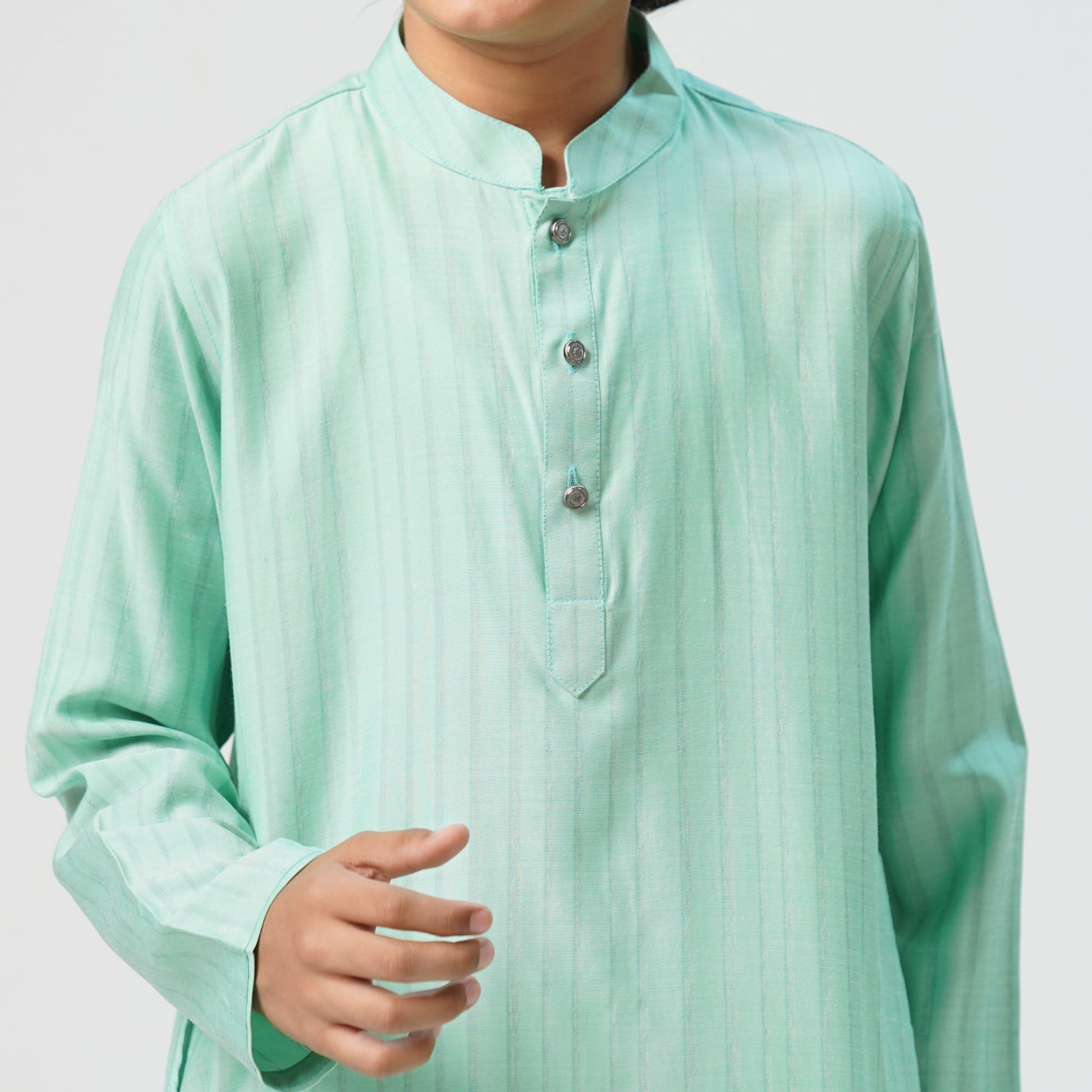 This classic boys Panjabi in pistachio green is designed with subtle chest stitching for a stylish touch. Made from cotton blended fabric, it ensures comfort and durability. Perfect for festive and casual occasions, this basic Panjabi adds a refined charm to any young wardrobe.